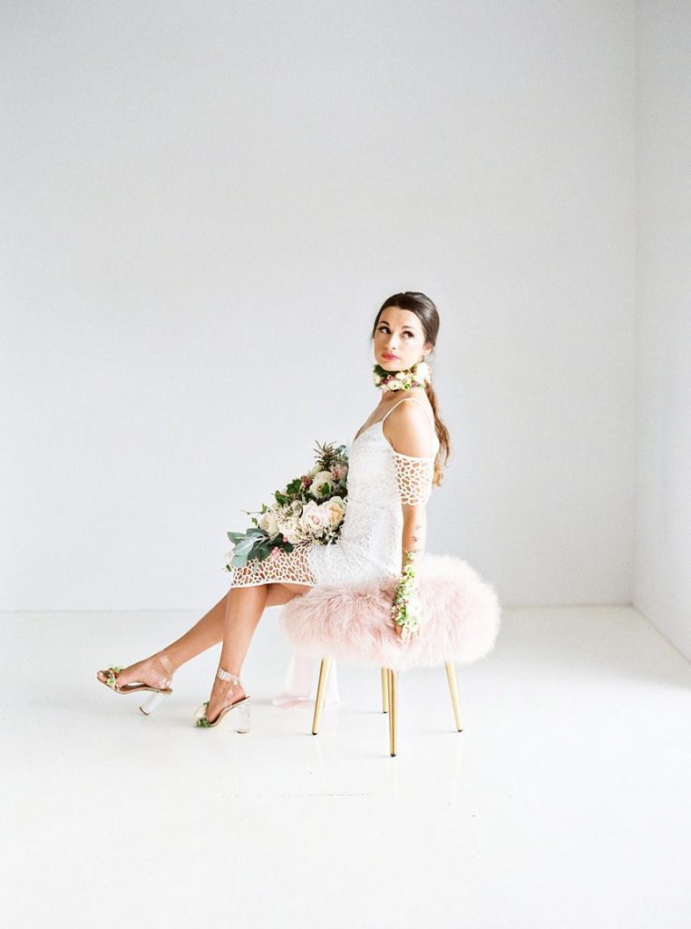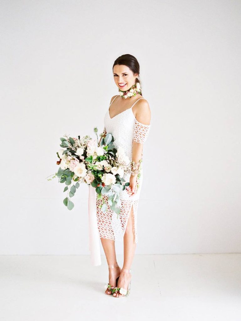 To tone down the sweetness to an otherwise girly and glamorous shoot, we’re loving the unique take on this edgy, styled shoot of bridal portraits captured by Awake Photography. The team behind floral studio Flower Vibes dreamed up a concept where softness subtly toughens up by way of limb-climbing blooms meant to resemble beautiful, blossoming flower tattoos. To bring this vision to life, the team first used a simple color palette of greens, whites and subtle infusions of pink to create a floral cuff that spanned from the model bride’s forearm to her finger to mimic trendy jewelry hand chains. The same blooms were trimmed down and wrapped around her neck in a choker-style arrangement. Coordinating arrangements filled with roses, wildflowers and greenery were used in the bride’s overflowing bouquet, varying table top decor, place settings and even as embellishment on the bride’s shoes! Trend-conscious clear strap and lucite-heeled shoes were a perfect match for a form fitting, cold shoulder open weave gown matched with a sleek ponytail and neutral smokey eye from Hey Lovely. A sugary sweet table setting complete with soft pink linens and porcelain, marble and crystal serveware and candle lit votives was the proverbial icing on the cake to this unique bridal shoot!