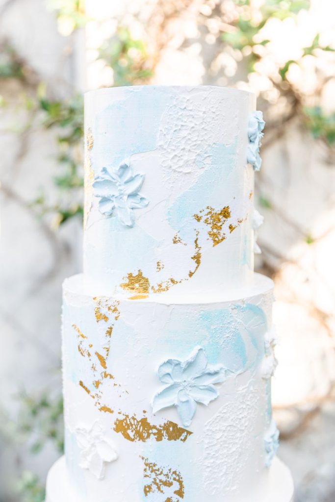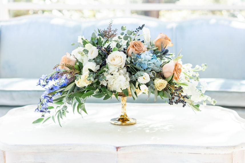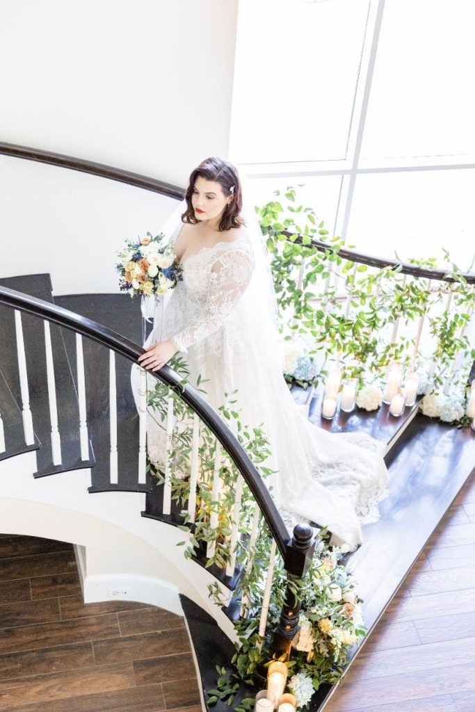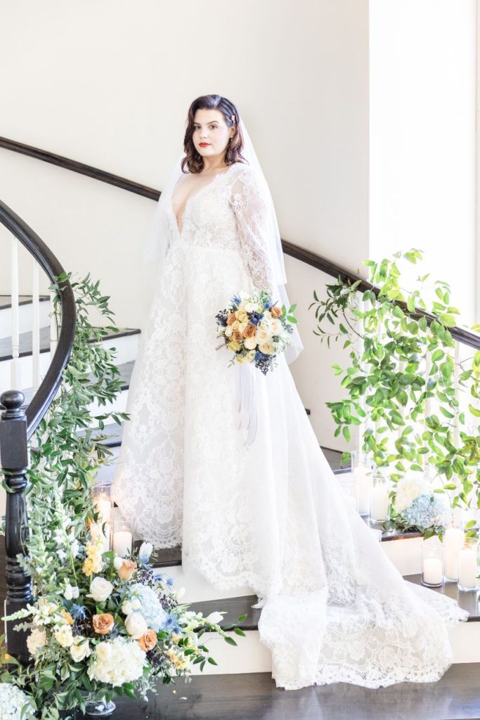 In addition to this beautiful long-sleeved and lacey gown from EVOKE: the bridal experience, our bride modeled the perfect vintage glam look styled by hair and makeup artists from Bridal Beauty Tribe in sweet pin-up curls secured with a jeweled hairpiece and paired with a classic red lip just like Allie would wear. Roses in shades of peaches and cream blend with pastel blue hydrangeas and other florals from A Different Bloom in her bridal bouquet and nestled about the scene while, all around, décor and rentals from Love Birds Vintage brought a sense of coziness while providing the perfect lounge area for couples to enjoy cocktails, or a slice of this delicately decorated three-tiered design from Marblelous Cakes with gold leaf details. From classic whitewashed and antique decor to bespoke calligraphy and cake details, this vintage wedding editorial takes us back to the first time we saw the Nicholas Sparks film. Read on for a note from the calligrapher behind Joyful Soul Calligraphy for more about this styled shoot and its intricate, “The Notebook” inspired design. Cheers!