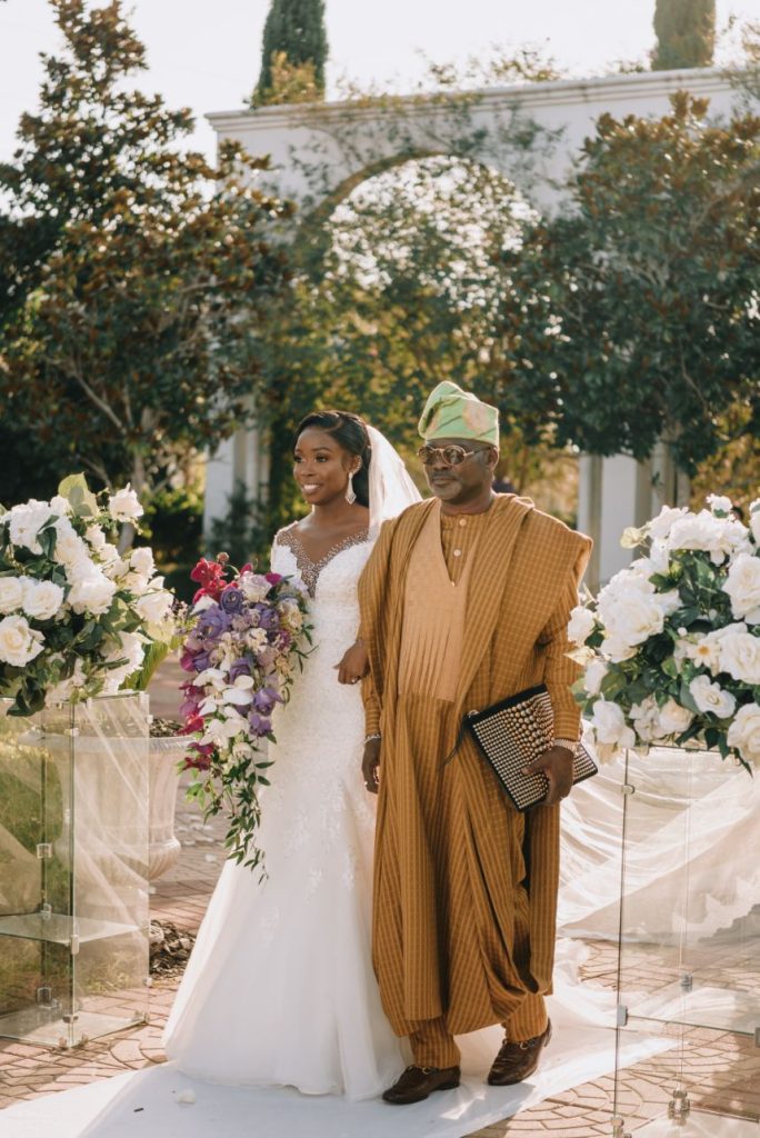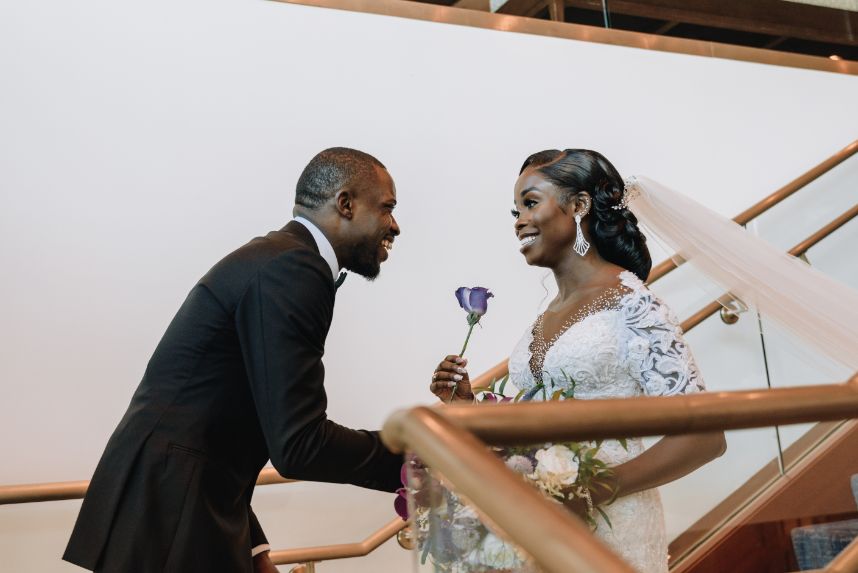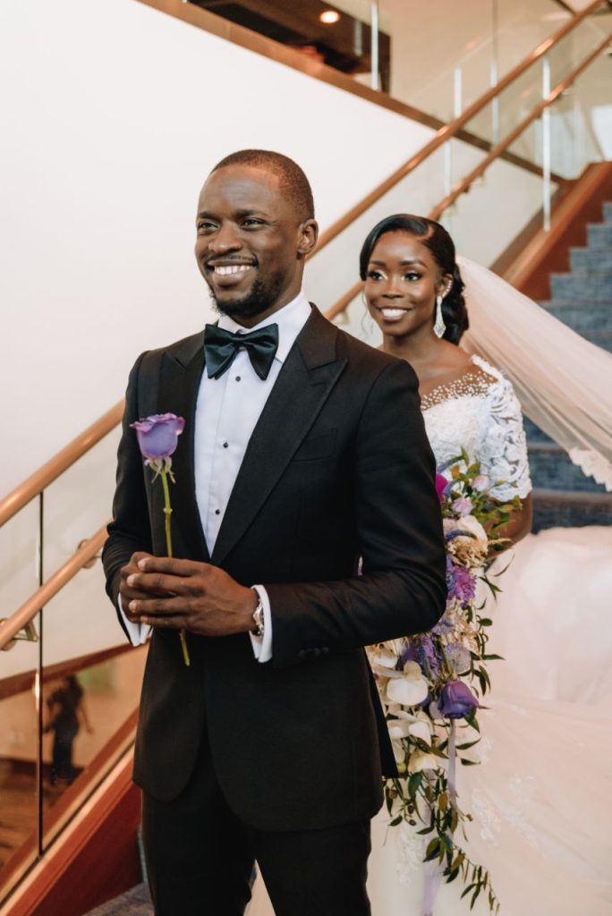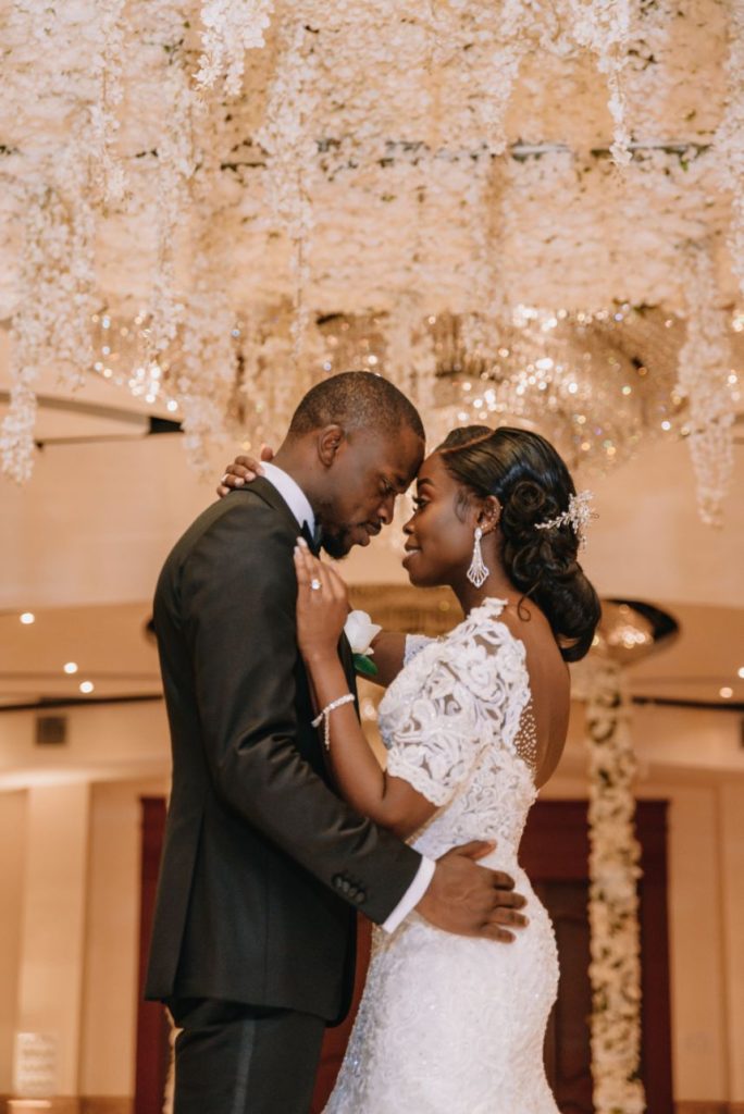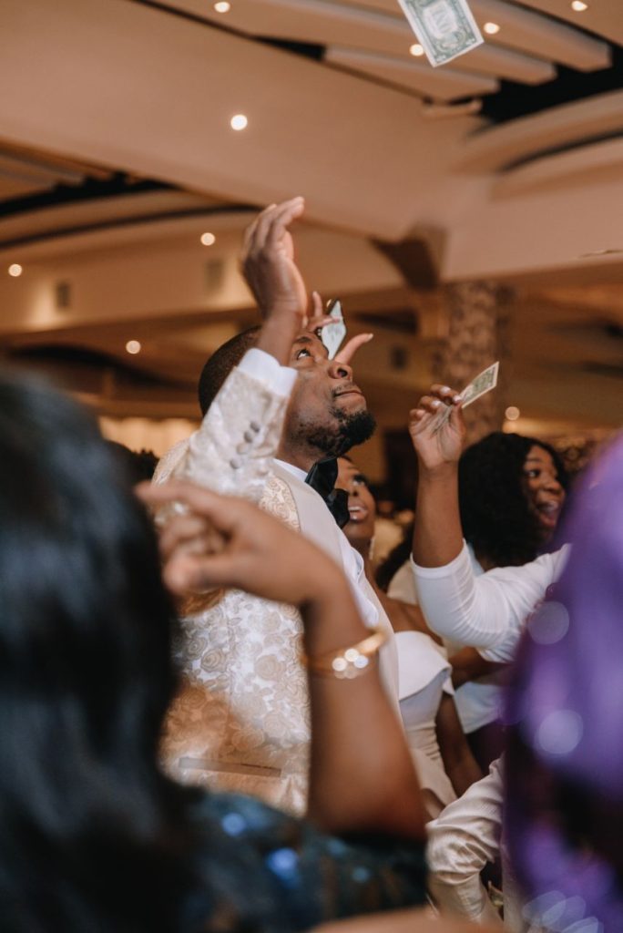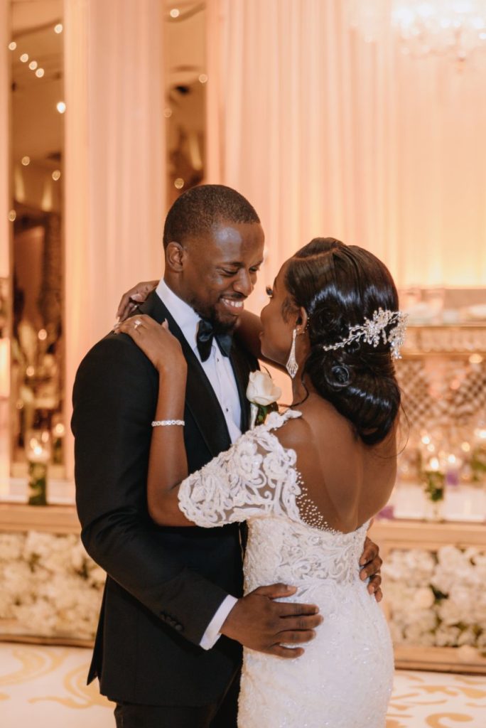 Filled to the brim with so much luxury, Moriam and Brume tied the knot in an elegant Houston wedding ceremony and reception that was elevated in more ways than one. Flowers and greenery cascading from suspended arrangements bring all the romance while twisting and turning glass tablescapes trimmed with gilded filigree make us feel like we’re at a royal wedding! Ivory and gold serve as a timeless color palette for this elegant Houston wedding but we love the royal pop of purple as a subtle accent color behind the altar setup as well as adorning the head reception table. A cream-colored five-tier cake from Cakes by Gina covered in breathtaking edible florals of all kinds surely knocked guests’ socks off, and when it tastes as good as it looks, good luck saving some for later! Taking to the dance floor, the newly married Akpomretas chose to incorporate a money dance for both bride and groom’s Nigerian heritage. The money dance, or money spraying symbolizes a showering of happiness, good fortune, and a display of the guest’s affection for the couple, and it helps to prosper the newlyweds in their marriage together! A luxury-filled affair doesn’t have to mean a boring one and this family knew how to have fun out on Moriam and Brume’s custom wedding dance floor! Read on for a note from the bride about one of her favorite wedding memories – their first look. Cheers to Moriam and Brume!