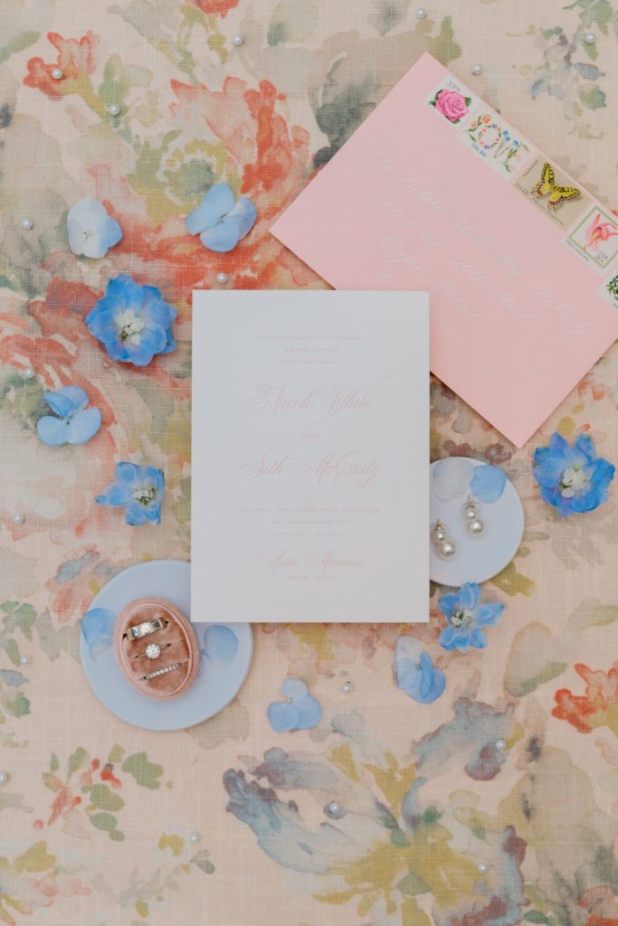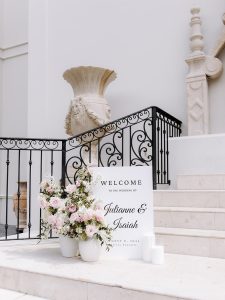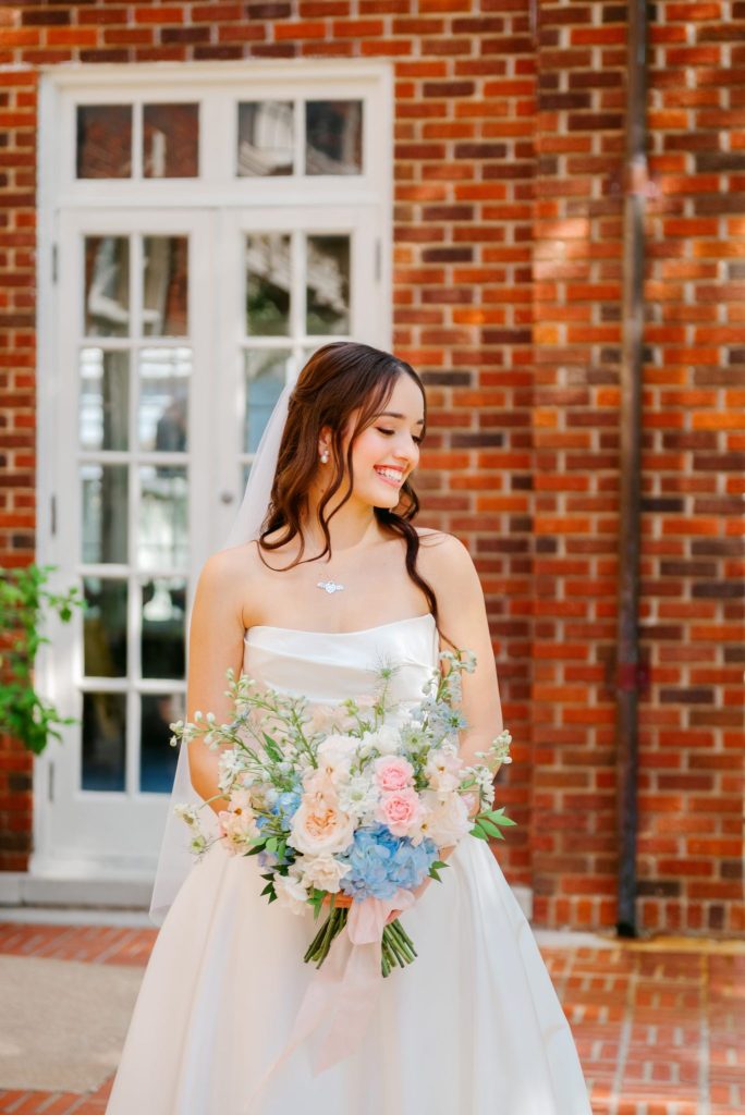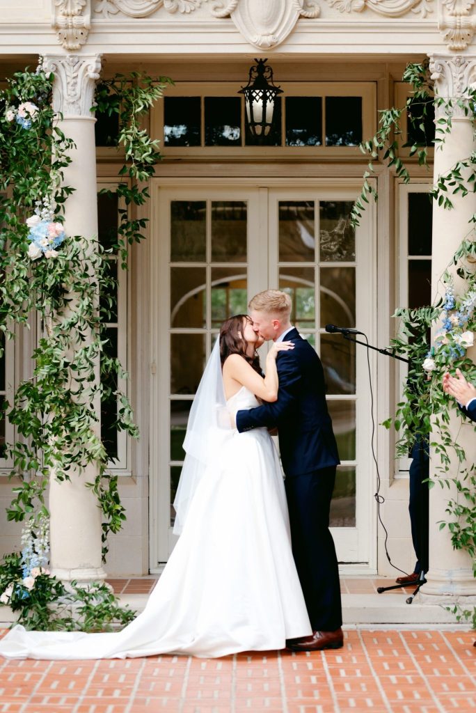 The ceremony took place in front of a grand doorway framed with lush greenery and soft pastel florals—setting the tone for a day filled with love. Nicole’s strapless gown and soft curls perfectly complemented her bouquet of blush, ivory, and powder blue blooms, while Seth looked sharp in a classic navy suit. Their first kiss as husband and wife was as joyful as it was cinematic.