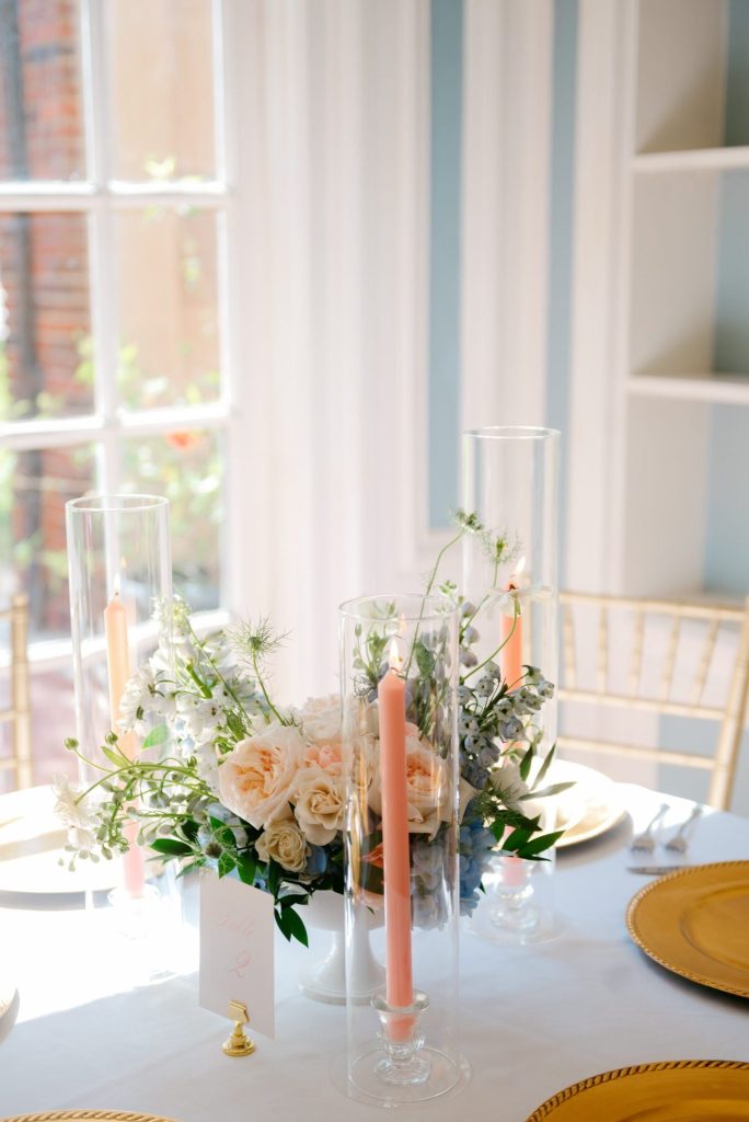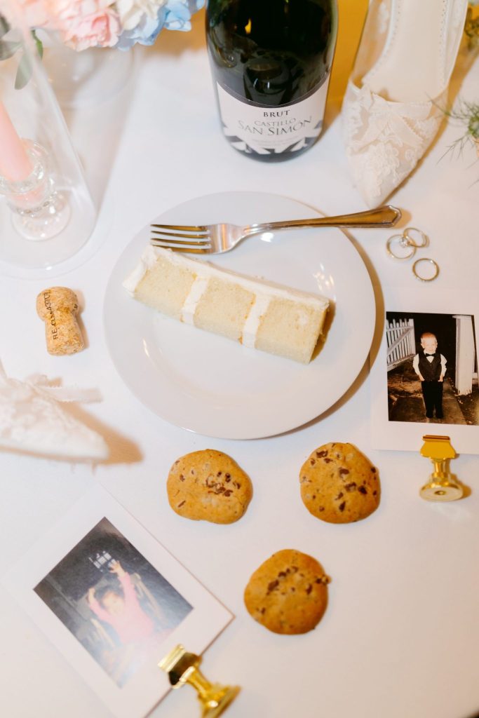 Inside, the reception featured soft candlelight, gold-rimmed plates, and delicate florals in creamy neutrals and dusty pinks. A photo taken of a table filled with nostalgic details—a slice of cake, chocolate chip cookies, Polaroids of the couple as kids, and their rings—reminded guests to celebrate not just the day, but their journey together.