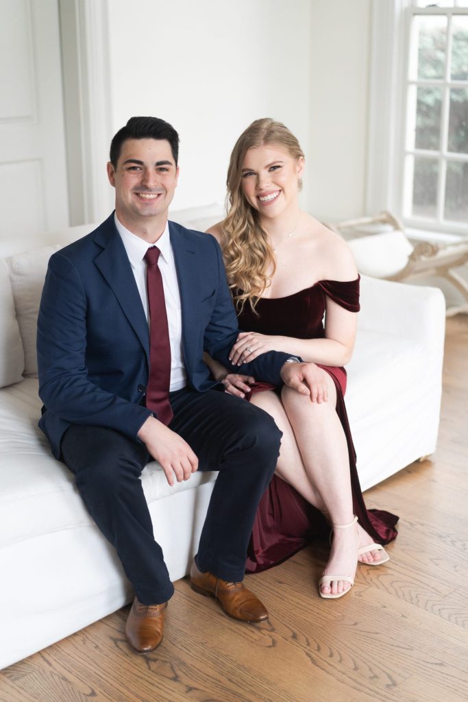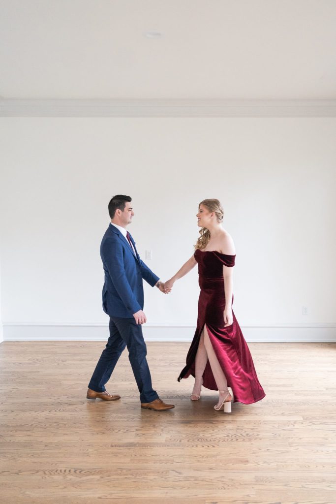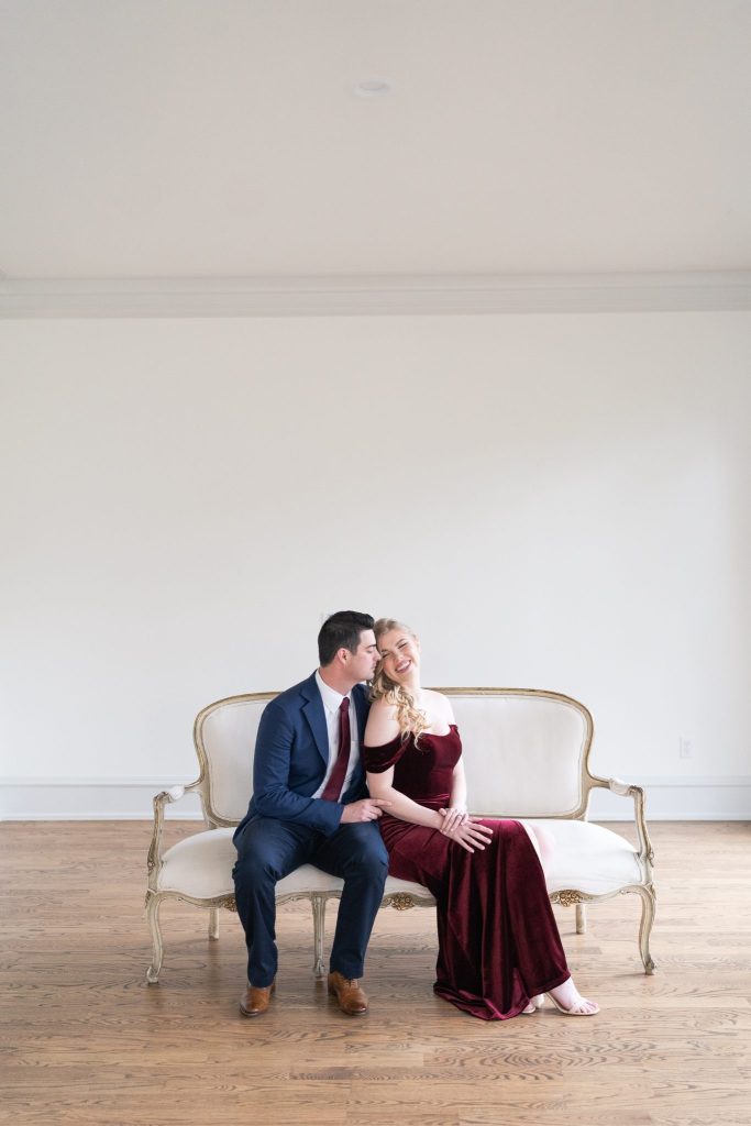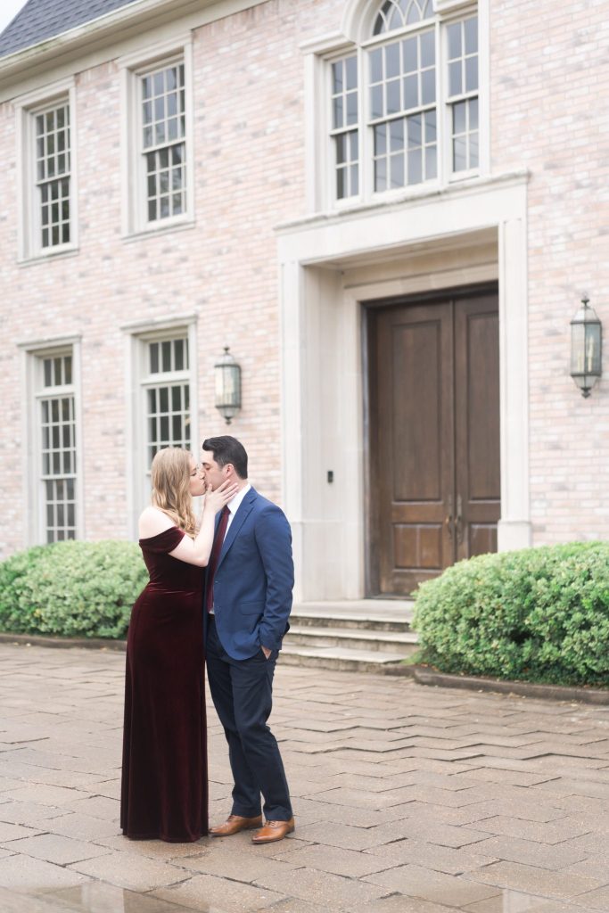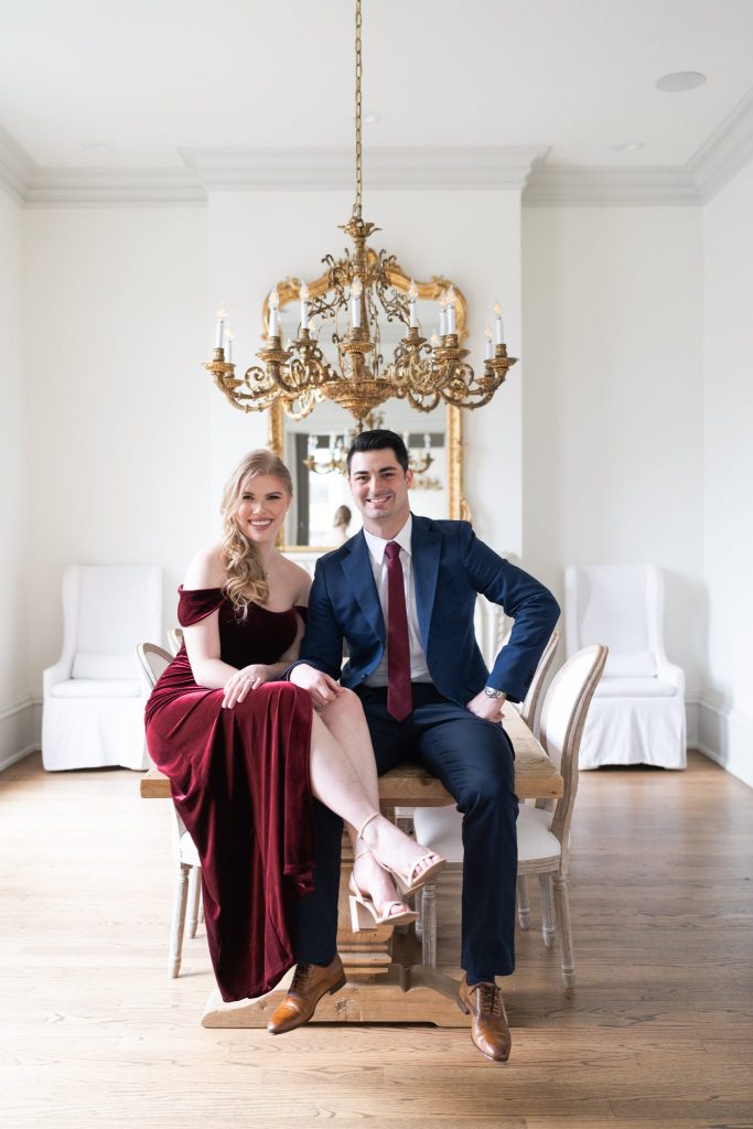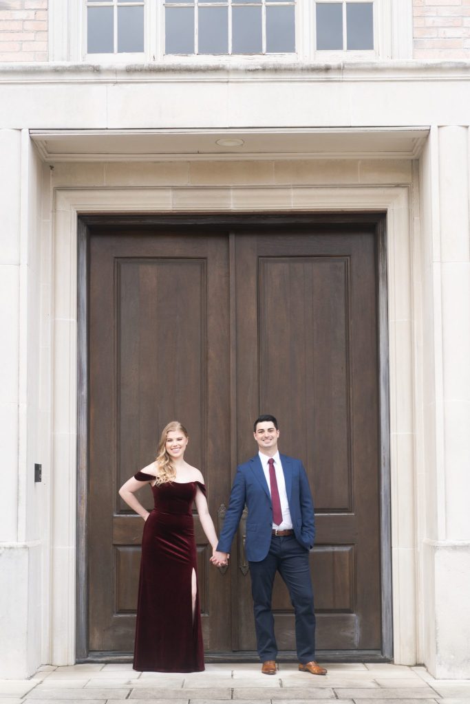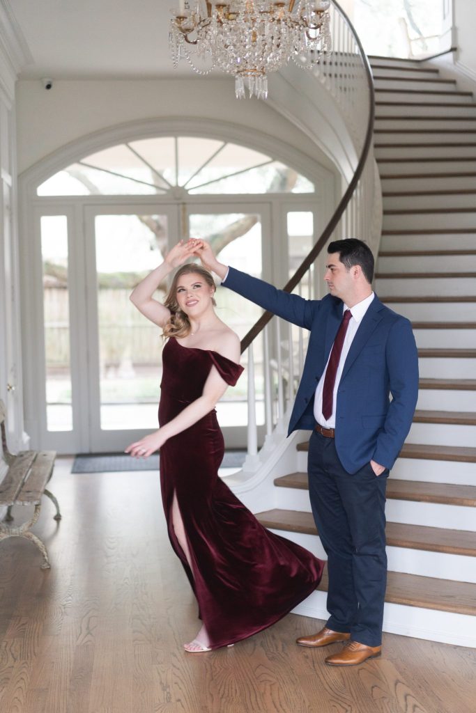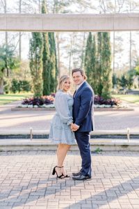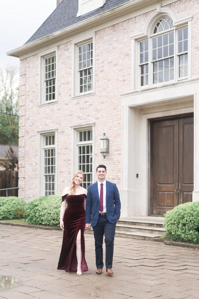 Shades of blue and maroon in Abbie Seay and Blake Brougher’s engagement shoot with Swish & Click Photography is chic and intimate. Swish & Click Photography delivered the most beautiful engagement session that portrayed the love the couple shares beautifully. Abbie and Blake met in high school. However, Blake didn’t know Abbie because she was a few years younger, but Abbie always had a slight crush. During Abbie’s senior year of high school, Blake attended an alumni kickball tournament where Abbie and Blake played on the same team. After the tournament, the two began a friendship, eventually leading them to a date. After a few years of dating, Blake proposed to Abbie in such a romantic way. He told Abbie they had tickets to see the symphony but had a chance to go on a private tour of the Houston Museum of Natural Science before the show. During the tour, while looking at gems, the tour guide brought a small box. Inside the box sat the most beautiful three-stone engagement ring. Blake got down on one knee and proposed to the love of his life.