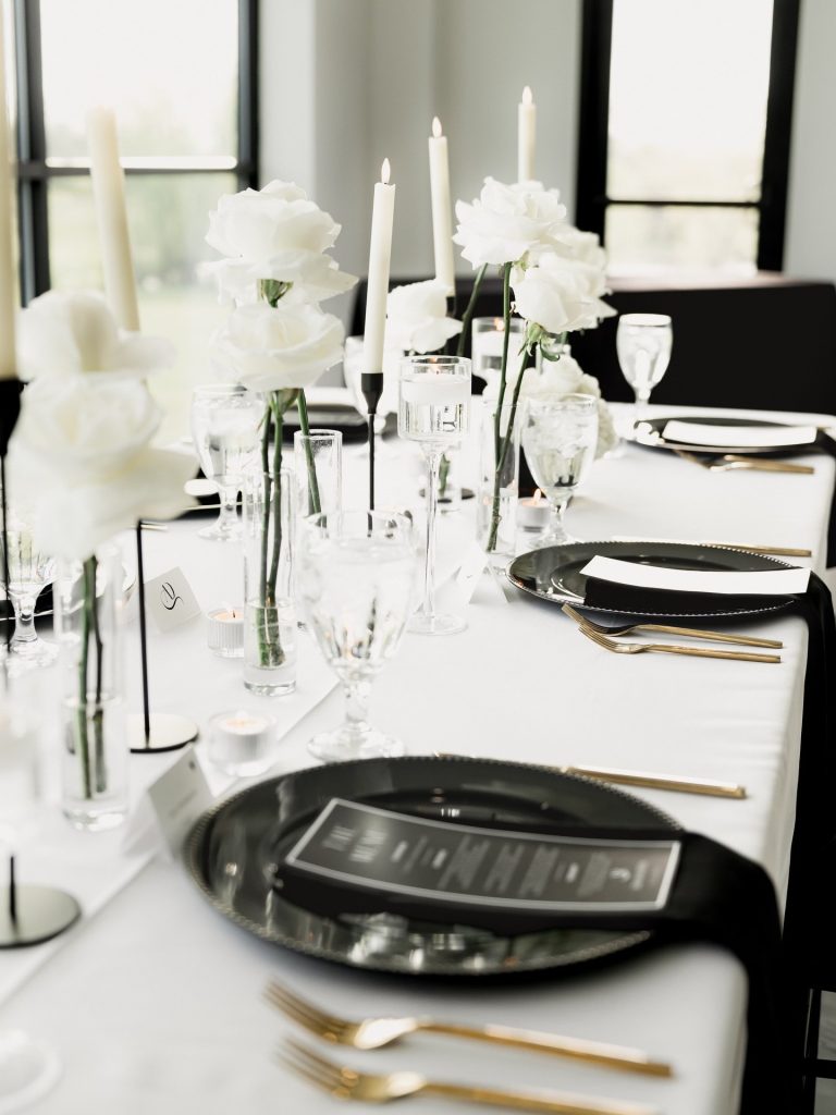 Akilah & Devin’s wedding, planned by The Tiffany Effect, was a classic black and white celebration, featuring a lush floral ceremony arch and modern, chic tablescapes. Their monogram made its way into all the little moments too, from the seating chart and menus to handkerchiefs and signage.⁠