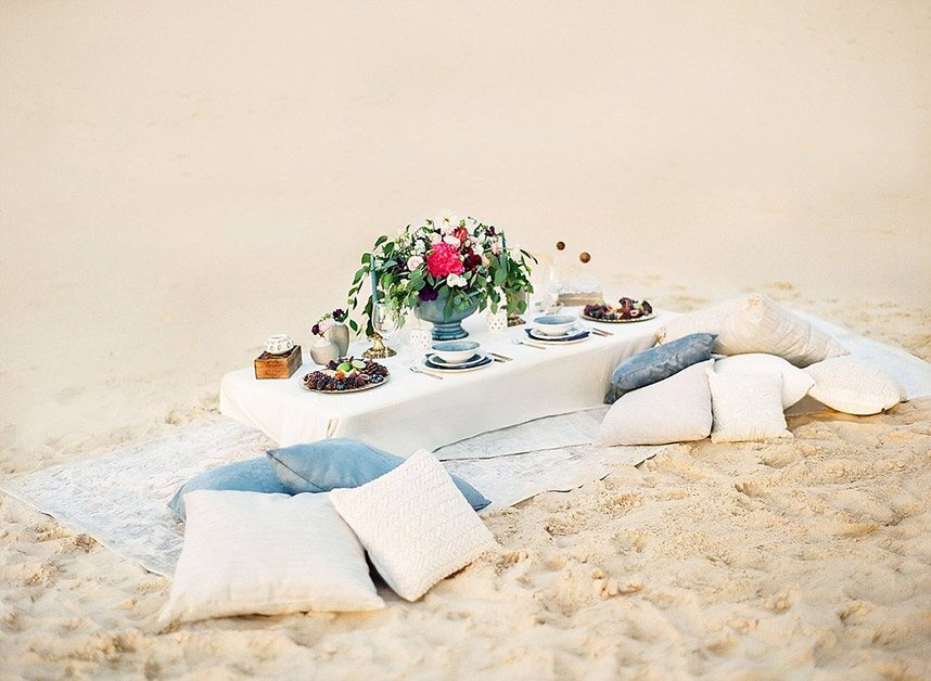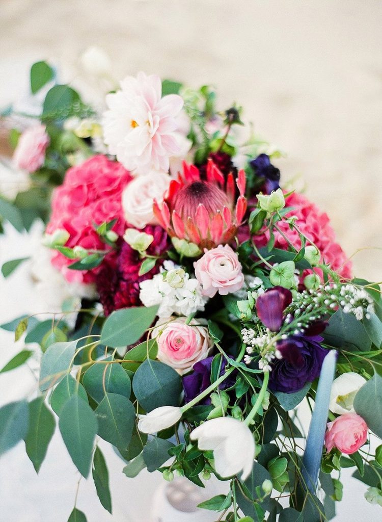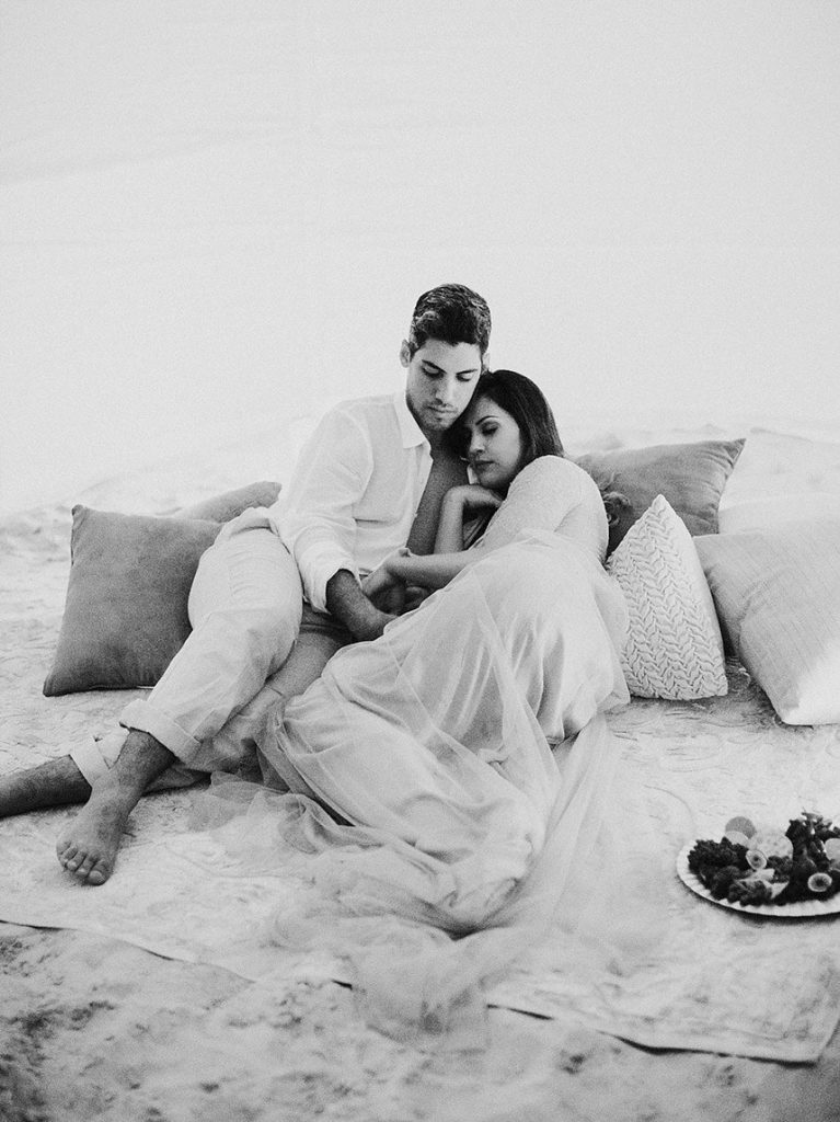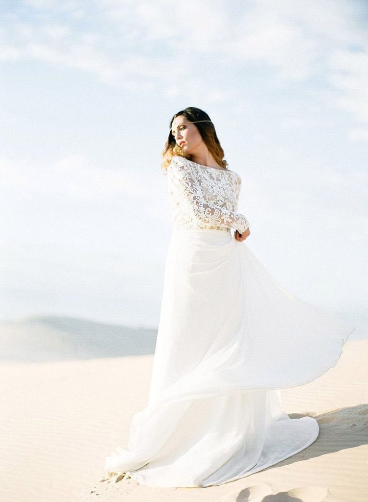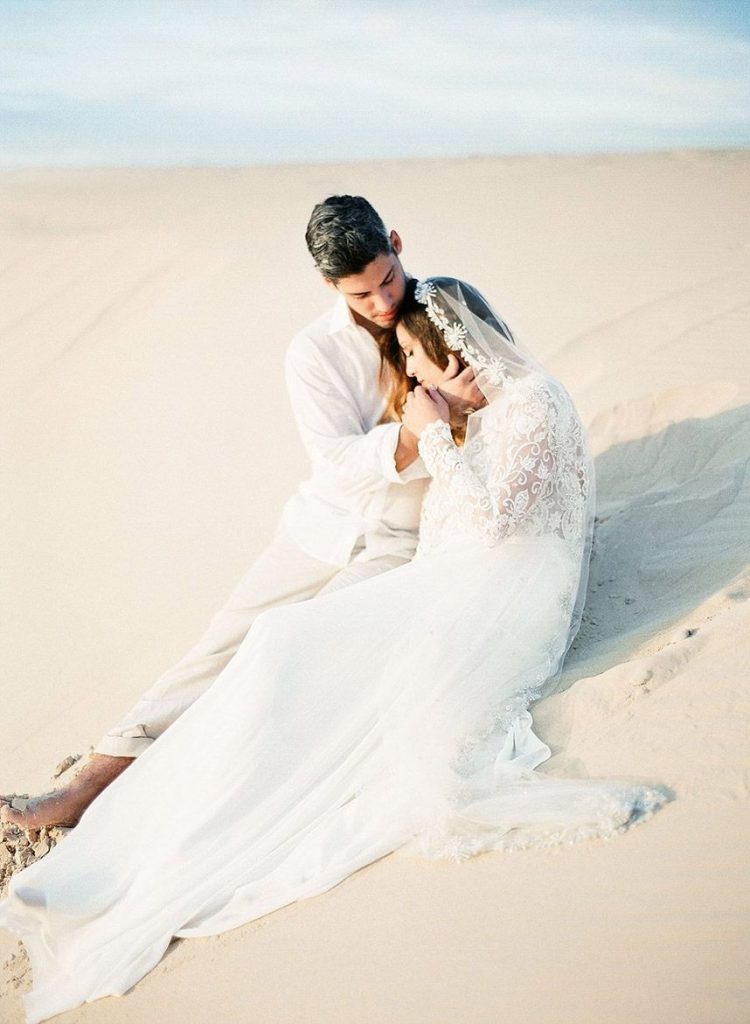 With a background of muted pastel skies, soft sandy dunes and punchy hued florals and decor, we’re obsessing over every detail in this Arabian desert styled shoot by Leighanne Herr Photography. Collaborating with Glitter and Whiskey Events, the team plus a couple of horses traveled west to the Monahans Sandhills State Park to create the ultimate dream elopement session. The model bride stunned standing under the blue and white linen-wrapped altar, wearing a long-sleeve, low back lace gown from Lovely Bride. Her beauty look from Adorne Artistry was perfectly matched to the desert climate with loose curls that were neatly pulled back into a sophisticated low bun. Soft colors like pale blues and sandy neutrals helped create a cool tablescape framed by bold colors in an elaborate floral centerpiece and display of delicious noshes in a charcuterie board. Rounding out the desert delights, Dolce Designs’ spectacular two-tier floral-topped cake was the perfect finishing touch to the free spirited shoot! We can’t get enough!