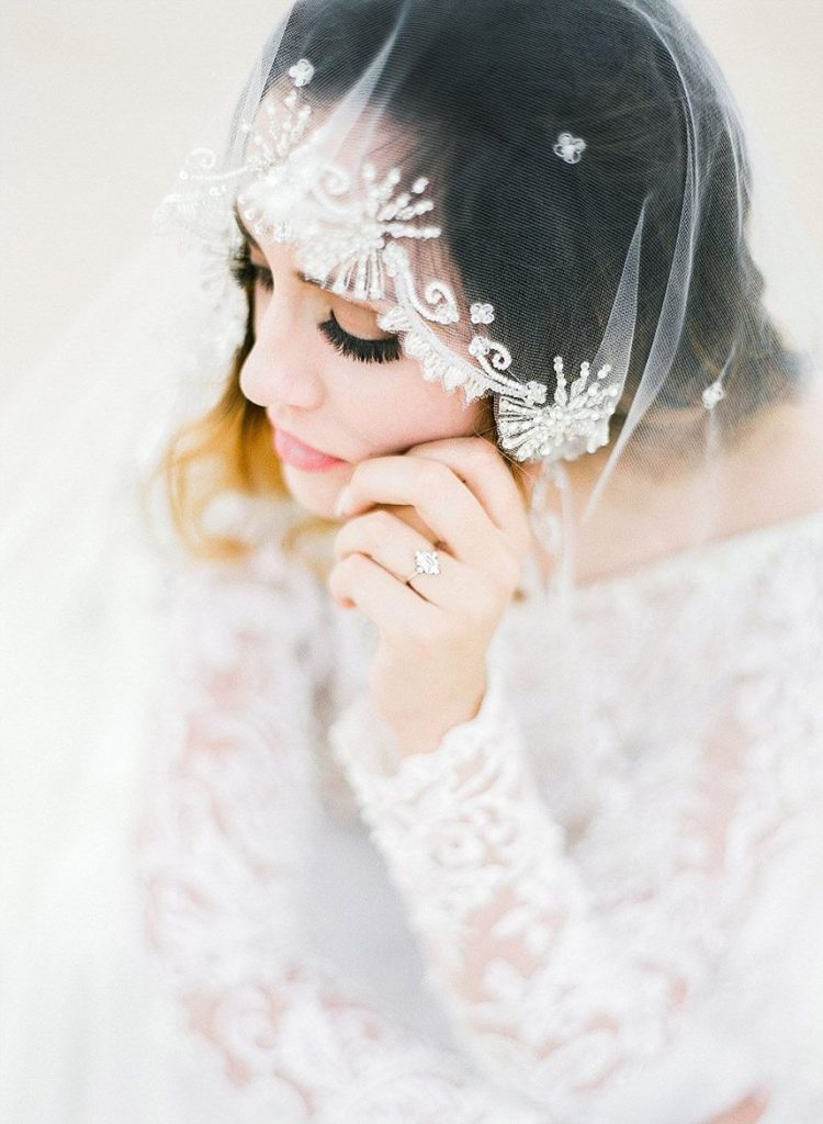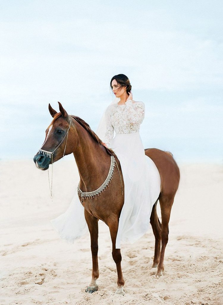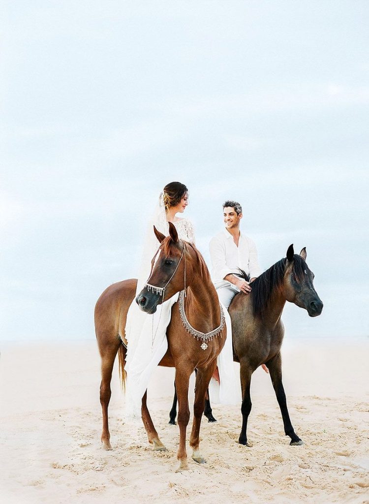 From the photographer: “We decided on Monahans Sandhills State Park way out in west Texas as the location, and I then reached out to my friends at MJ Arabians. They offer a unique service of taking couples out on their gorgeous horses for special events and they were kind enough to lend us Ami and Gamilah for the day. We chose an airy color palette of dusty blue, white and neutrals combined with pops of color in the florals which would work perfectly during the spring or winter.”