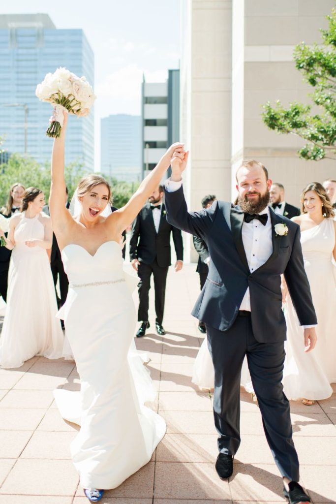 Ashley and Patrick gave us the ultimate blush and ivory wedding filled with gorgeous blooms from Monica’s Brides & Touch of Glitz Flowers. The day began with Ashley getting ready with her best gals before their 2:30 pm ceremony. Ashley slipped into her stunning gown from Brickhouse Bridal with a natural beauty look from AH Specialties. This gown transitioned perfectly from a church ceremony to an elegant soiree. The stunning ivory and blush blooms lined the tablescapes with flickering candles inside the light and airy reception space. After dancing the night away with confetti cannons showering the dance floor, Ashley and Patrick included one more surprise for guests! The couple’s band performed a Second Line for their exit. Ashley and Patrick danced down the middle lines with traditional umbrellas to celebrate the couple’s Cajun/New Orleans heritage. The Second Line led the parade around downtown to the bar where Ashley and Patrick held their afterparty with bar bites, cocktails, and cigars for guests to enjoy!