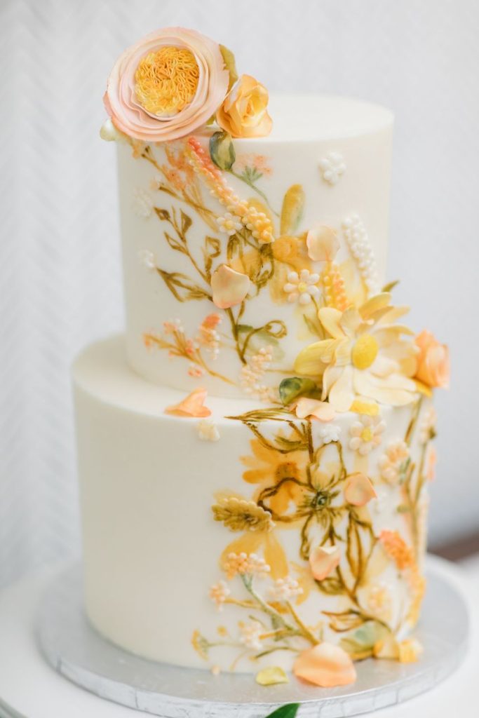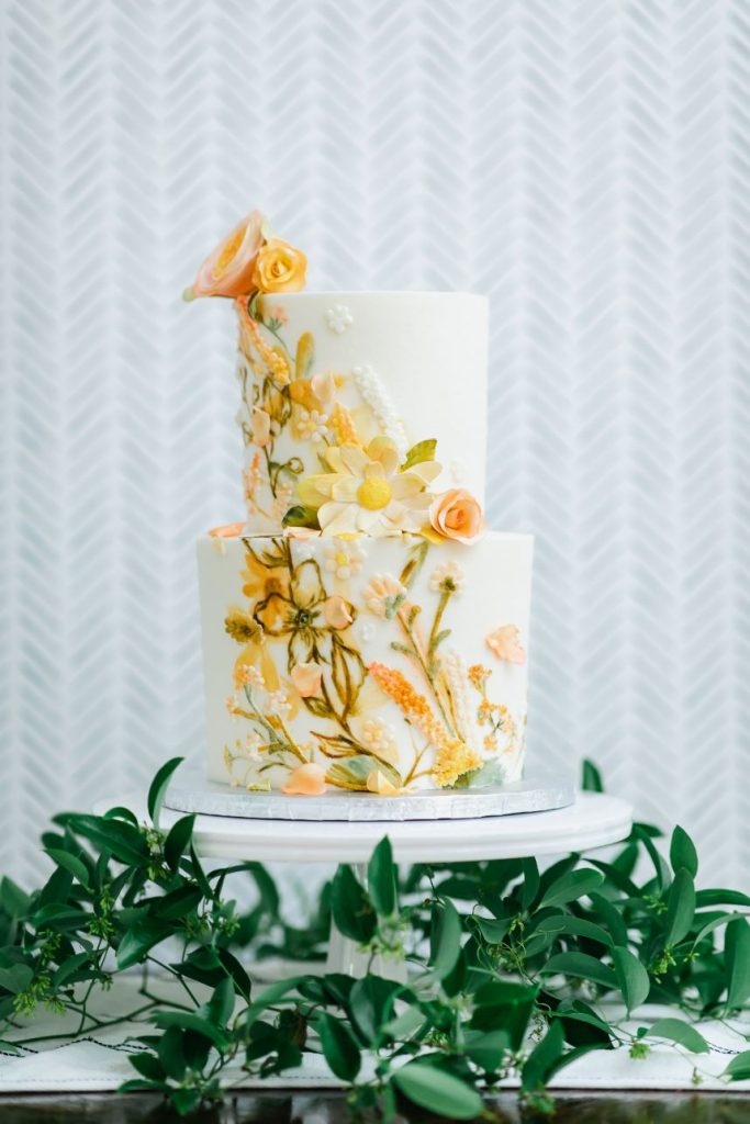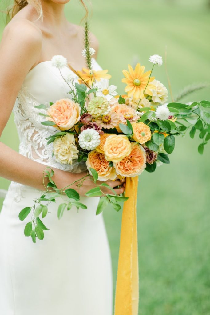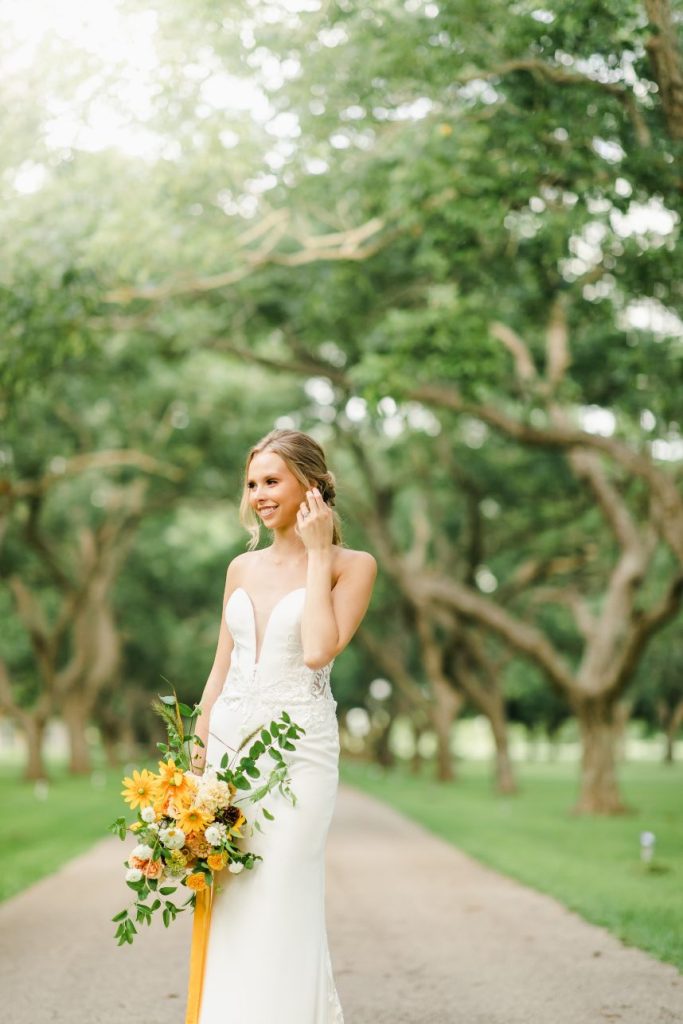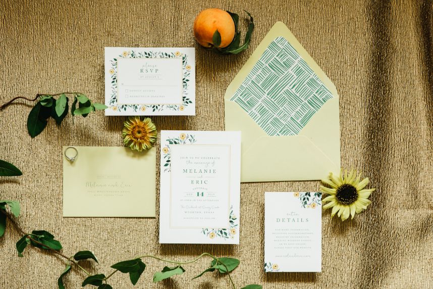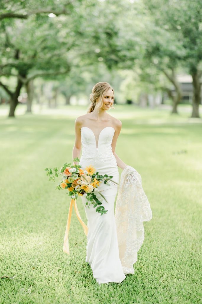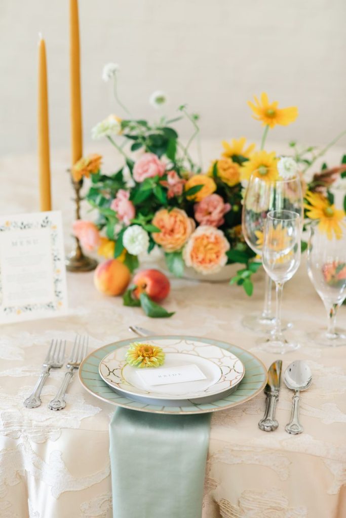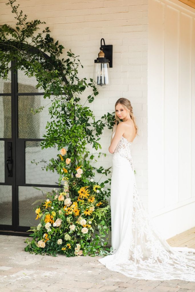 Fresh and elegant, this Aspen Gold wedding inspiration at The Orchard at Caney Creek is full of natural details in rich, cheerful tones, all beautifully captured by BLVD Photography! From the invitation suite to the place cards, the details from Paper Tie Affair are the perfect complement to the sophisticated linens from LBL Event Rentals with their soft shades and romantic detailing that reflect the design on the bride’s gown. Crowning the entire event are the lush florals from Tin Cup Farm that grace every corner from arched doorways and tablescapes to accenting the lively (and scrumptious-looking) cake by AshleyCakes. Our model bride is truly the show-stopping feature of this wedding inspiration with her modern sheath gown from The Princess Bridal with it’s delicate detailing around the bodice. Hey Lovely created a fierce bridal beauty look that perfectly matched the setting by enhancing the bride’s natural beauty and giving her hair natural movement. With little features like the darling designs inside the invitation envelope or the floral pattern on the cake, you don’t want to miss a single detail of this wedding inspiration. Enjoy!