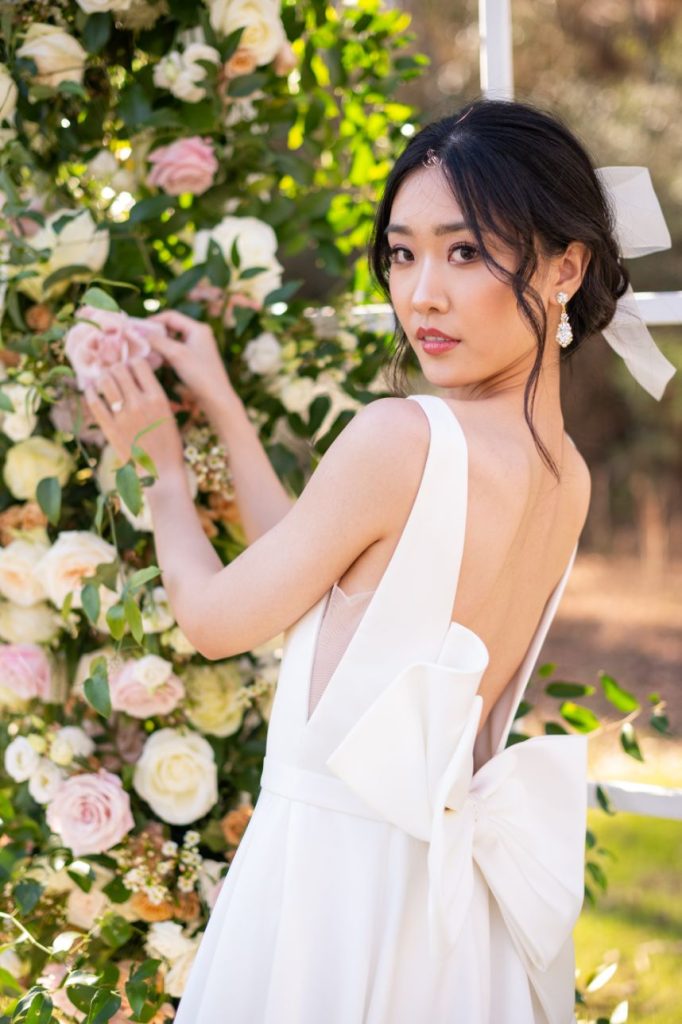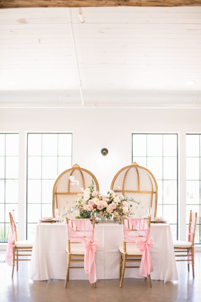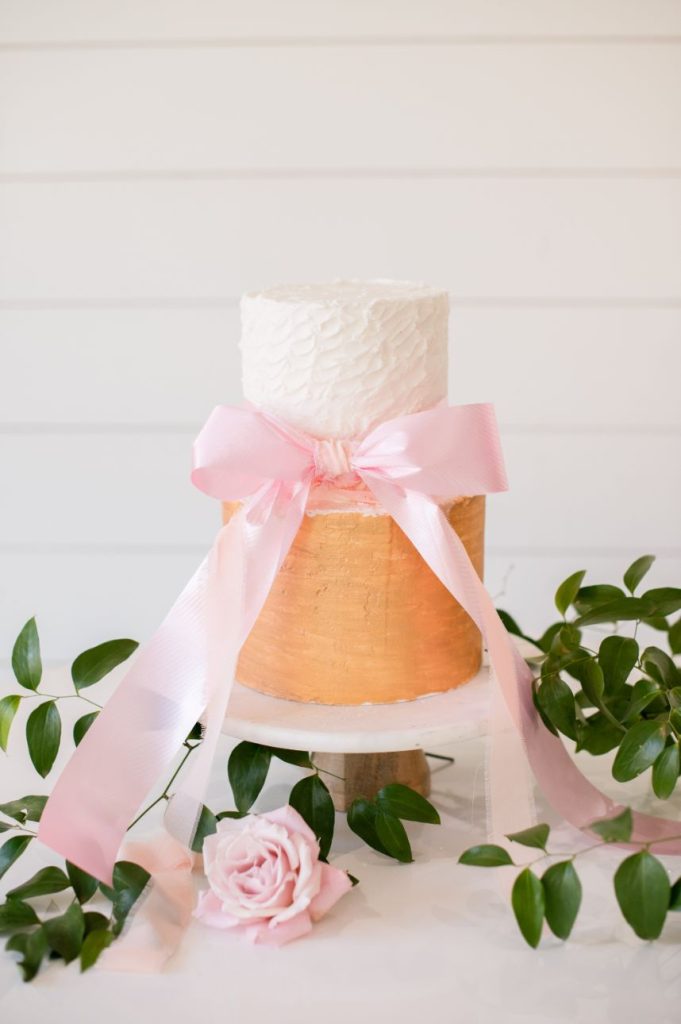 This bowed and beautiful wedding inspiration at The Meekermark is like putting a classy, adult spin on our childhood princess dream wedding desires! The talented Rhea Whitney Photography captures these lovely, light-filled scenes around the venue property that show off sophisticated feminine elements, luxe linens and organic table and chair décor from Avalon Event Rentals, all featuring the sweetest bow details. Overgrown installations of blooms in soft pinks, creams and champagne tones by The Senterpiece keep things soft and sweet through organic textures and romantic wedding design. Bering’s provides a stately invitation suite that is sure to make an impression and one that guests surely won’t forget seeing. This bride stuns in a Mikaella by Paloma Blanca gown from Brickhouse Bridal satin gown with bateau neckline and V-shaped Italian Tulle inserts on the sides of the bodice. Its chic satin belt at waist, asymmetric satin bow on the back and full circle skirt with pockets give us all the gown envy and pair perfectly with simple, romantic makeup by Hey Lovely as well as a low, effortless chignon secured with a delicate bow. For dessert, a two-tiered, two-toned cake design by Lane and Simple features organic textured details that we think are just to-die-for. Read on for notes from the florist as well as the hair and makeup artists about the style and design of this bowed and beautiful wedding inspiration made for our girlie brides who love bows. Cheers!
