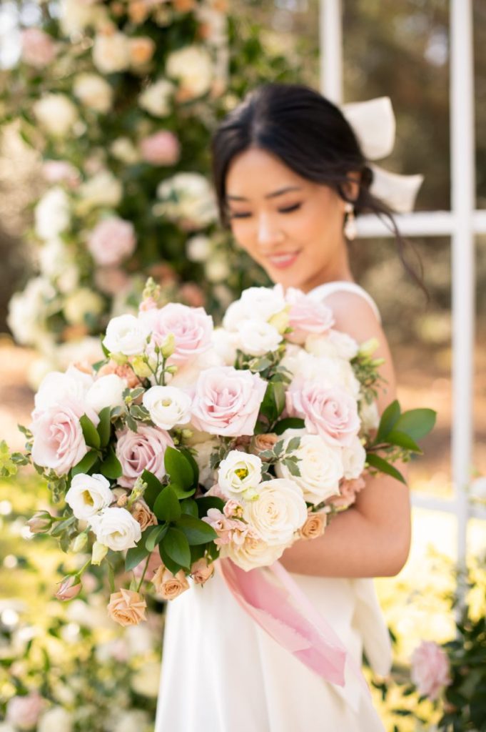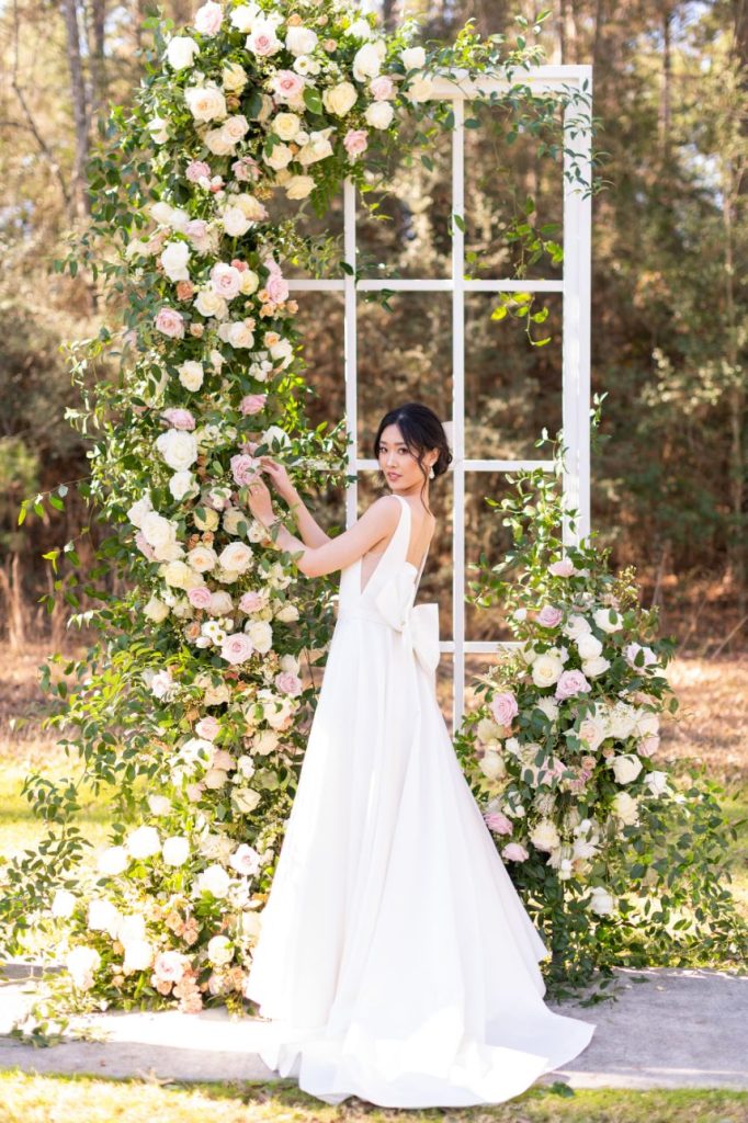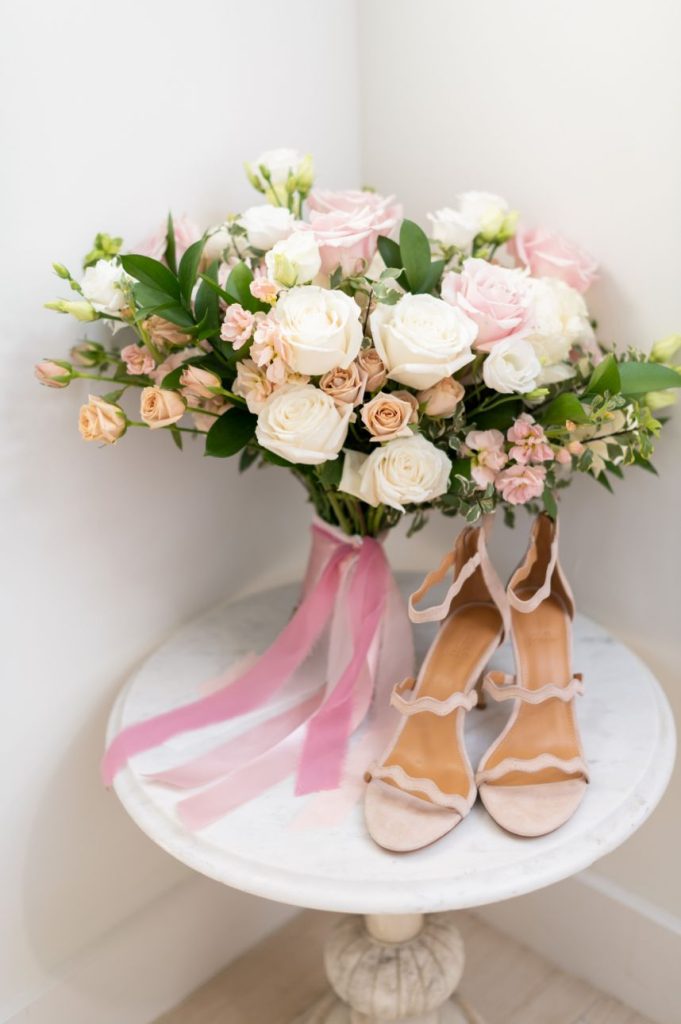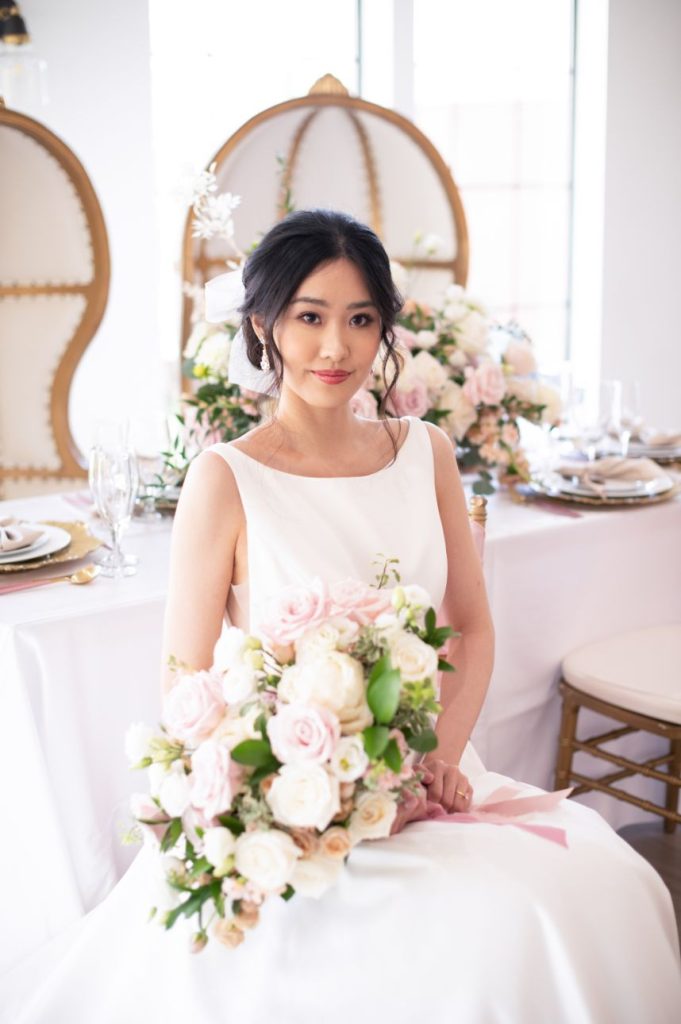 From the florist, Donna of The Senterpiece: “The design for the photoshoot at The Meekermark was a complement to the bow theme with the flowers in soft pinks, creams and champagne tones. The floral table arrangement was designed in a crystal compote with flowers including sweet eskimo roses, O’Hara garden roses, ranunculus, stock, hydrangea, Lisianthus, Peonies, champagne spray roses and dahlias. The garden window design was more freeform with flowers in complementing roses, stock, hydrangea with the smilax foliage wisping throughout the arrangement. The bridal bouquet was a somewhat unstructured hand-tied bouquet with an oval shape overall. We had a great time designing the photoshoot with all the beautiful weather outside!”