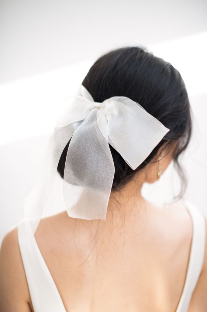 From the hair and makeup artists of Hey Lovely: “To even the model’s skin tone, we used a light olive beige foundation. Pretty lavender, plum tones and fluffy lashes made her brown eyes pop. A beautiful dusty rose lip finished the look. For hair, we chose a low, effortless chignon which added an element of romanticism.”