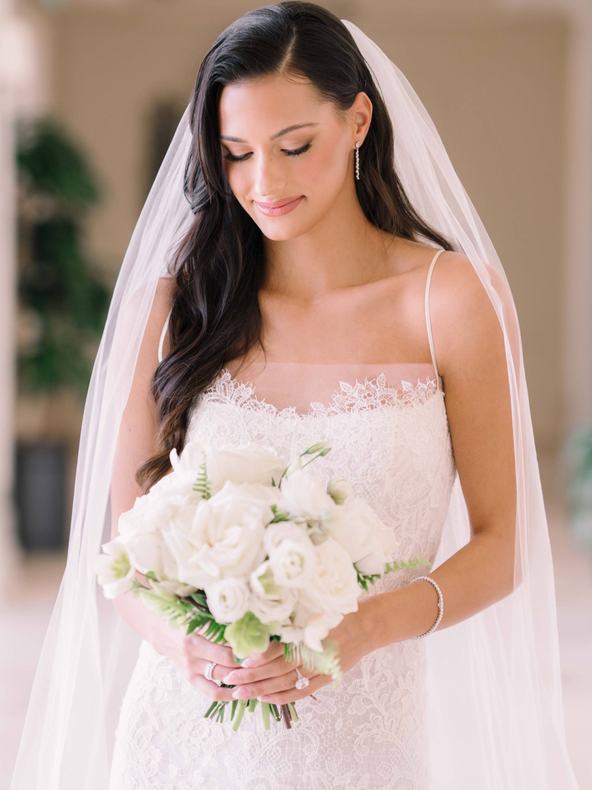 “I love this look because the bride’s natural features are accentuated, and the soft colors are so flattering to her skin tone. We used soft colors and a touch of shimmer on her eyes, and finished them off with a shadow liner and fluffy lashes. The bride’s complexion was flawless, so we just added a touch of highlight and light blush color to her cheeks. To finish the look, we went with a peach-toned lip color.”