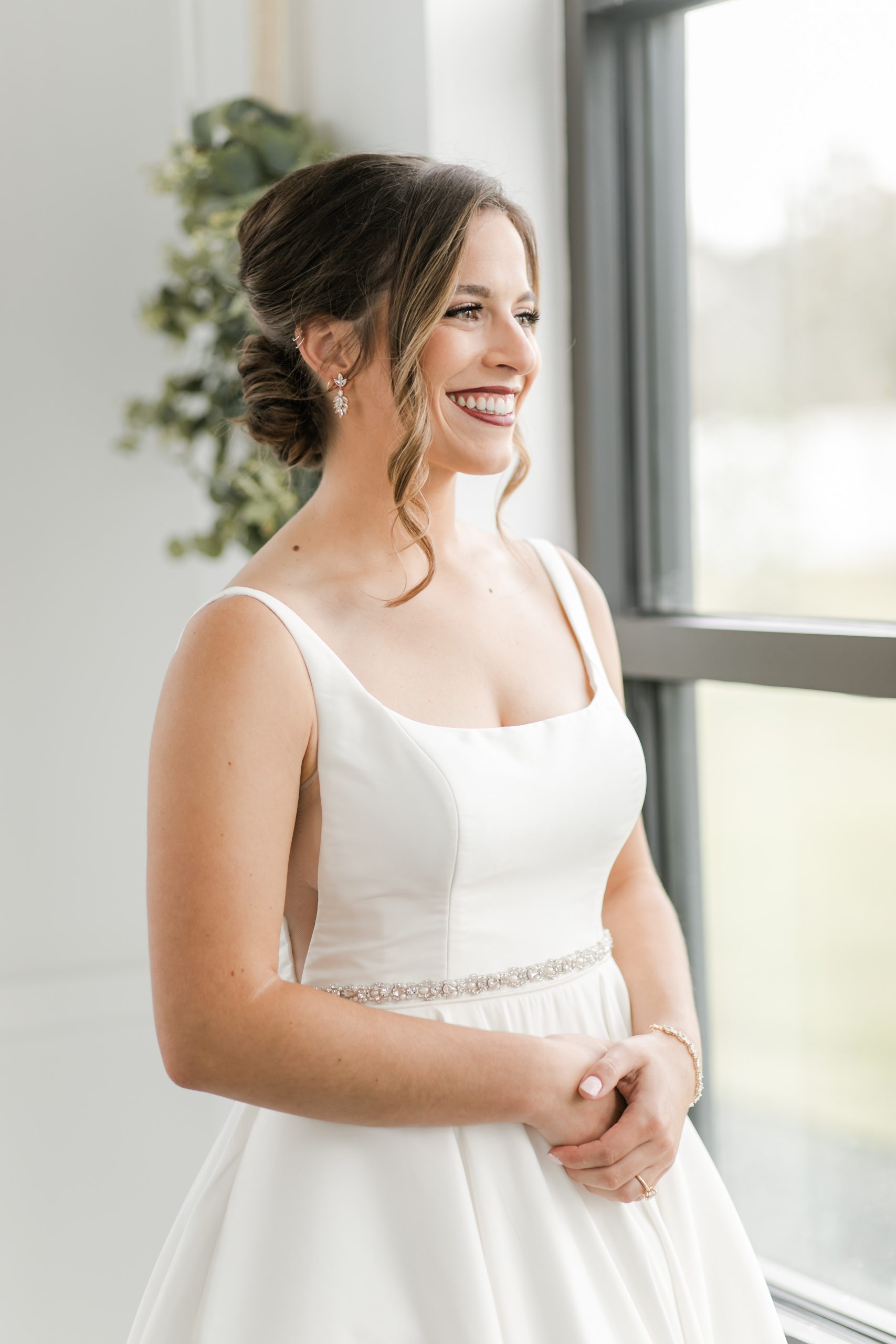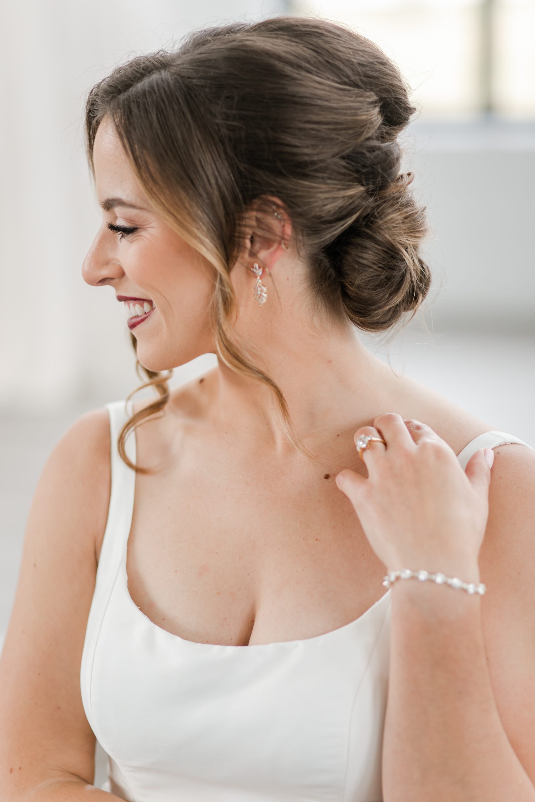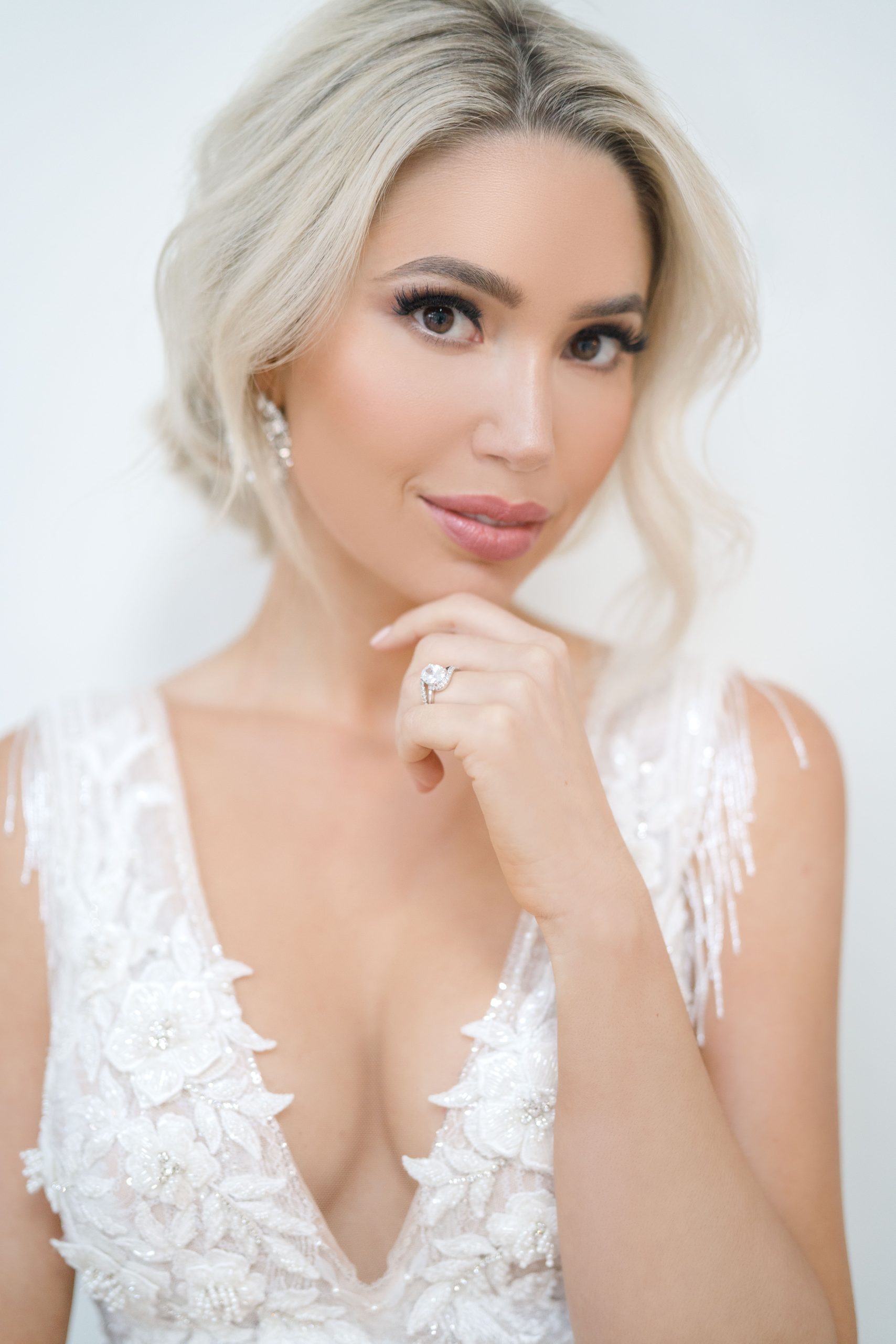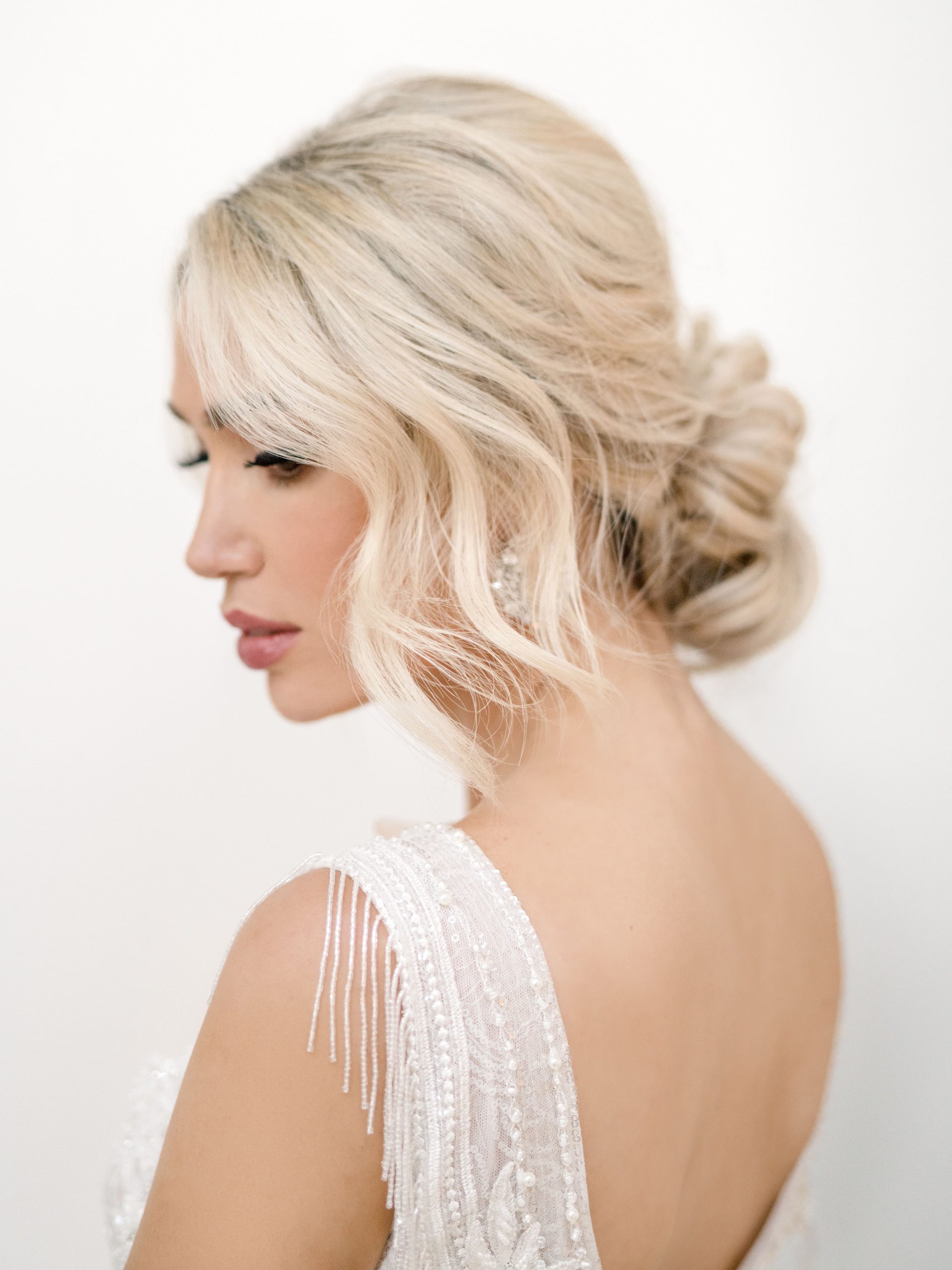 “How do you go wrong with a gorgeous bride like this? The dimension in her platinum blonde, face-framing bangs blended perfectly into a classic bridal upstyle and allowed us to showcase her best facial features: her eyes and lips. We kept the under eye clean and neutral while popping her top lashes and playing with warm yet neutral eye shadows. We chose a slightly smudged out winged liner to mirror her fluffy arched brow perfectly. A simple all-over nude lip liner and frosting of our favorite pigmented gloss made for the perfect pout. A touch of bronze and pop of pink on the cheeks allowed us to bring forth her naturally blushed cheekbones, and a sprinkle of highlighter topped everything off, leaving her with a dewy and effortless glow that every bride is looking for on her big day!”