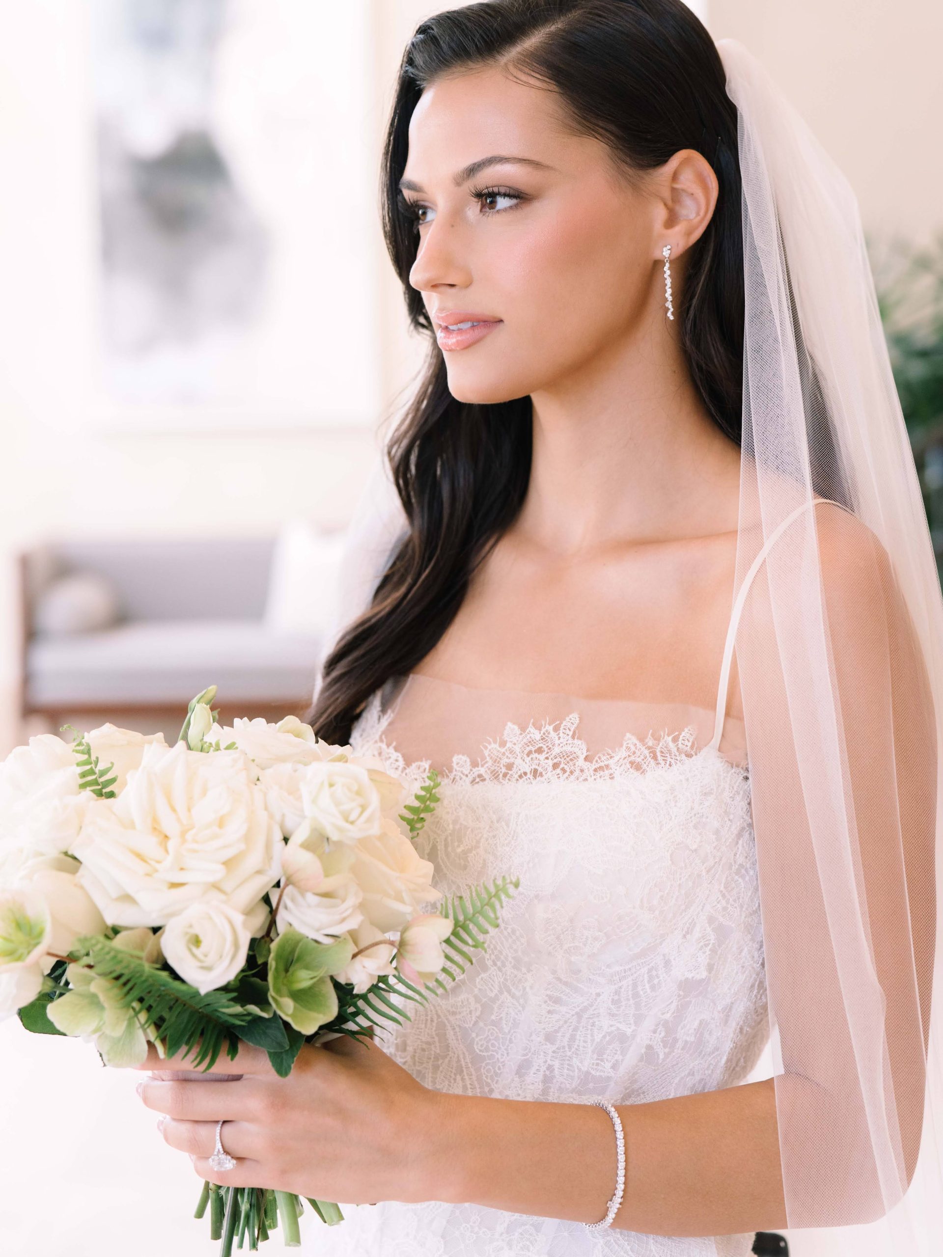 “More than ever, we are hearing from our brides that they want to look like themselves, but elevated. When they say glow, they mean a glow from within – not necessarily an over-application of powdery highlighters. This particular approach means that skin prep is key. We started by applying Sonia Roselli sexApeel™ Instant Exfoliation Spray to smooth her complexion and prep the face for moisturizer, followed by the Sonia Roselli Water Elixir Skin Prep. For a minimal but glowy foundation that evens out skin tone without providing full coverage, we applied the Charlotte Tilbury Hollywood Flawless Filter in shade 4 all over the face. This gave the skin a beautiful, candlelit luminous effect.”