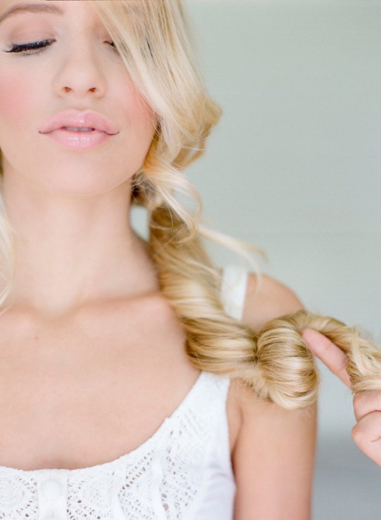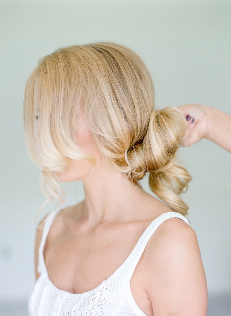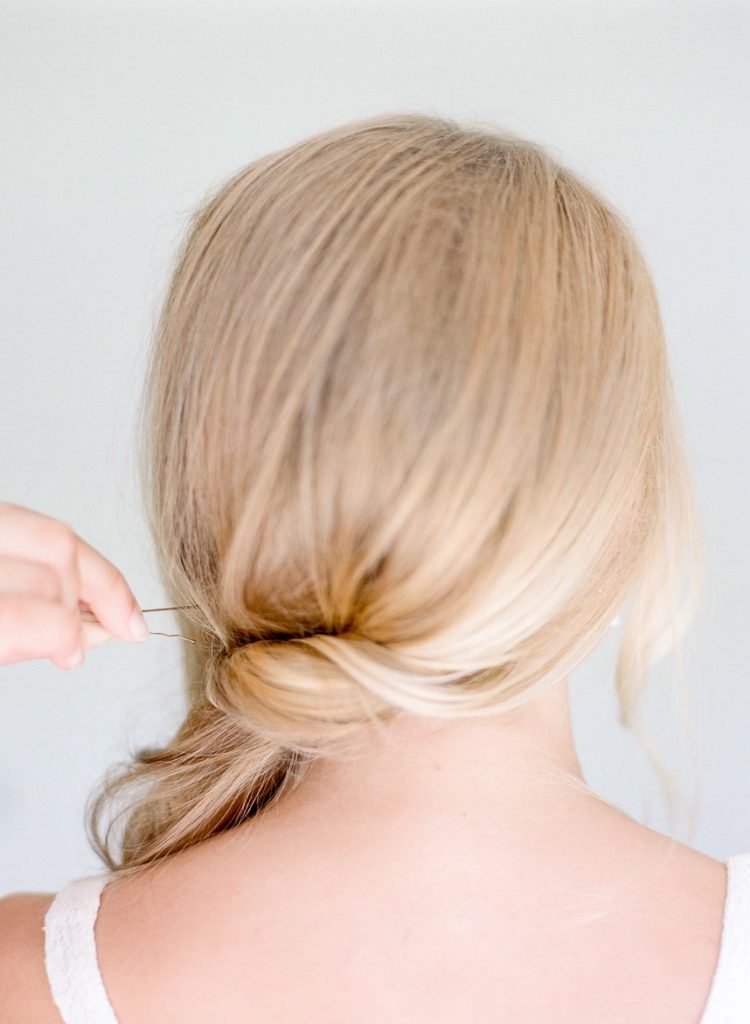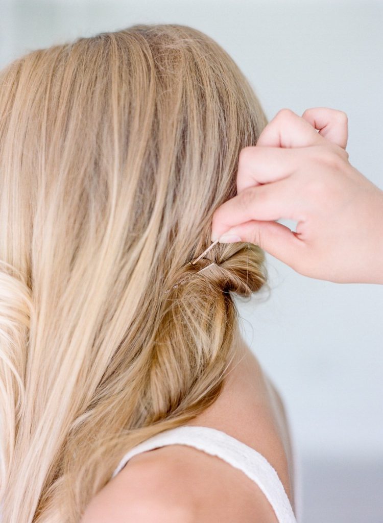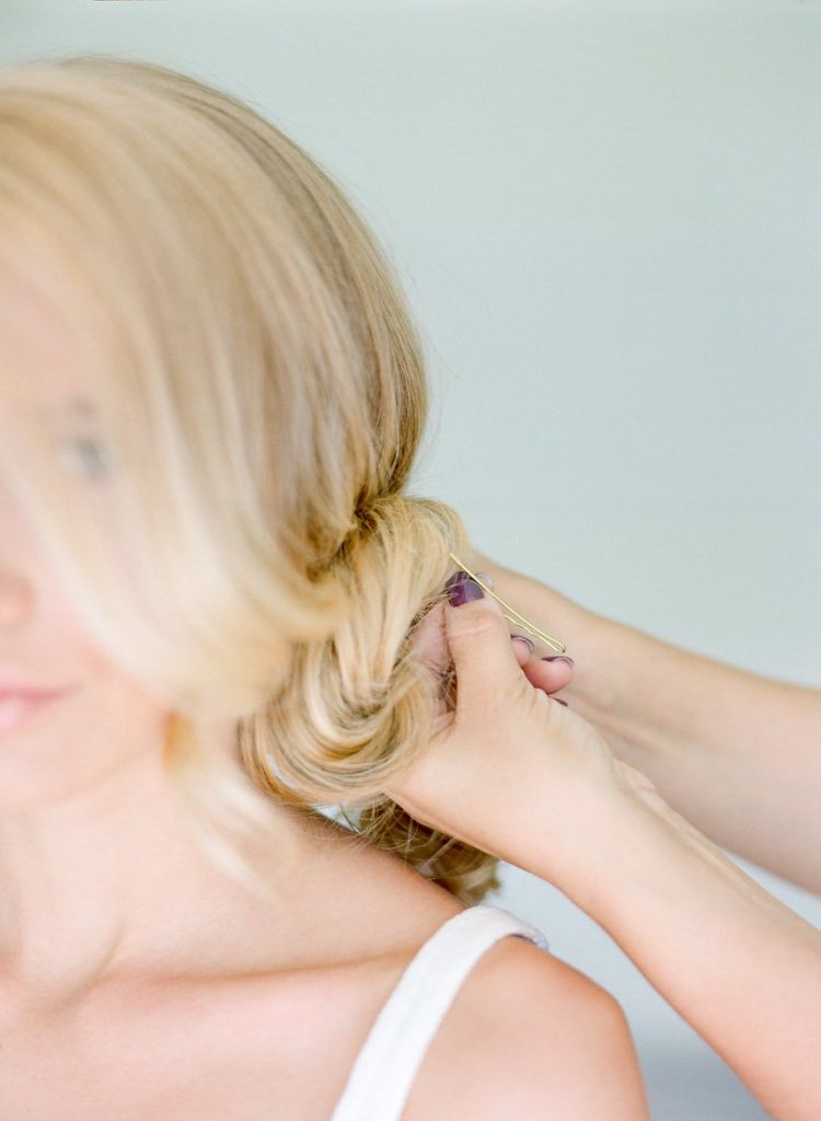 Step Two: Twisting from the bottom, sweep hair to one side (typically your right side works best, so your hairtyle will be visible to your guests as you’re standing at the altar!). Pin loosely.