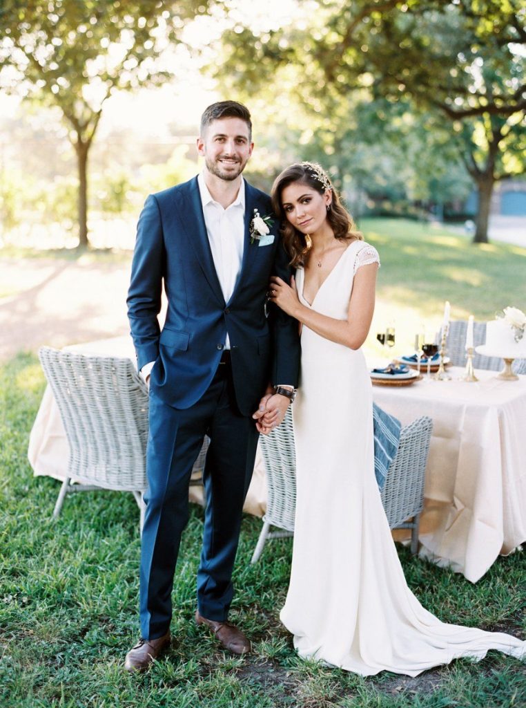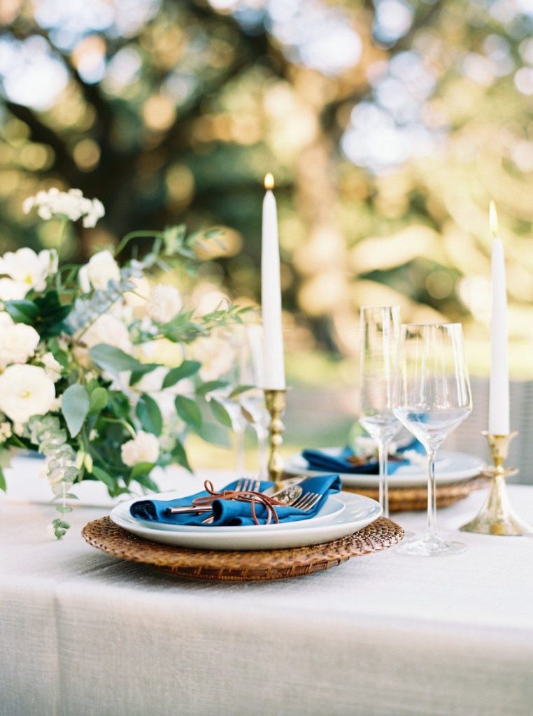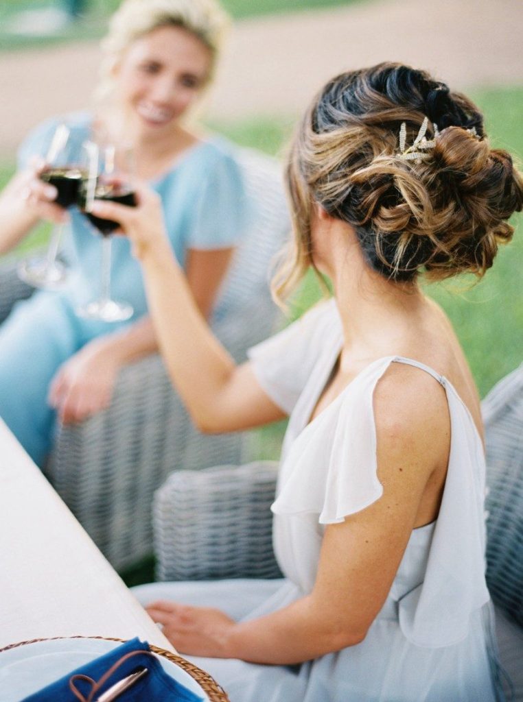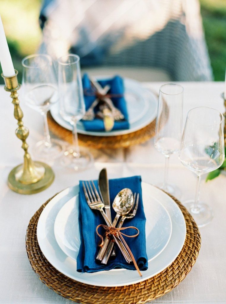 Beautiful azure hues and a laid-back yet sophisticated ambiance give this blue-toned backyard wedding inspiration a dreamy aesthetic we just love! Deep blues contrast with the neutral gray tones of the wicker chairs and linen-covered tablescape, bringing depth and texture to this elegant setup designed by Chancey Charm Weddings. The bride and her maids look effortlessly chic with loose, pulled back hair and clean makeup by Sunkissed and Made Up, complete with fun hairpieces and jewels in blue. The bride’s gown from Casa de Novia, with a plunging neckline and darling cap sleeves, is perfect for this upscale backyard soirée. From the bright and colorful stationery to the cerulean linens beneath swanky gold silverware and blankets on the chairs, this blue-toned backyard scene inspires us to consider an intimate, inviting celebration with the comforts of home elevated with dreamy tones and sophisticated textures. Happy scrolling!