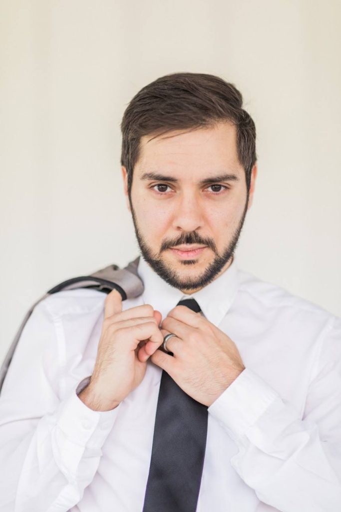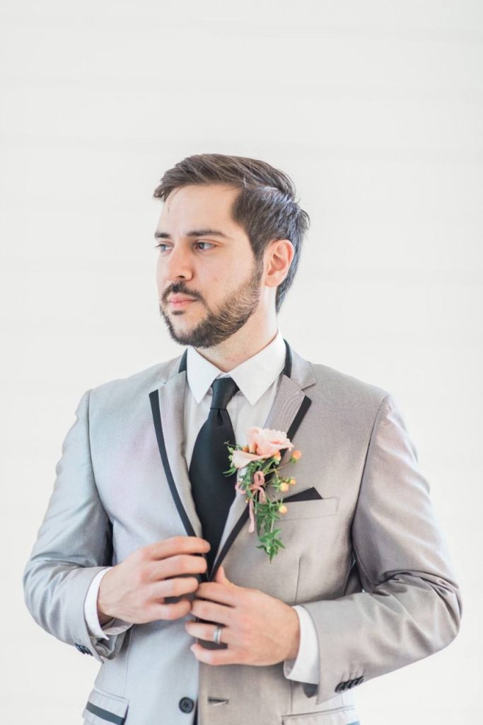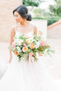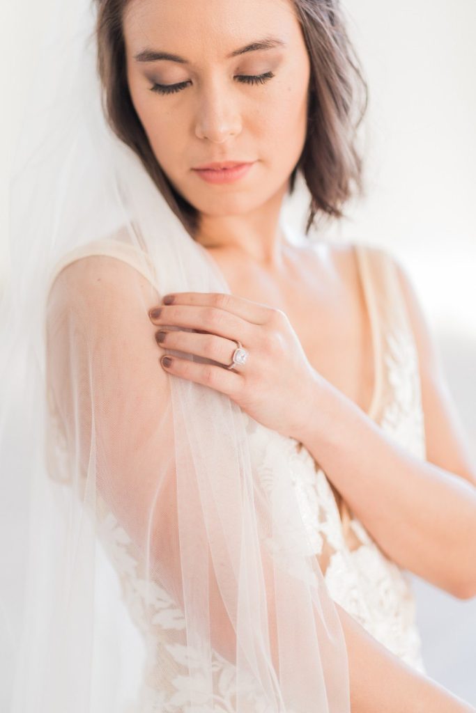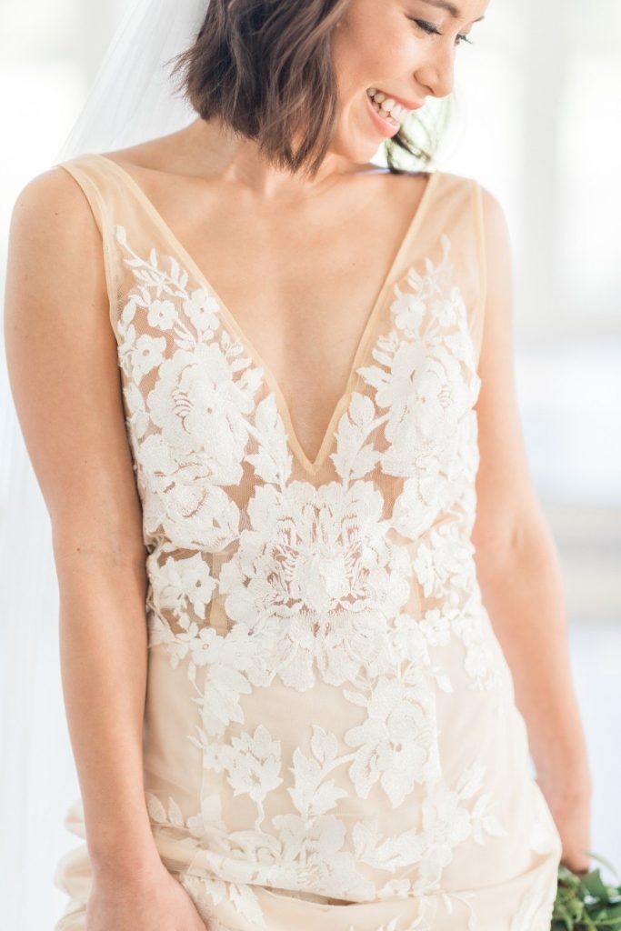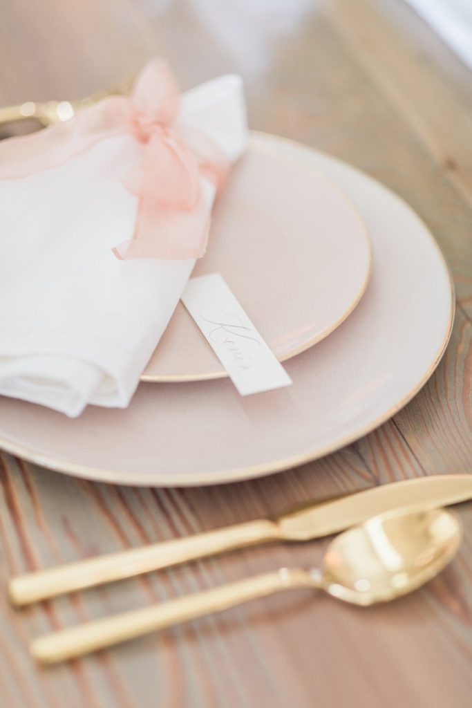 From the photographer: “The fine art style of weddings is beautiful, but often feels so unapproachable in the real world. We wanted to bring this style to life in a tangible way. For this shoot, we were inspired by texture – creating interest with the lace pattern on the cake, handmade paper for the invitations, contrasting cotton napkins with soft ribbon, mixing soft blooms with fun elements like berries and rose gold fern, textured styling plates and the amazing detailing on the dress. It’s these small details that elevates a design, but keeps it grounded and doable for real couples. Blush tones with the pop of the gold takes this color palette through any season and keeps it modern yet feminine, and classic yet fresh.”