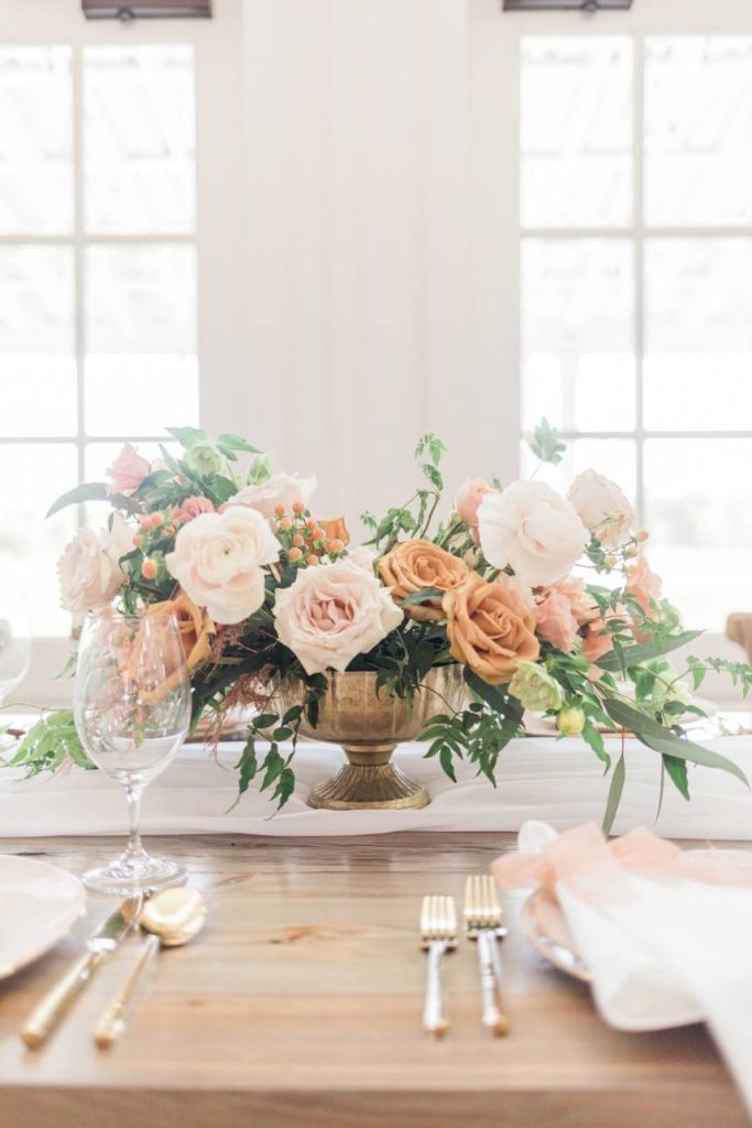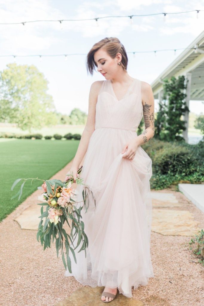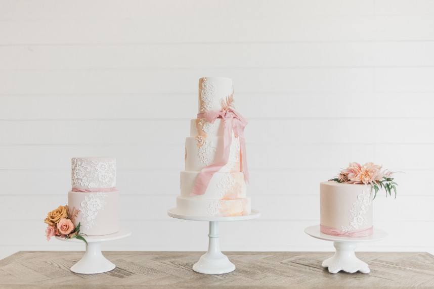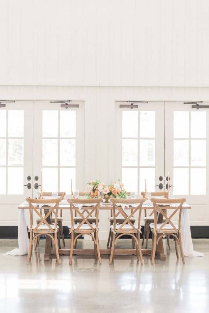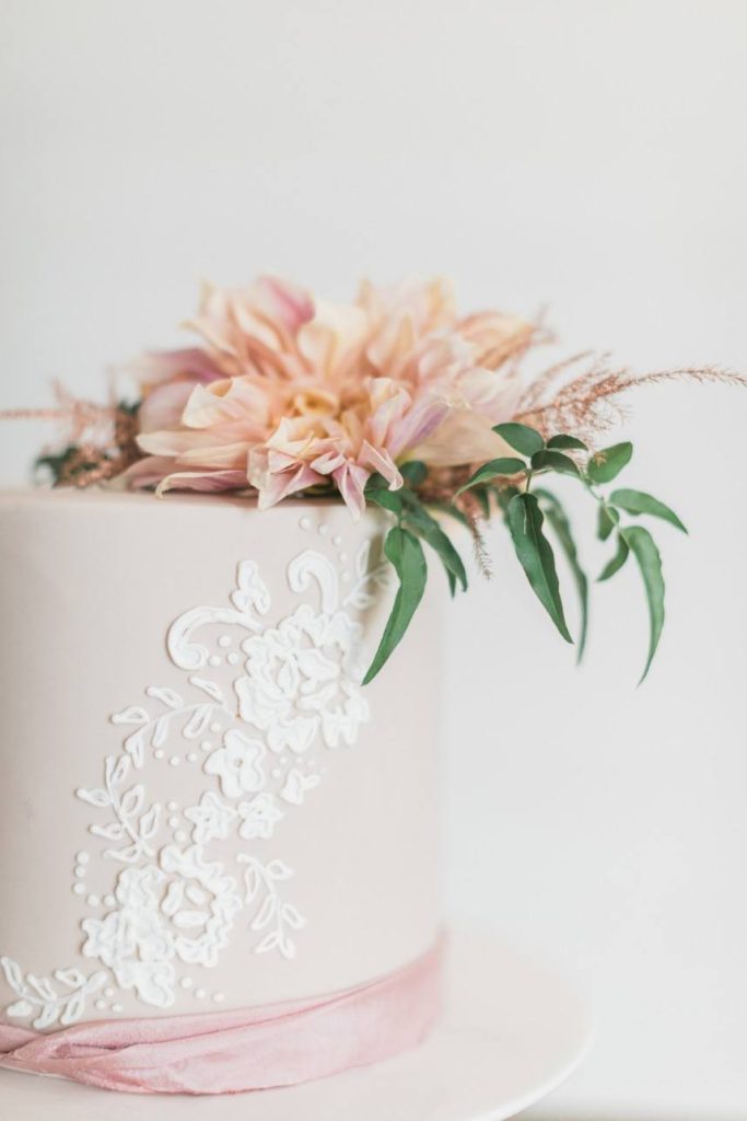 An organic and fresh scene at a beautiful modern farmhouse venue, this blush and lace wedding inspiration gives the fine art wedding style an approachable feel perfect for any couple! R&M Bledsoe Photography captured this bright and airy scene complete with lovely decor and thoughtful styling by Olivia at Souris Rose. To match the venue’s aesthetic, a farmhouse-style table and chairs are the focal point of the styled shoot, but the look is elevated with elegant blush dinnerware, gold flatware and delicate linens. The freeform, organic florals give the entire scene a whimsical feel while still keeping with the classic, romantic style. We love how the cakes integrate the color palette, the intricate detailing also seen on the incredible blush and lace gown from Unbridaled, and the florals as well. A collection of different cakes is such a fun way to spice up your dessert bar and show off different elements of your day’s theme! Soft and timeless calligraphy and delicate stationery round out this lovely blush and lace scene, every detail of which inspires us to embrace the fine art style in a way that makes sense for the everyday bride. Cheers!