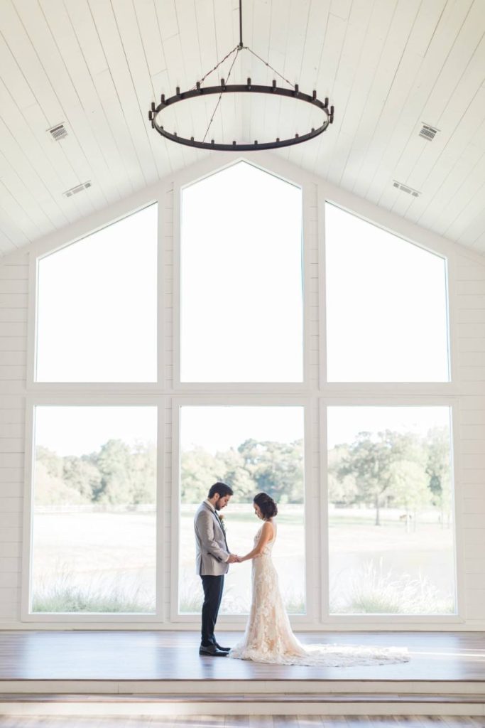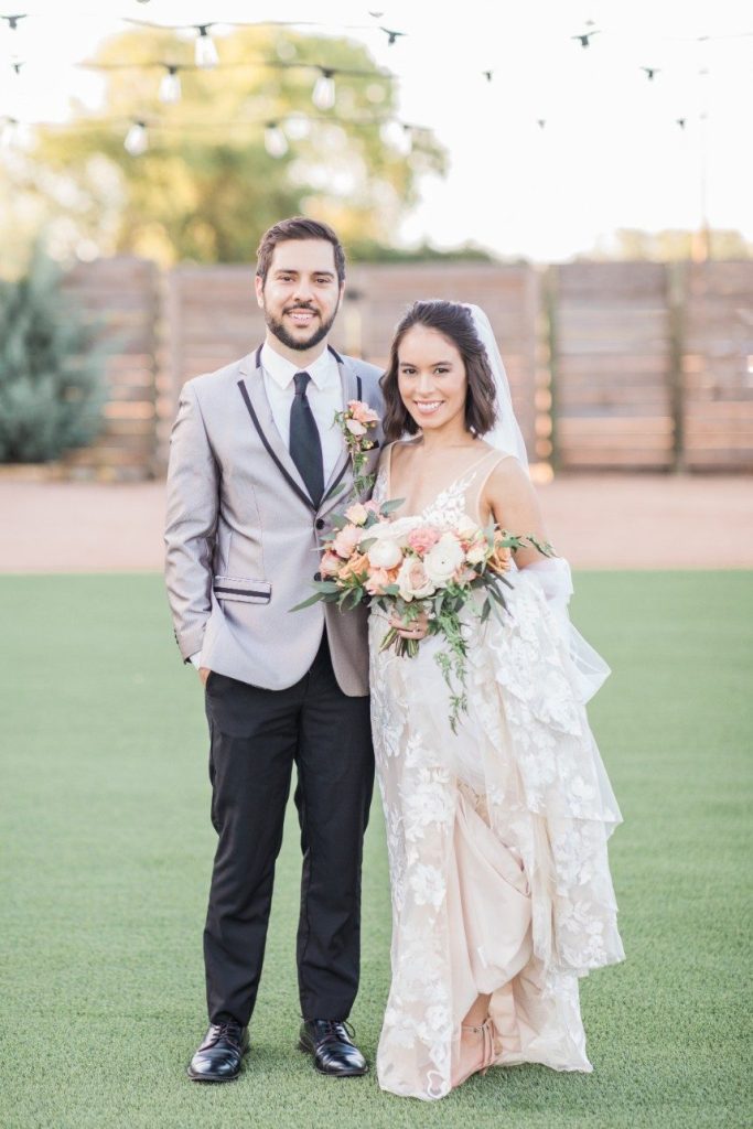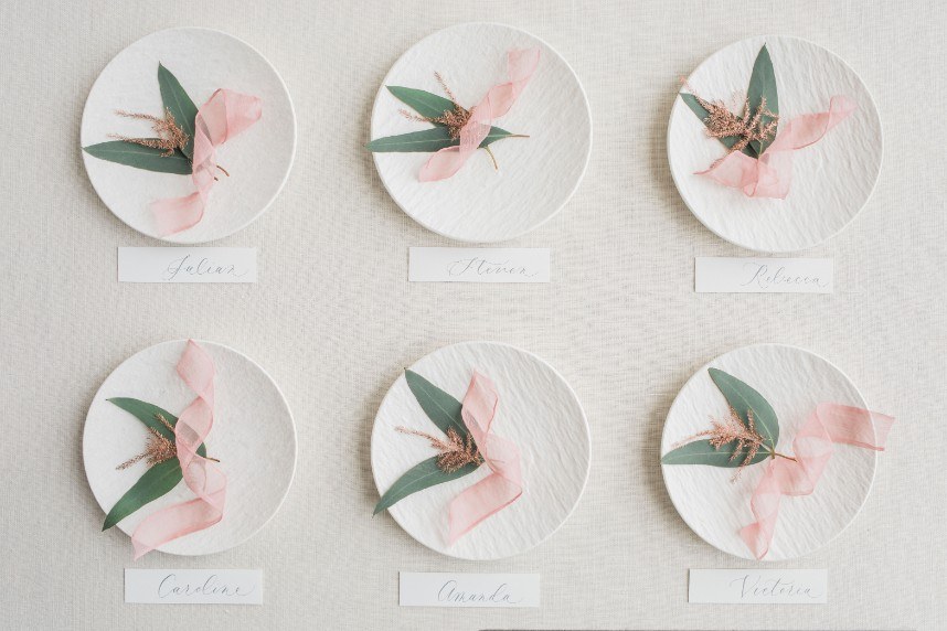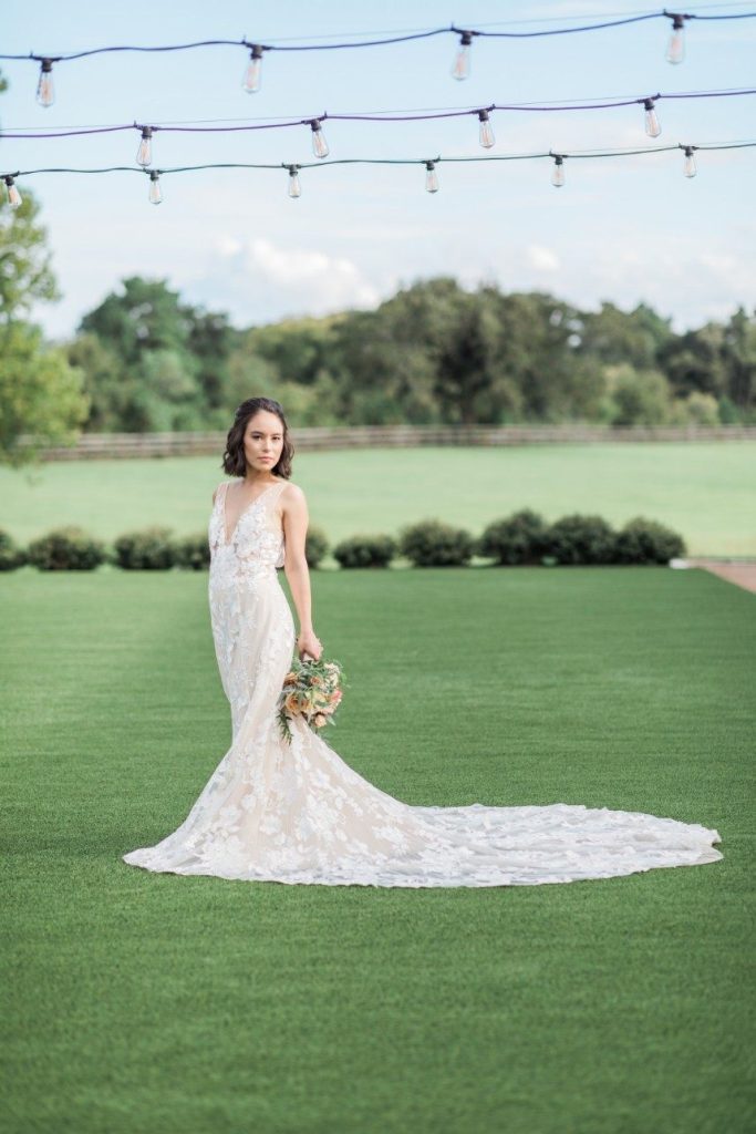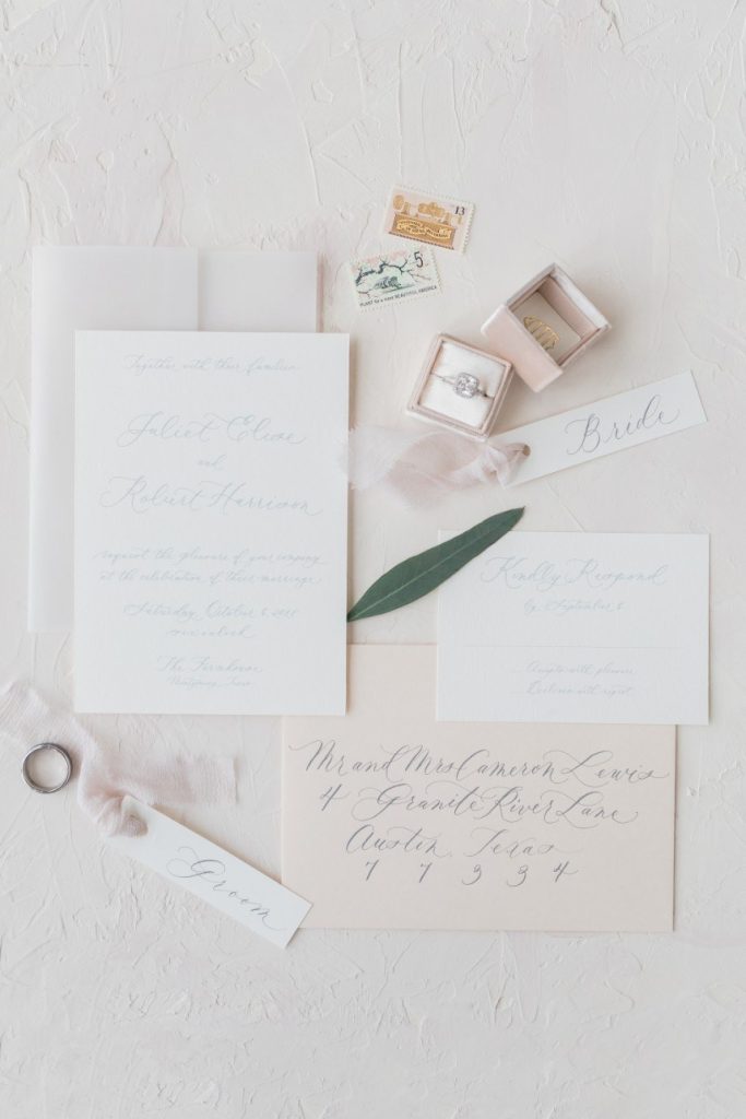 An organic and fresh scene at a beautiful modern farmhouse venue, this blush and lace wedding inspiration gives the fine art wedding style an approachable feel perfect for any couple! R&M Bledsoe Photography captured this bright and airy scene complete with lovely decor and thoughtful styling by Olivia at Souris Rose. To match the venue’s aesthetic, a farmhouse-style table and chairs are the focal point of the styled shoot, but the look is elevated with elegant blush dinnerware, gold flatware and delicate linens. The freeform, organic florals give the entire scene a whimsical feel while still keeping with the classic, romantic style. We love how the cakes integrate the color palette, the intricate detailing also seen on the incredible blush and lace gown from Unbridaled, and the florals as well. A collection of different cakes is such a fun way to spice up your dessert bar and show off different elements of your day’s theme! Soft and timeless calligraphy and delicate stationery round out this lovely blush and lace scene, every detail of which inspires us to embrace the fine art style in a way that makes sense for the everyday bride. Cheers!