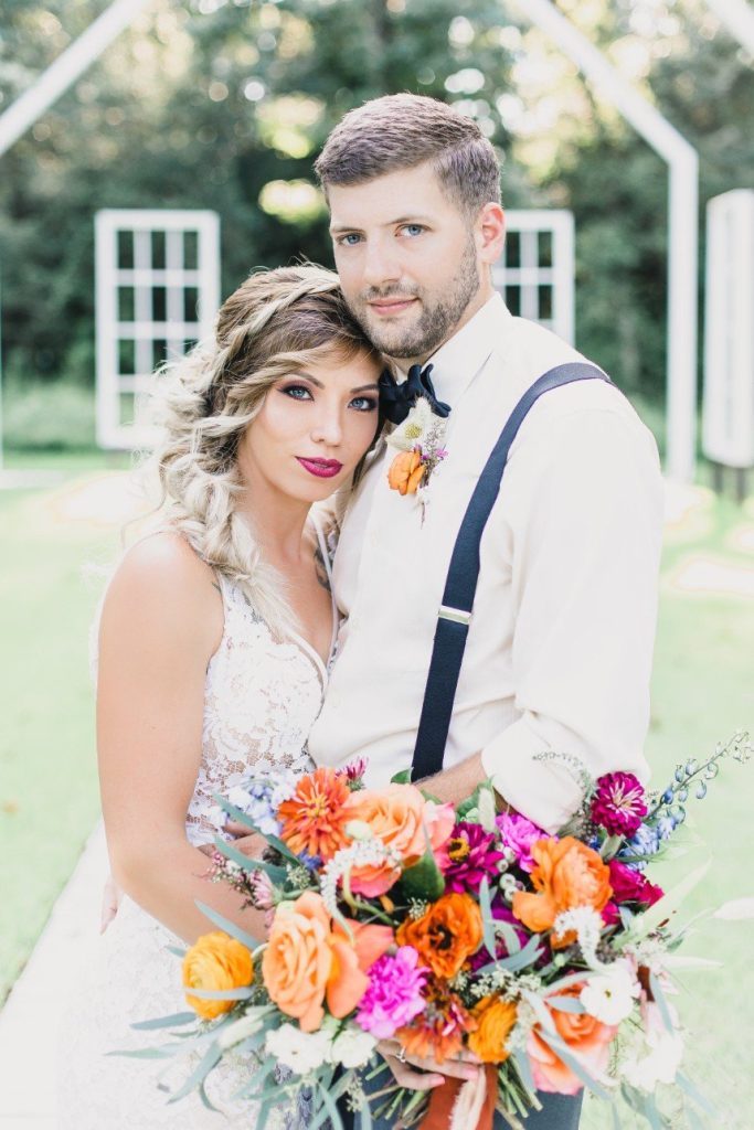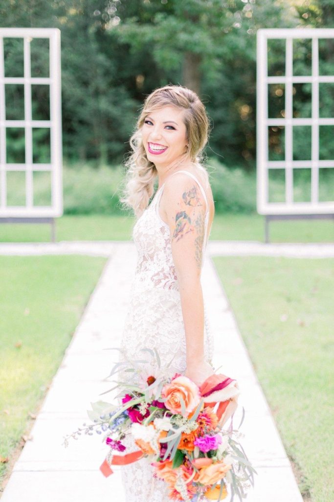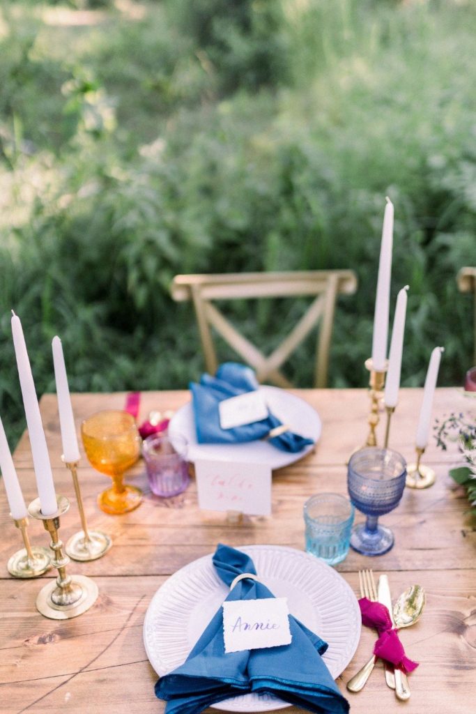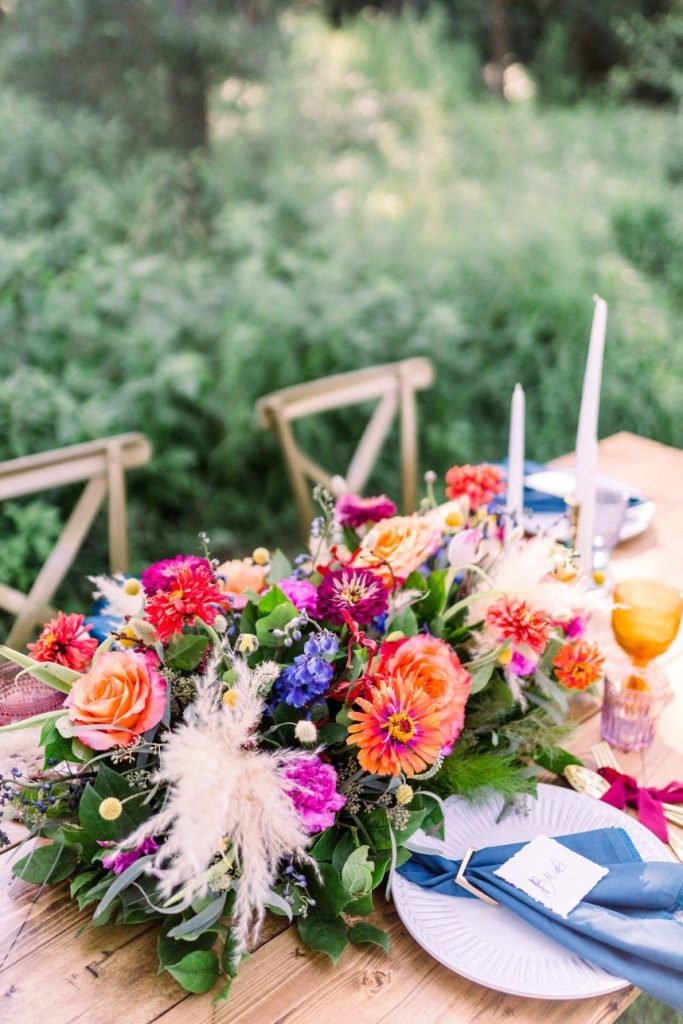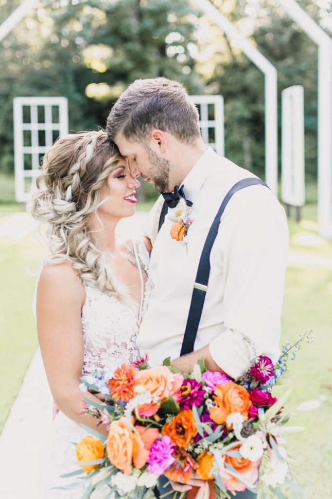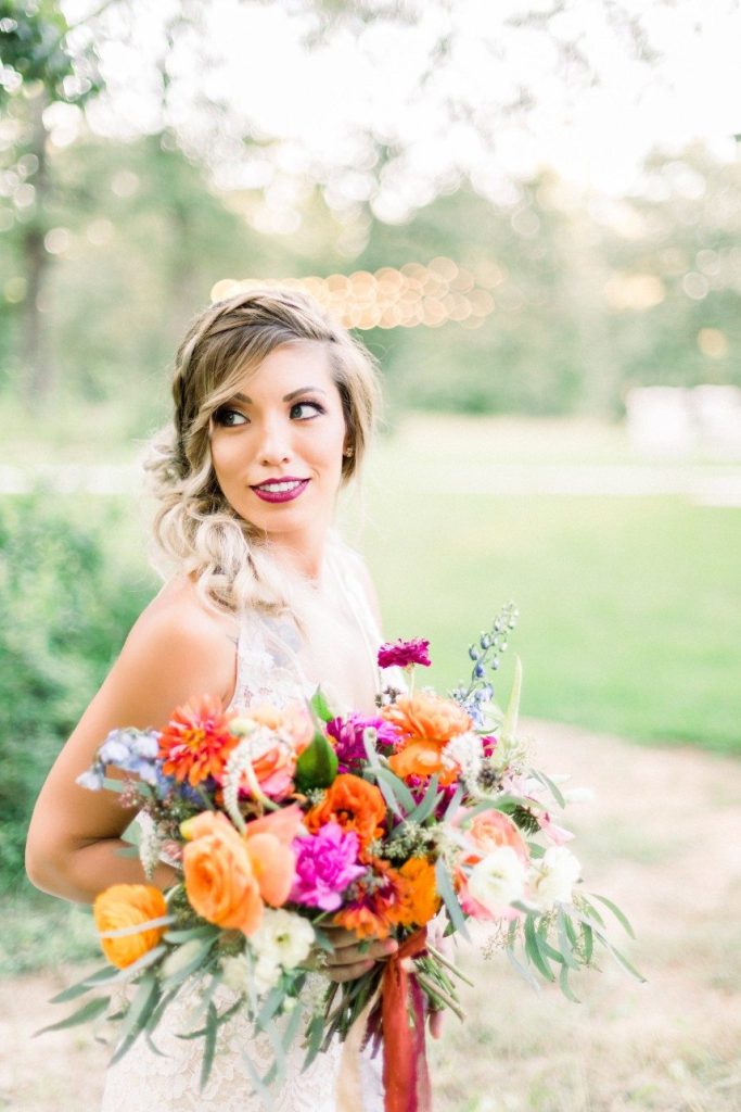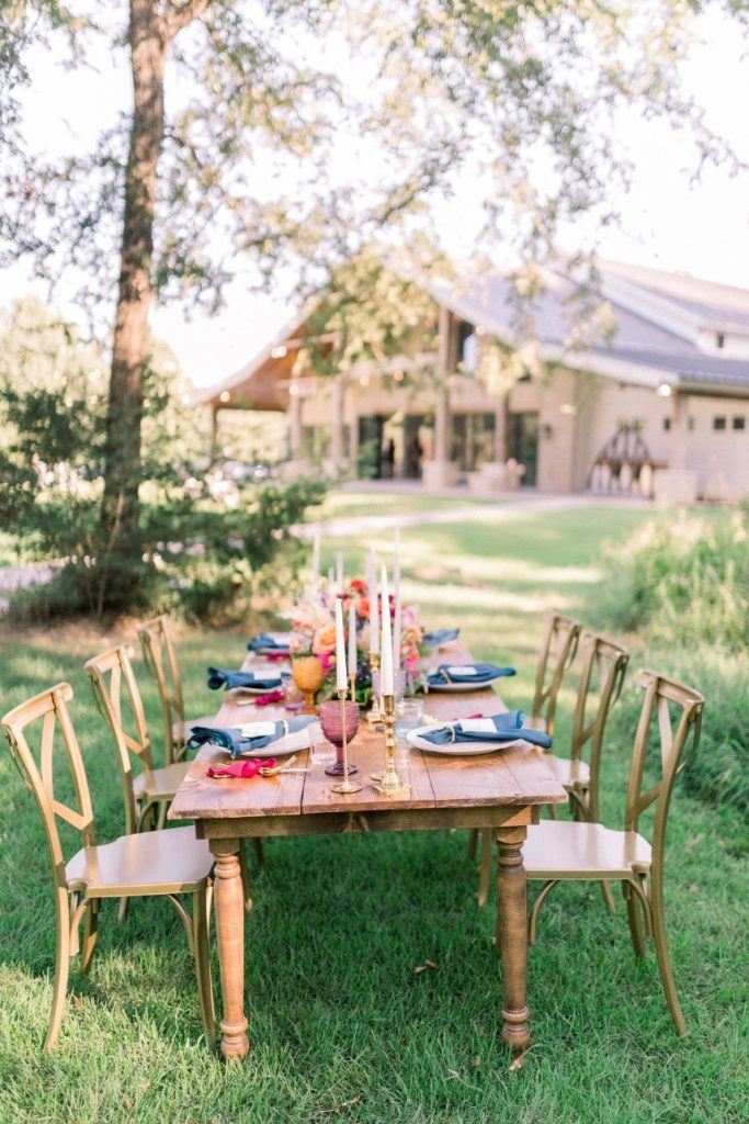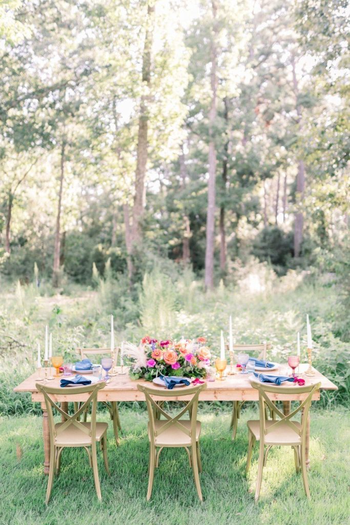 Beneath The Meekermark’s signature tree-lined open-air chapel with gorgeous golden hour light peeking through, this styled shoot from Sara Abdulaziz Photography features a colorful palette with boho in bloom and is chock full of warm weather wedding inspiration! The statement-making florals took center stage in this scene, with textured feathery fronds softening up bold, organic and loosely gathered bouquets in a quintessential boho style. The cheerful, saturated florals were juxtaposed against a masculine farmhouse table with blue napkins, blue mercury glasses and metallic accents from Souris Rose. Watercolor calligraphy added a dainty feminine touch, letting the florals continue to shine throughout every element of the shoot, from the dessert table to the centerpiece arrangement and everywhere in between. We love how the florist chose a wide variety of blooms to keep things extra visually interesting! A form-fitting lace gown for the bride from Houston Bridal Gallery and a cascading boho braid were the perfect touches for her look, paired with the groom’s dapper suspenders in a blue hue tying the color palette together so nicely. We’re smitten with this summery scene at The Meekermark and love how every detail reflects the boho in bloom theme so beautifully!