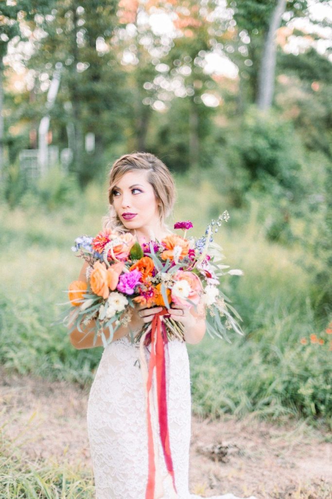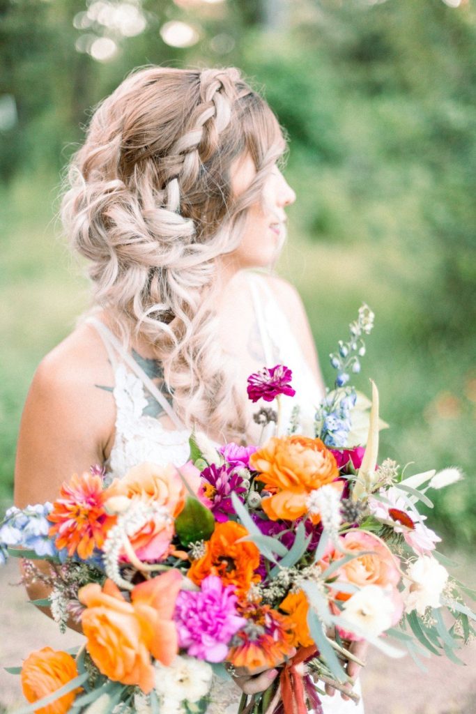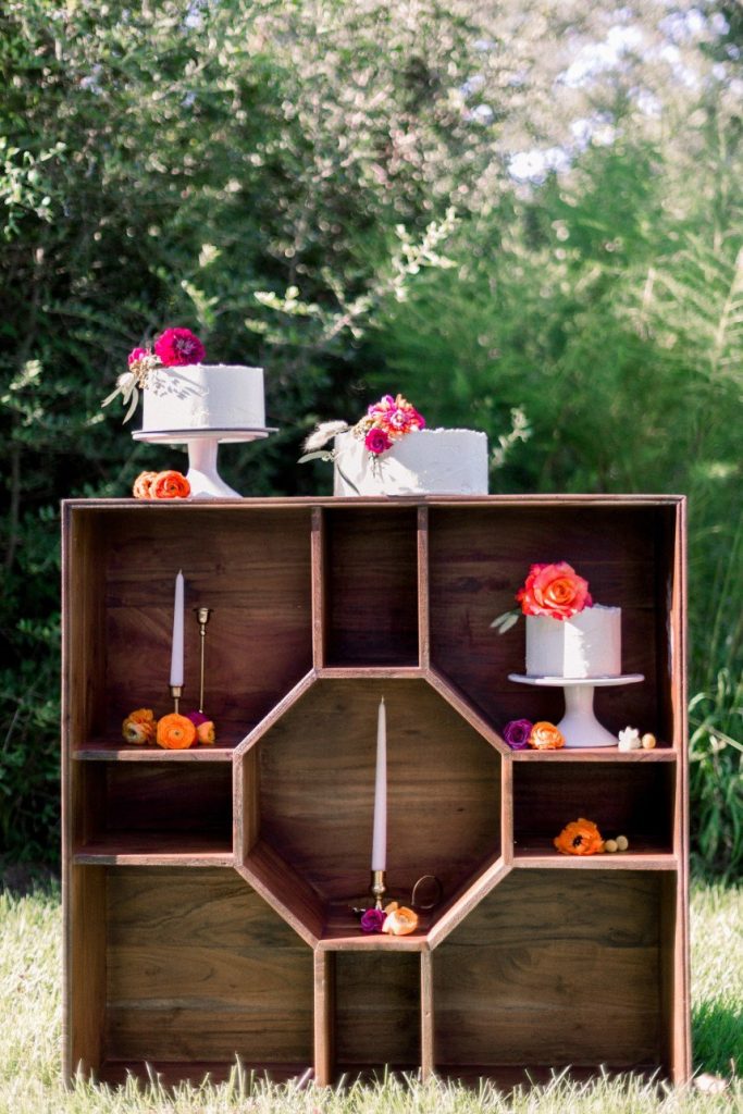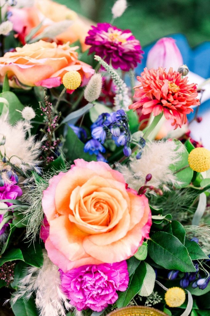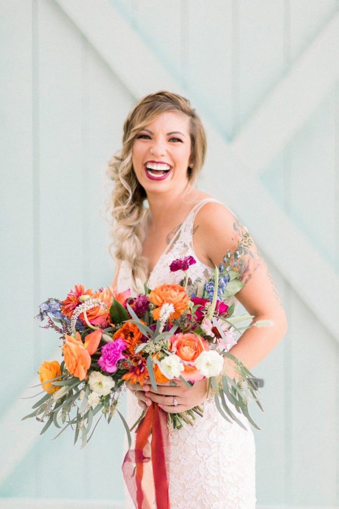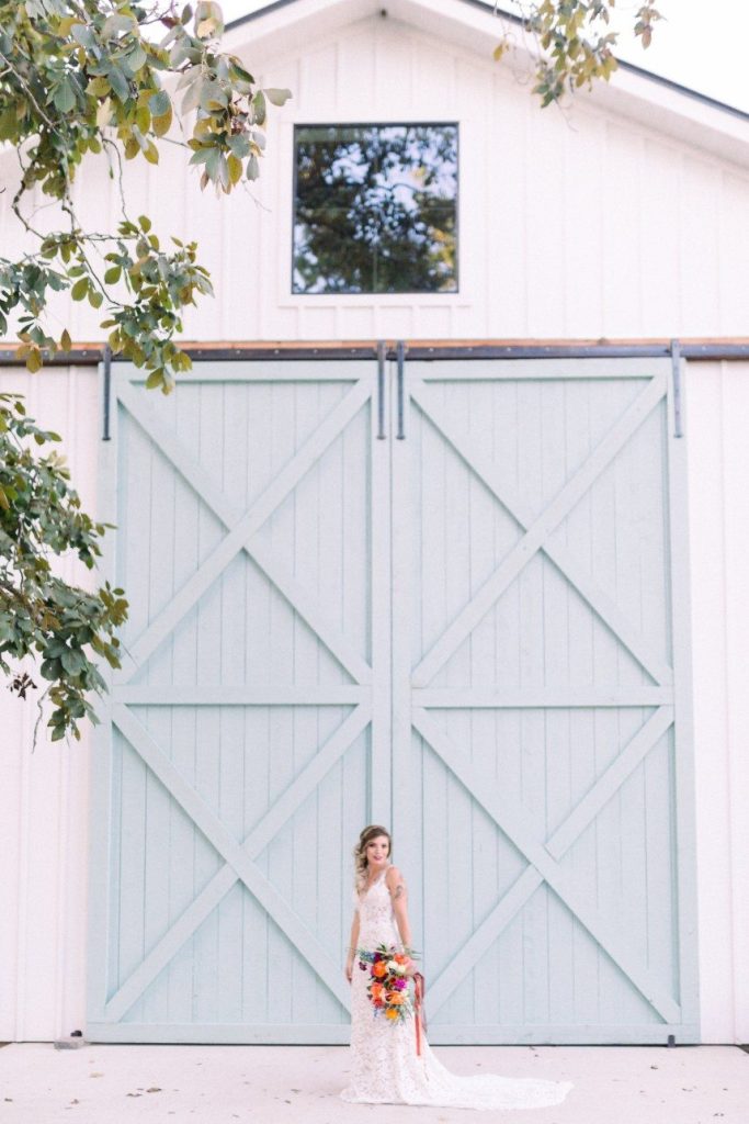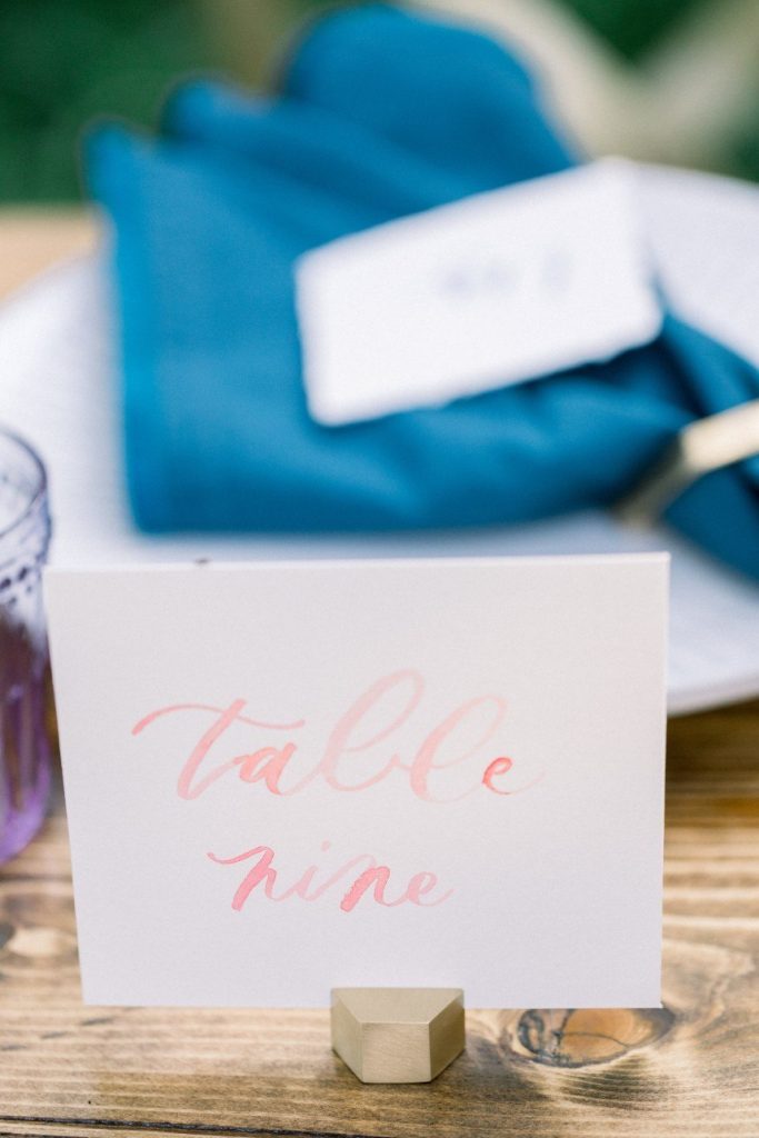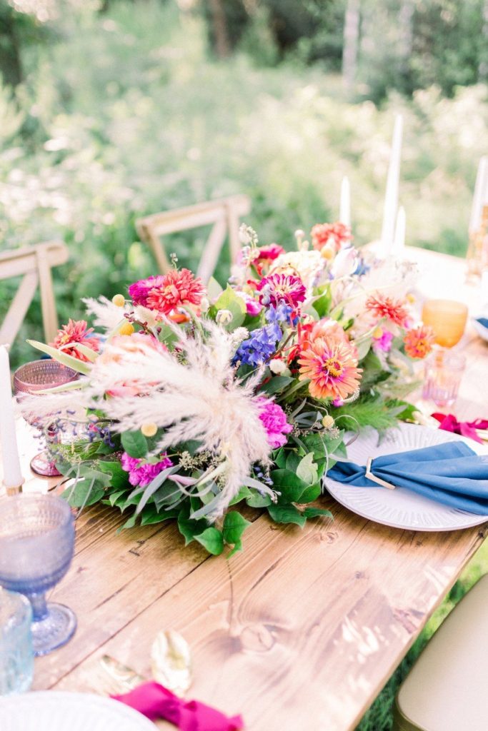 Beneath The Meekermark’s signature tree-lined open-air chapel with gorgeous golden hour light peeking through, this styled shoot from Sara Abdulaziz Photography features a colorful palette with boho in bloom and is chock full of warm weather wedding inspiration! The statement-making florals took center stage in this scene, with textured feathery fronds softening up bold, organic and loosely gathered bouquets in a quintessential boho style. The cheerful, saturated florals were juxtaposed against a masculine farmhouse table with blue napkins, blue mercury glasses and metallic accents from Souris Rose. Watercolor calligraphy added a dainty feminine touch, letting the florals continue to shine throughout every element of the shoot, from the dessert table to the centerpiece arrangement and everywhere in between. We love how the florist chose a wide variety of blooms to keep things extra visually interesting! A form-fitting lace gown for the bride from Houston Bridal Gallery and a cascading boho braid were the perfect touches for her look, paired with the groom’s dapper suspenders in a blue hue tying the color palette together so nicely. We’re smitten with this summery scene at The Meekermark and love how every detail reflects the boho in bloom theme so beautifully!