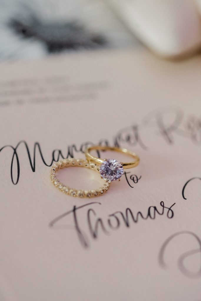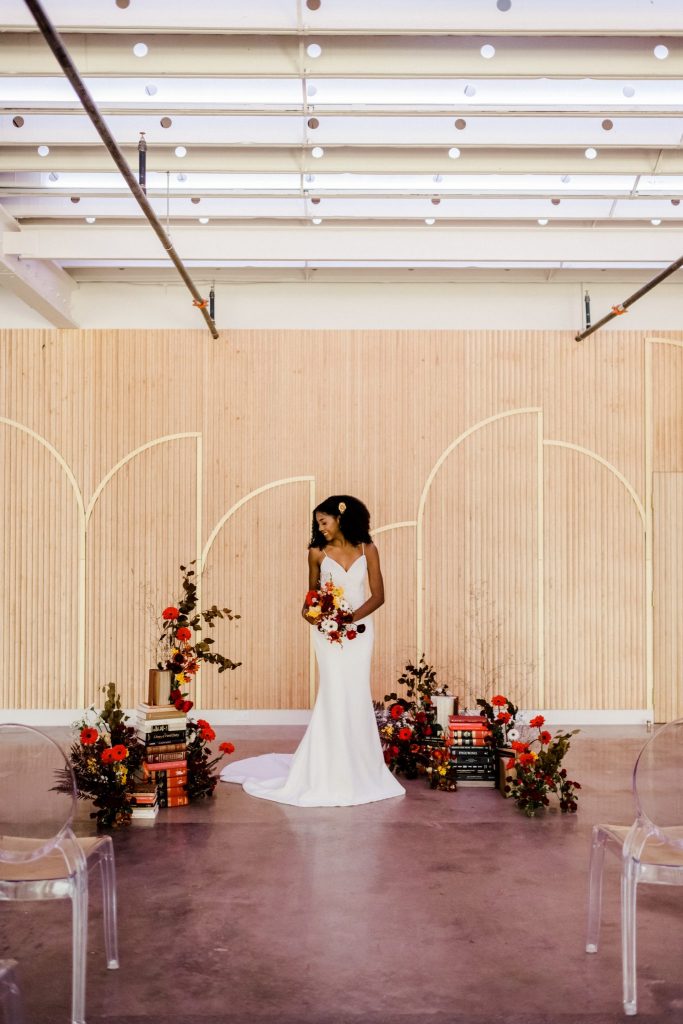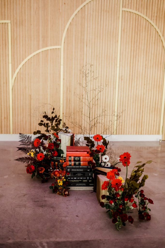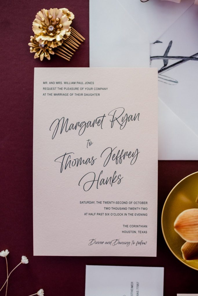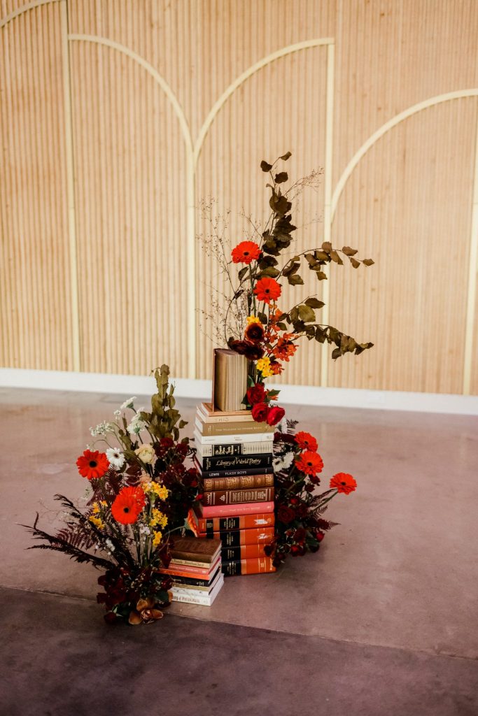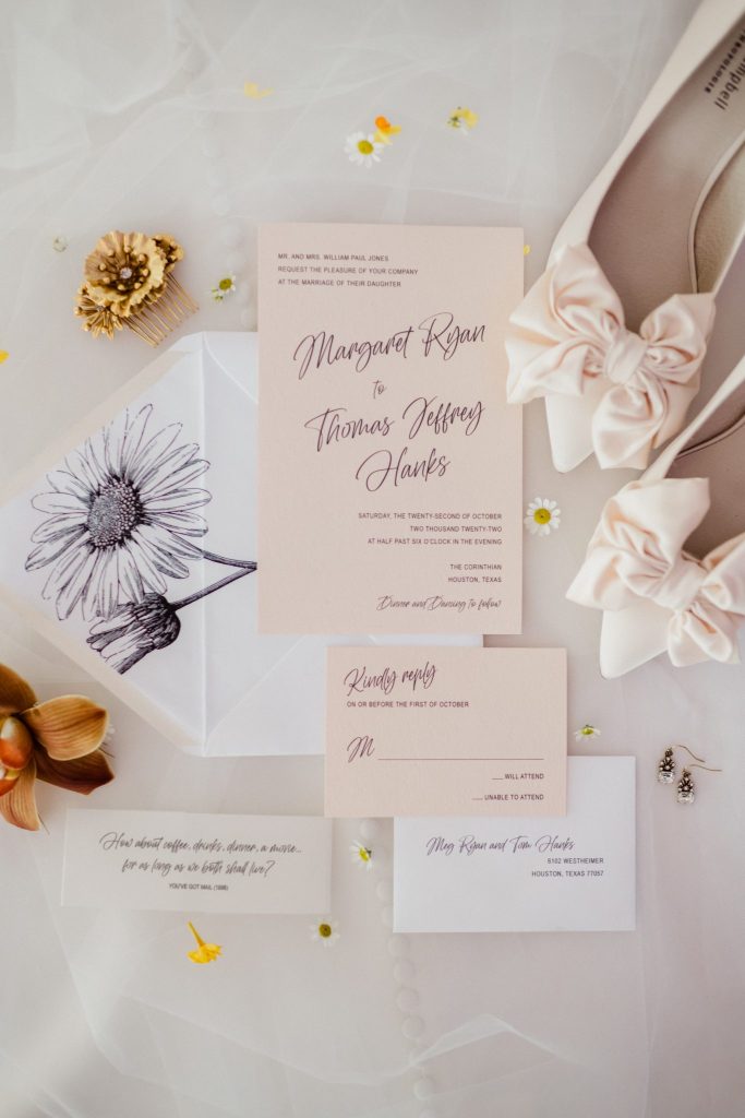 Captured at Ronin Harrisburg, a new and modern venue centrally located in downtown Houston, it provided an intimate space that we know the book lovers Joe and Kathleen would love just as much as us. The invitation suite from Bering’s played upon the modern architecture of Ronin Harrisburg and the You’ve Got Mail bookshop motif. Hollis with Bering’s describes the invitation suite as “Classic and traditional in wording but modern in style. I used stylistic typography, a mixture of sans serif with a rough, almost messy calligraphic style of script.” The “friendliest flower” printed on the liner of the invitation created an eye-catching detail. Of course, the nod to the “friendliest flower” didn’t stop here. With the daisy being Meg Ryan’s character Kathleen’s favorite flower, Edges Wild Studio’s wanted to capitalize on this by using oversized daisies. Edges Wild Studio also drew inspiration from “the back wall in the Ronin Harrisburg. The space includes architectural elements that evoke the silhouette of an opening book. I played upon that by styling arching flower moments in front of the wall to create a layered, deep-in-the-bookstore-shelves feel. I also wanted to make the flowers look as if they were sprouting up or spilling out of the pages.” Kathleen Kelly also makes it known to her pen pal Joe in You’ve Got Mail that her favorite book is Pride and Prejudice. Distressed pages from Kathleen’s favorite love story cascaded down the front of the cake made by The Flour Petal Bakery. This cake is any book lover’s dream!