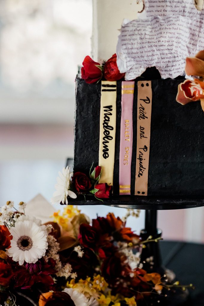 From the cake baker, The Flour Petal Bakery: You’ve Got Mail is a movie so near to my heart since I have always been such a huge book lover! With the movie set in New York City I just knew I wanted to do something to remind me of those skyscrapers! The cake shape being square rather than round plus the contrasting black and white really captured this feel for me. The distressed pages of Pride and Prejudice cascading down the front of the cake along with fresh flowers represent the dichotomy of love between Kathleen and Joe with her being more traditional and warm in contrast with him being more cool and modern.”
