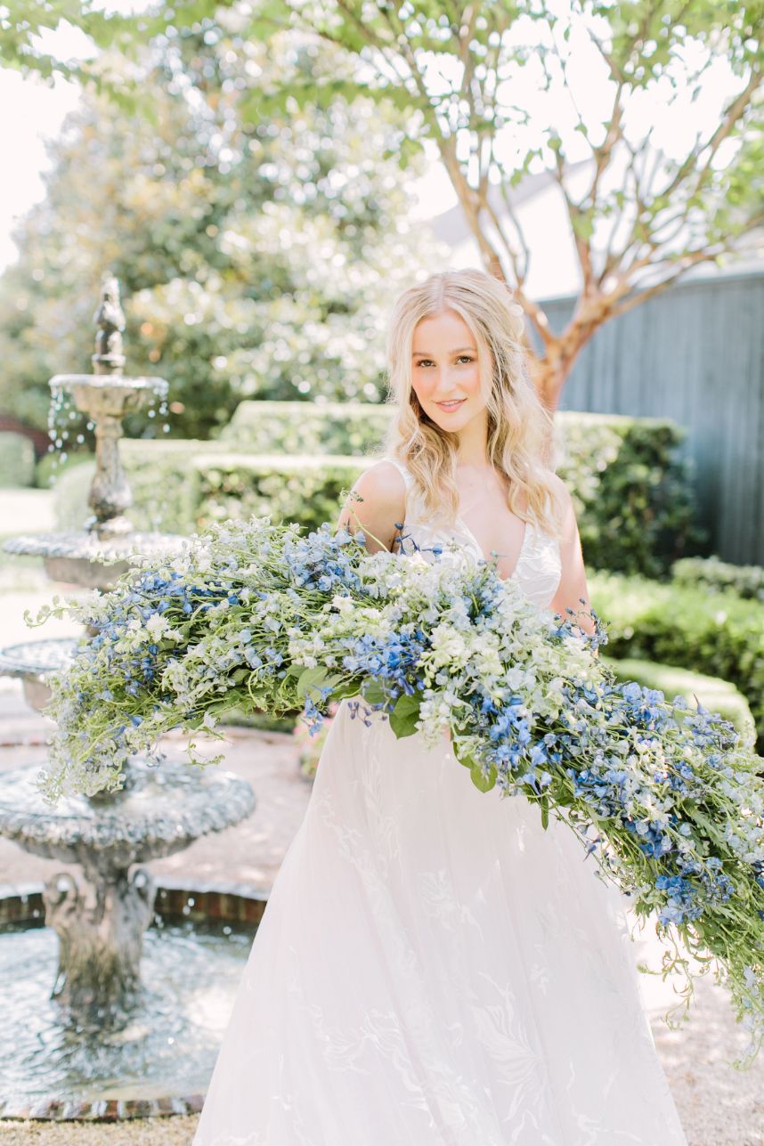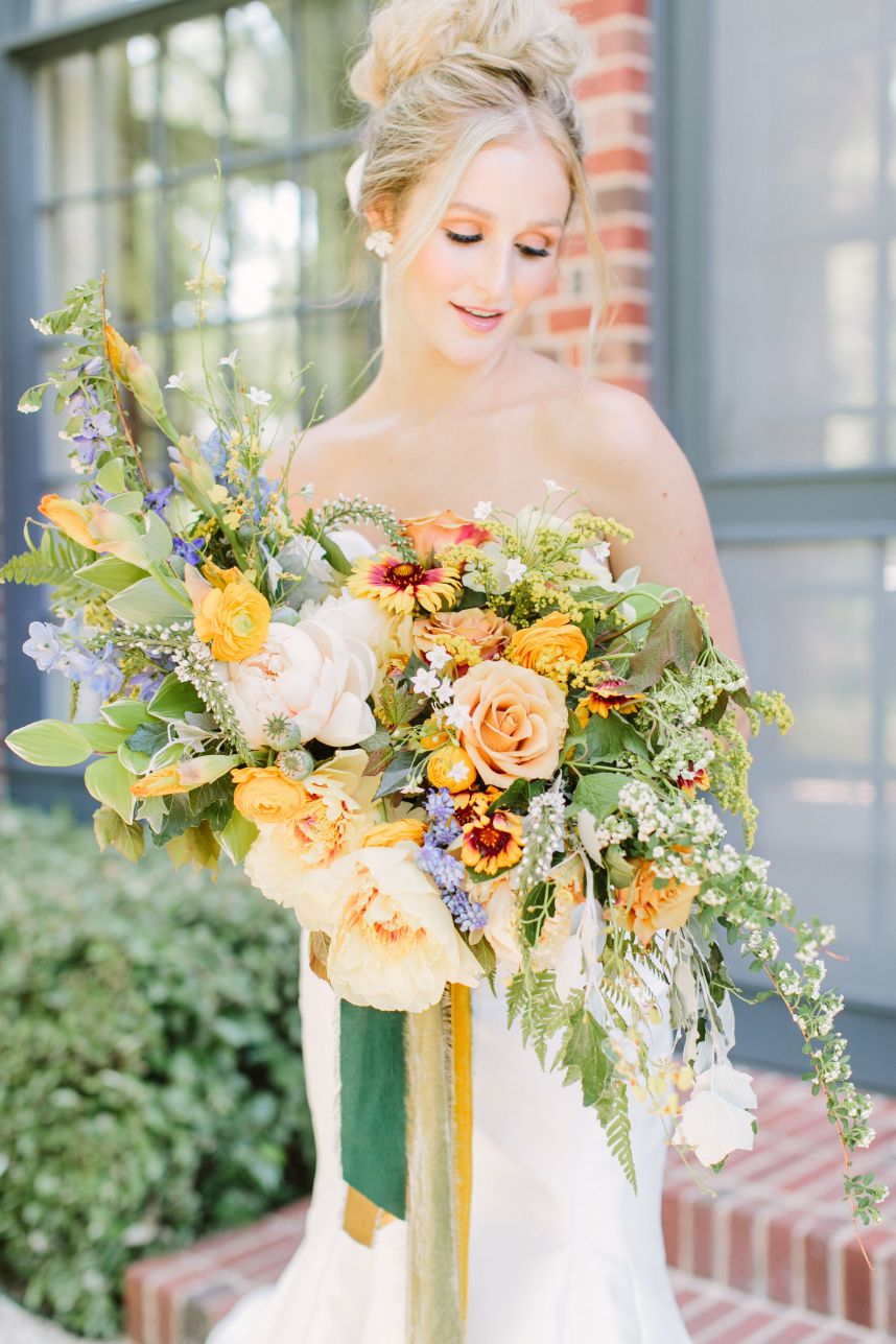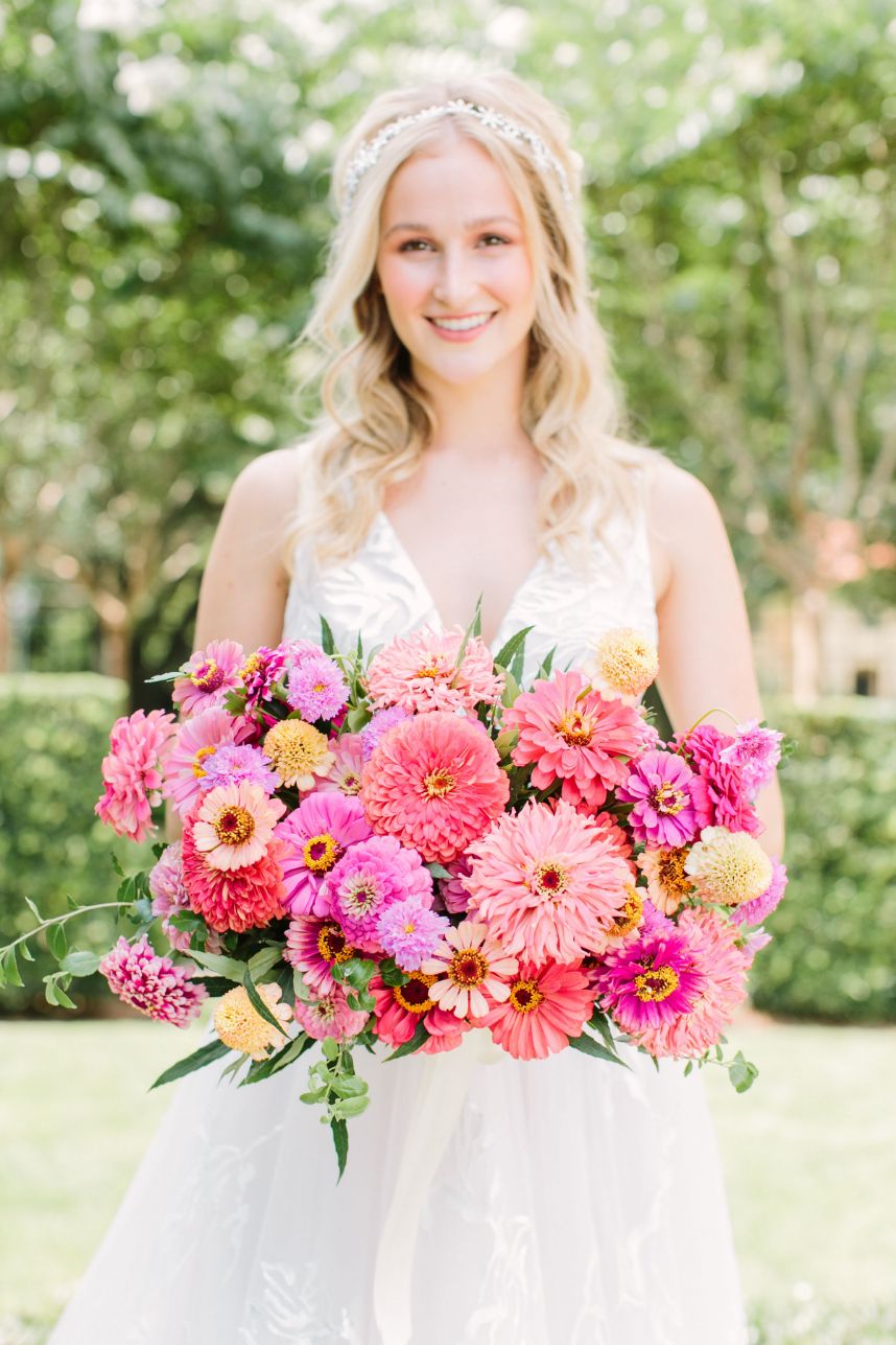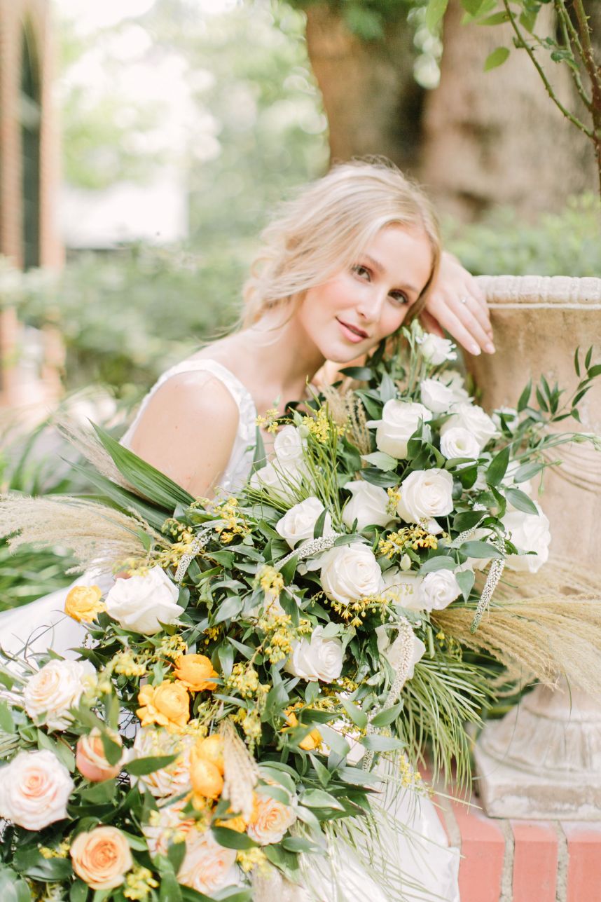 Okay, brides: ready to swoon? Take a look at these bountiful blooms – overflowing bouquets from Houston’s best florists! We spent the most beautiful day at Lanson B. Jones & Company‘s private garden with some of the top floral designers in the city, watching them create incredible freeform bouquets and cascading installations each in their own unique style. No matter the types of florals you’re drawn to, you’ll find inspiration in this collection, no doubt! To show off these amazing and bountiful blooms, our model paired each bouquet with a lovely gown from Mia Bridal Couture and a different hair and makeup style from Sunkissed and Made Up. Mustard Seed Photography captured all the bouquets in her signature light, bright and colorful style, showing off each flower just perfectly. We hope you love these blooms as much as we do! Cheers!