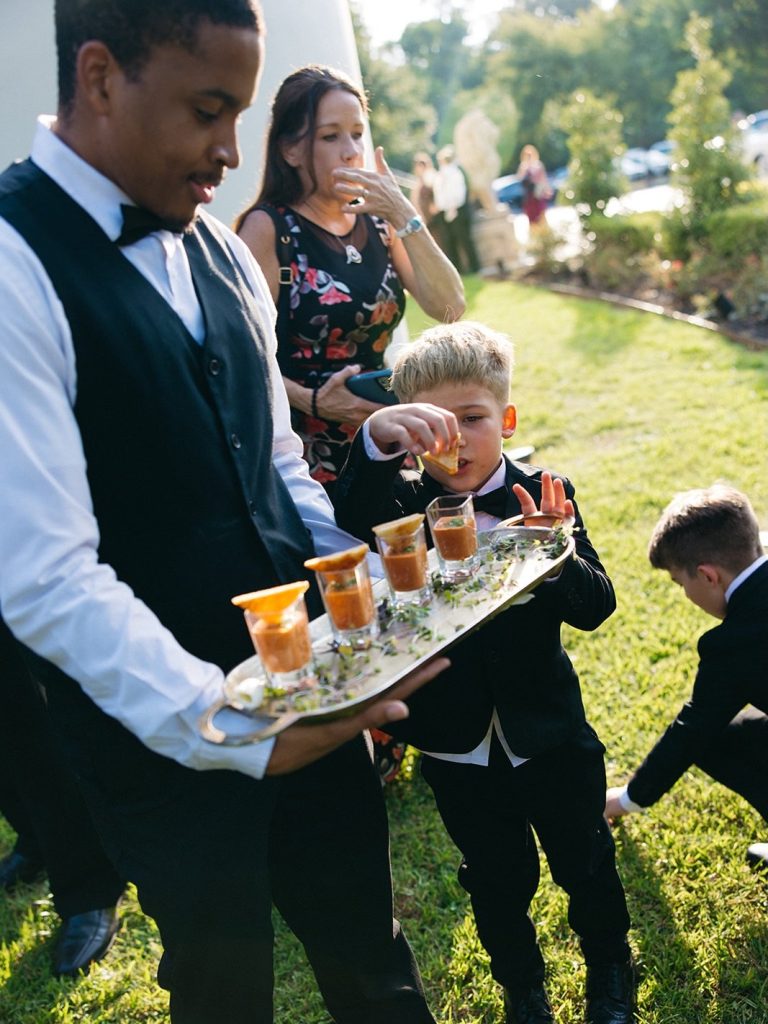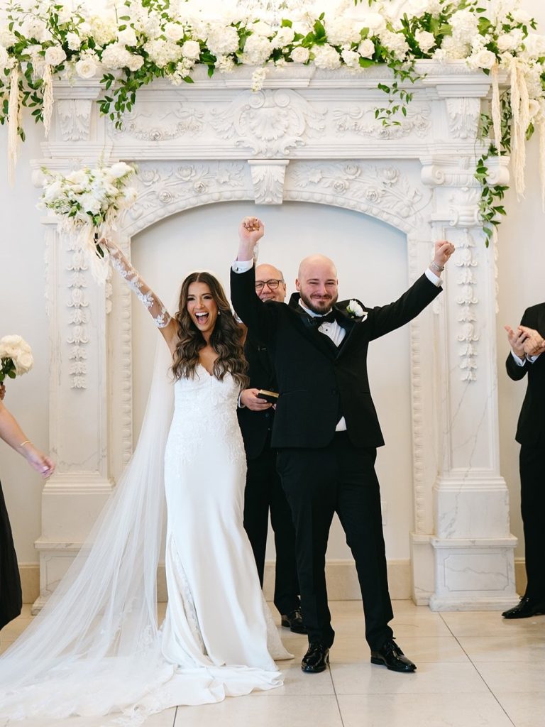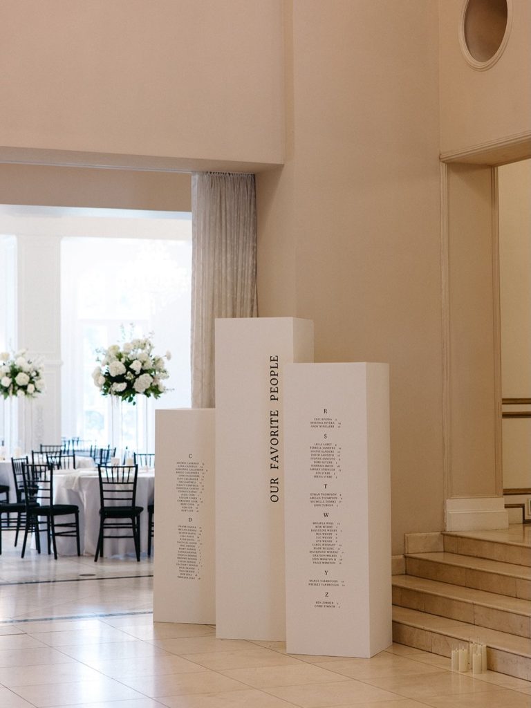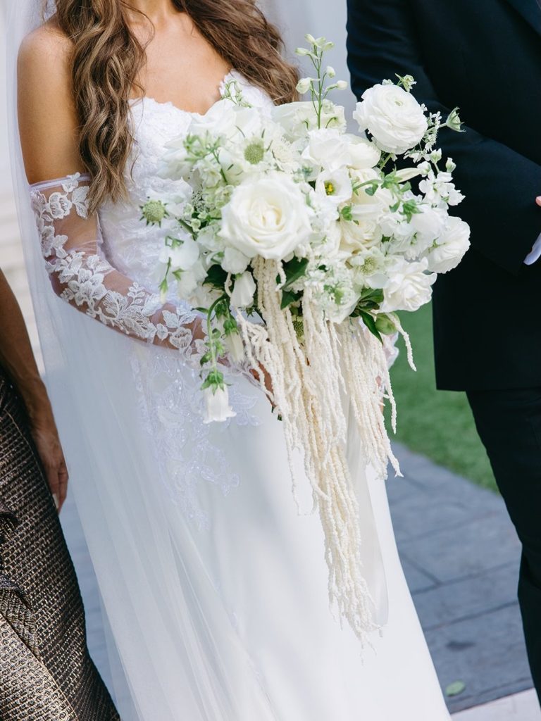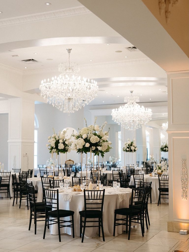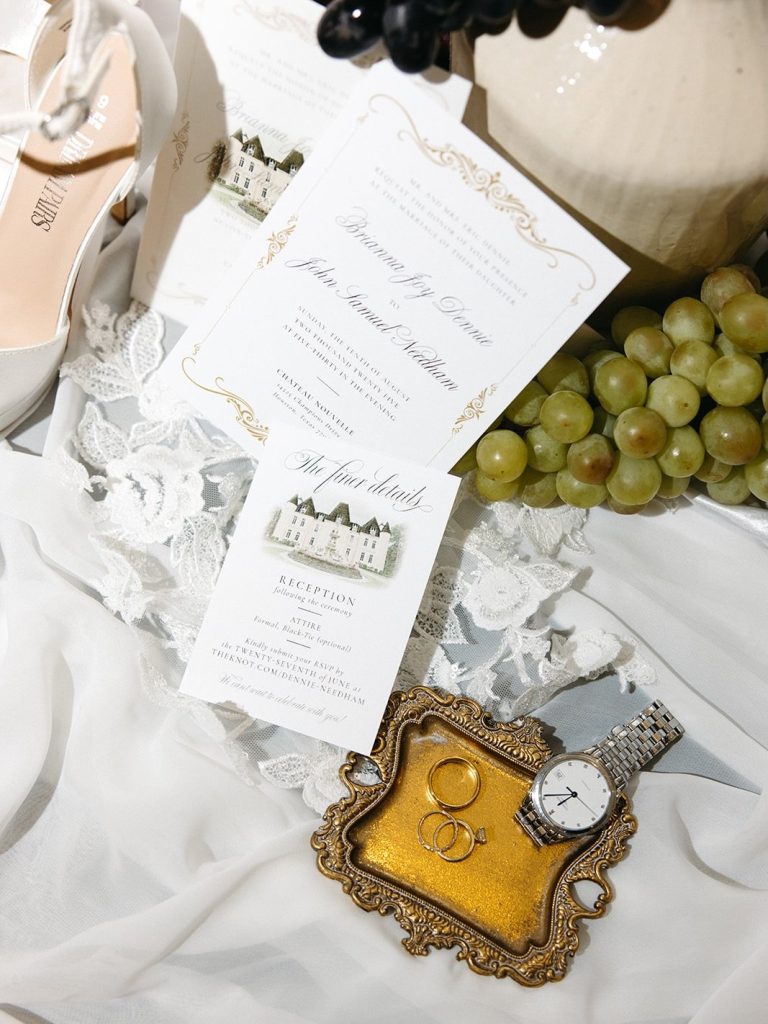 Brianna & John’s wedding at Chateau Nouvelle was timeless with an Italian-inspired feel woven throughout the day. Warm mocha, white, and green tones carried through the reception space, paired with candlelit round tables and a four-tier vintage cake from Bavarian Cakery with detailed piping.