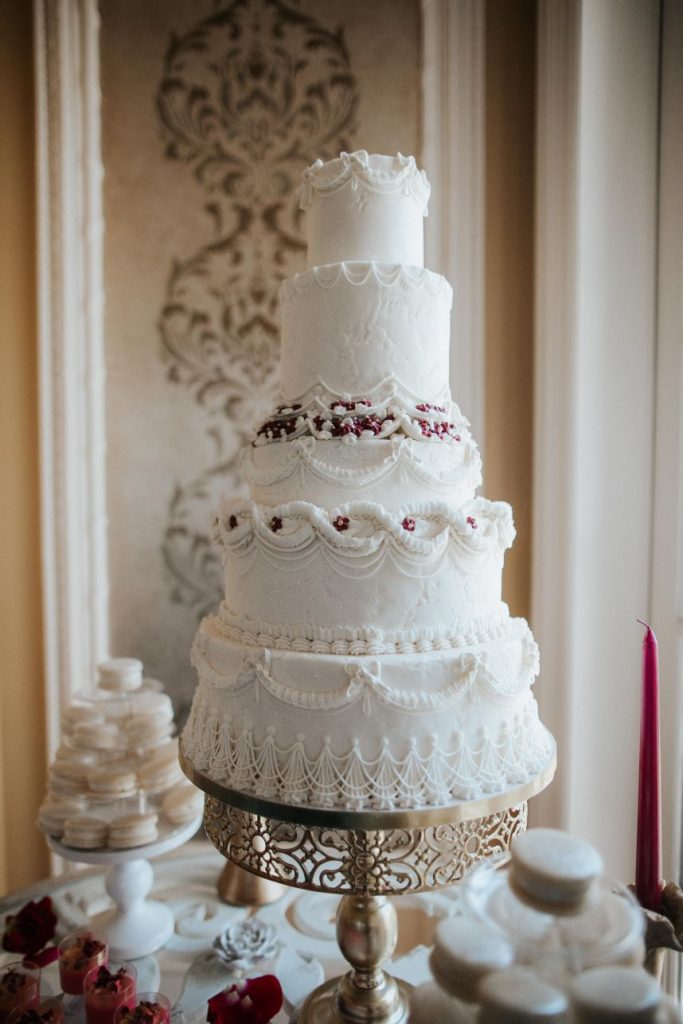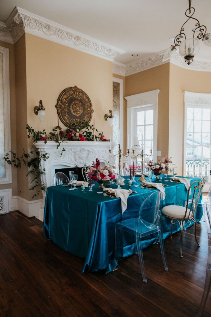 Planned and designed by the creative Lillie Jane Designs, this styled shoot is a Brigerton-inspired blend of the upscale elegance of a modern bride and the rich vibrance of the Victorian era! Infused with bright jewel tones like teal and magenta, romance is overflowing in each wedding scape that looks right out of a dream. Regal teal linens and decor from Party Time Rentals in this reception room are a perfect blend of classic and modern styles, and what better seating to set the scene than alternating acrylic ghost chairs and scrolled metal bistro chairs alike. Nearby, Alchemy Bake Lab has created a dessert table that looks simply divine laden with an elegant and lacey five-tiered cake design, crisp white macarons, and botanical-topped sweets too. These brides look breathtaking, each modeling one of three very different wedding gown looks from Evoke: The Bridal Experience, each with its own distinct elegance and flair! Whether your aim is classic and romantic or nontraditional and regal, they offer gowns to suit every style and they are captured so stunningly here by Rkm Photography, LLC. Read on for a note from the planner about the vision and design behind this Bridgerton-inspired wedding shoot and the French couture it incorporates. Cheers!