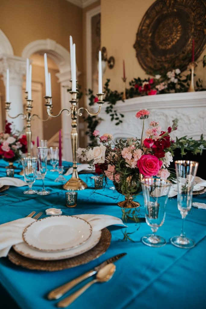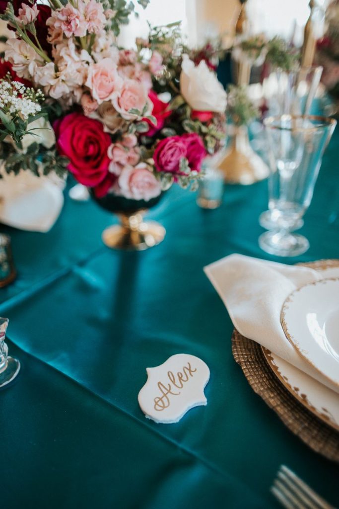 From the planner, Sabrina Lee of Lillie Jane Designs: “French couture meets Bridgerton! Like everyone else, I binge-watched Bridgerton in a day and absolutely had to shift my original modern French couture wedding vision to a Bridgerton-inspired masterpiece. Lots of gold, bright pink tones, with teal accents shined so perfectly in the decadently designed Sandlewood Manor house. Couples are looking for more originality and personalization in their wedding designs but still want a classy, inviting look. This design brought the boujee taste of a modern bride and the rich vibrance of the Victorian era together in perfect harmony.