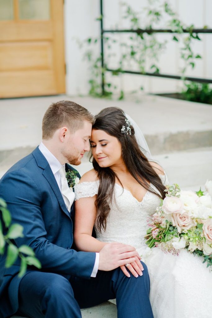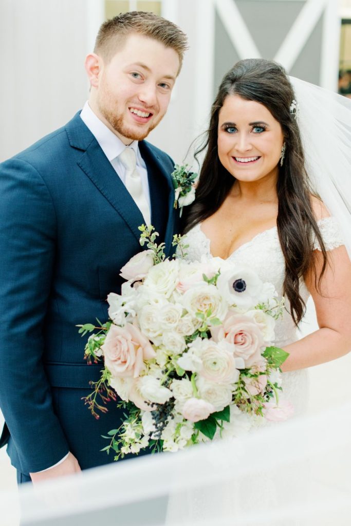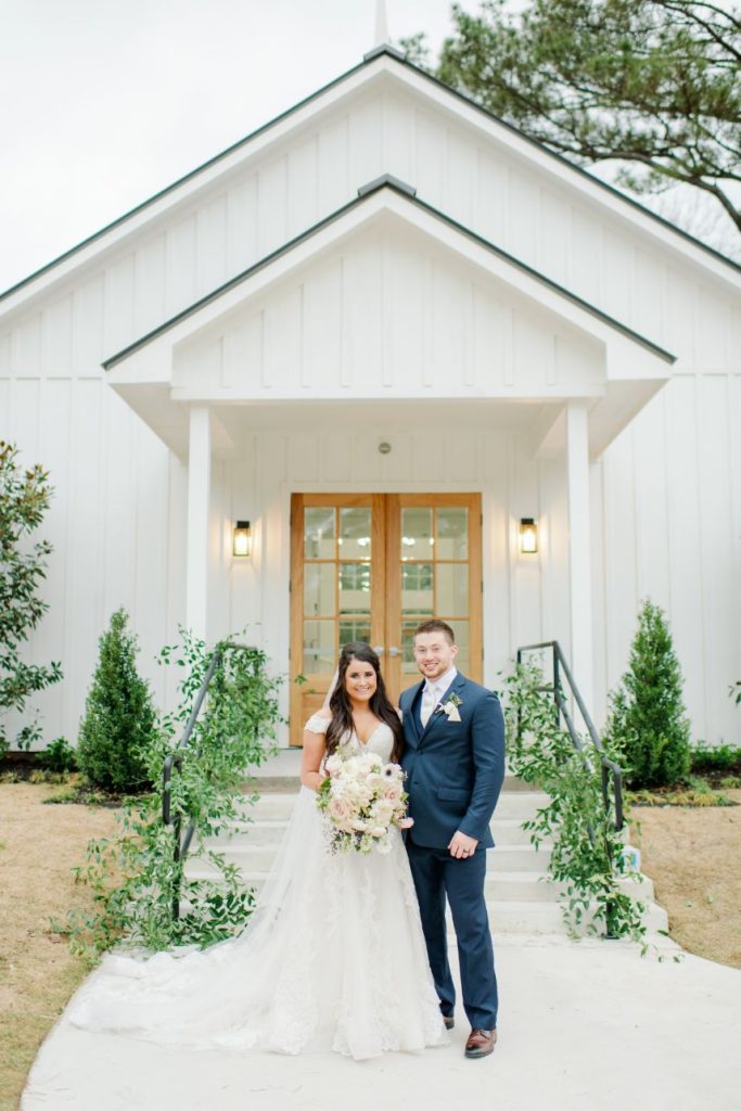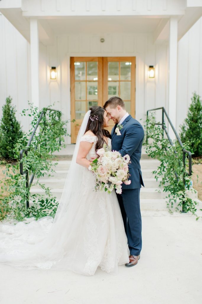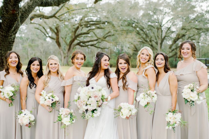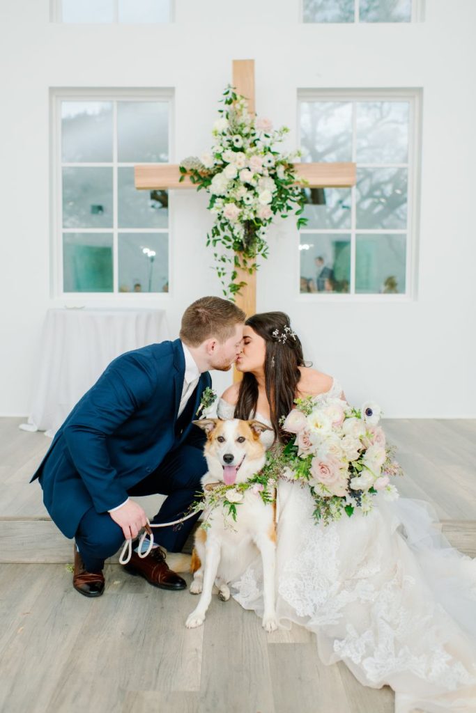Kayla and Conner’s dream wedding came in the form of this modern farmhouse affair. In a stately palette of champagne, blush, and classic navy, their long-time romance came to fruition in the most flawless way possible. Kati Hewitt Photography was there for it all in their journey, starting with their sweet engagement photos that included Kayla and Connor’s pup Dixie. Their fur baby went on to be in Kayla’s bridal session as well as being the dog of honor in this wedding. How precious! Before the big day, bridesmaids were treated to a luncheon at The Woodlands Country Club where they celebrated their bride-to-be. The morning started with Kayla and her girls getting glammed up by the hair and makeup pros at Butter Artistry while clad in matching pajamas in the bridal suite. After getting into her stunning off-the-shoulder gown and accessories from Brickhouse Bridal, Kayla brought her bridesmaids out to the patio where she caught their adorable reactions just before sharing a teary-eyed first look with her dad. Then, she walked down the aisle to the start of her forever with Connor! Their ceremony was filled with tons of memories that everyone will cherish forever. From Connor’s reaction when the chapel doors opened to the pair walking out as husband and wife, each moment melts our hearts over and over again! Mr. and Mrs. Boster popped a bottle of champagne to celebrate and made their grand entrance into the reception. It’s safe to say the party got started at the end of the first dance when Connor picked up Kayla and spun her around to the tune of Royal Dukes Band and their jumping live music! A full evening of festivities and fun made it a night they will never forget. Read on for a note from the bride about one of the biggest things she learned while planning this modern farmhouse wedding. Cheers to the Bosters!