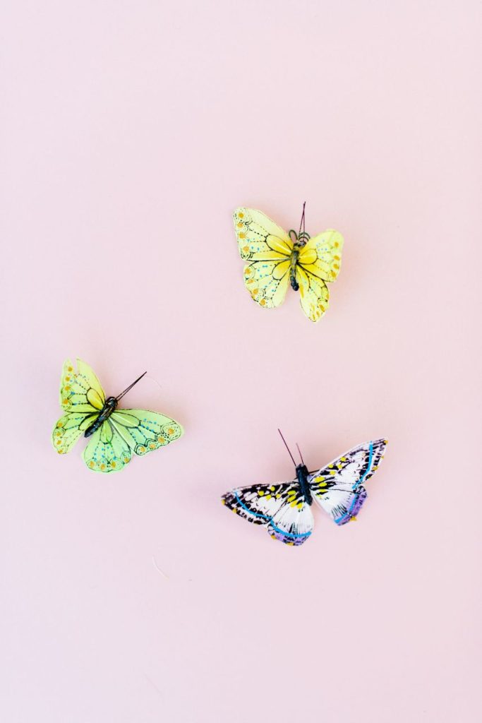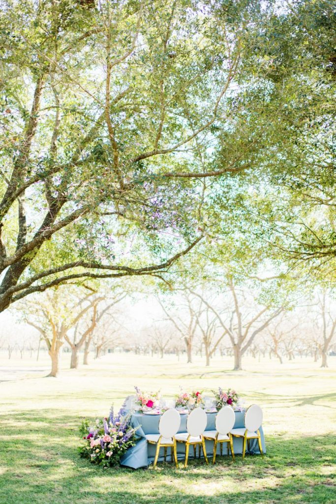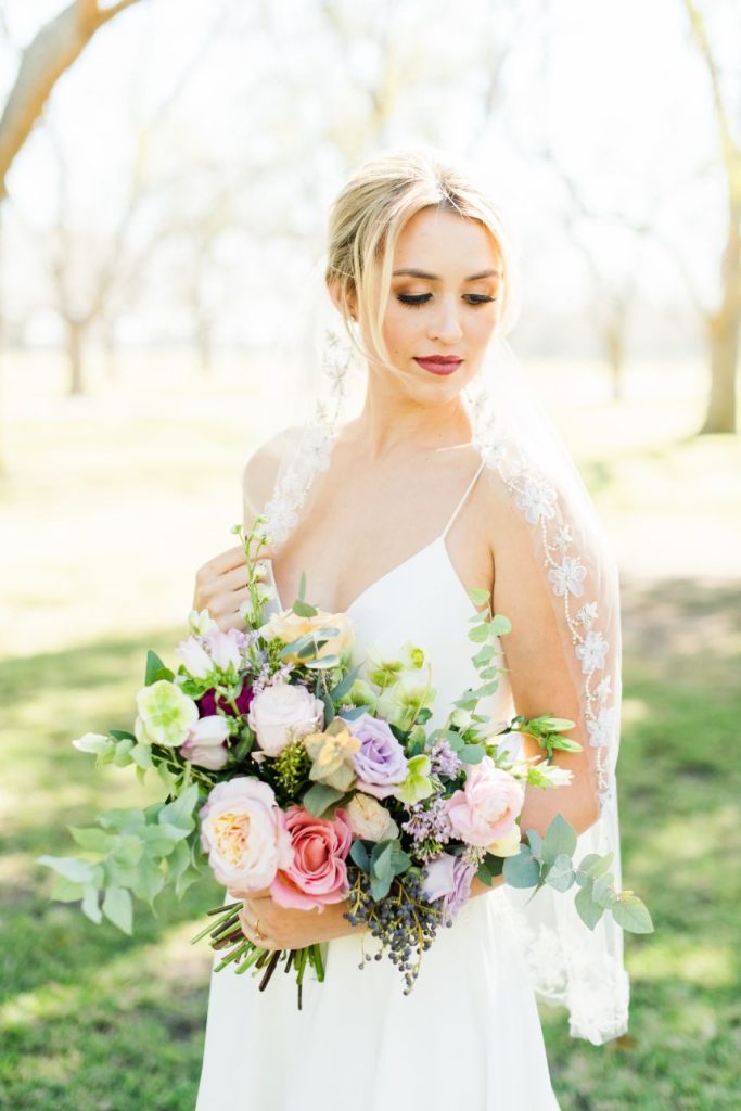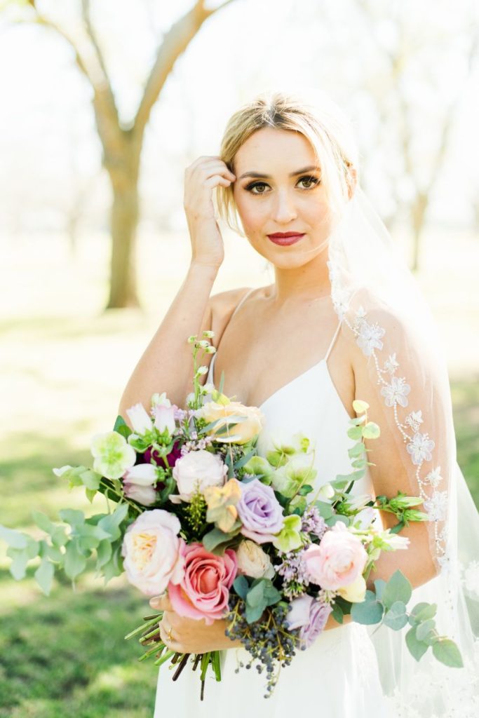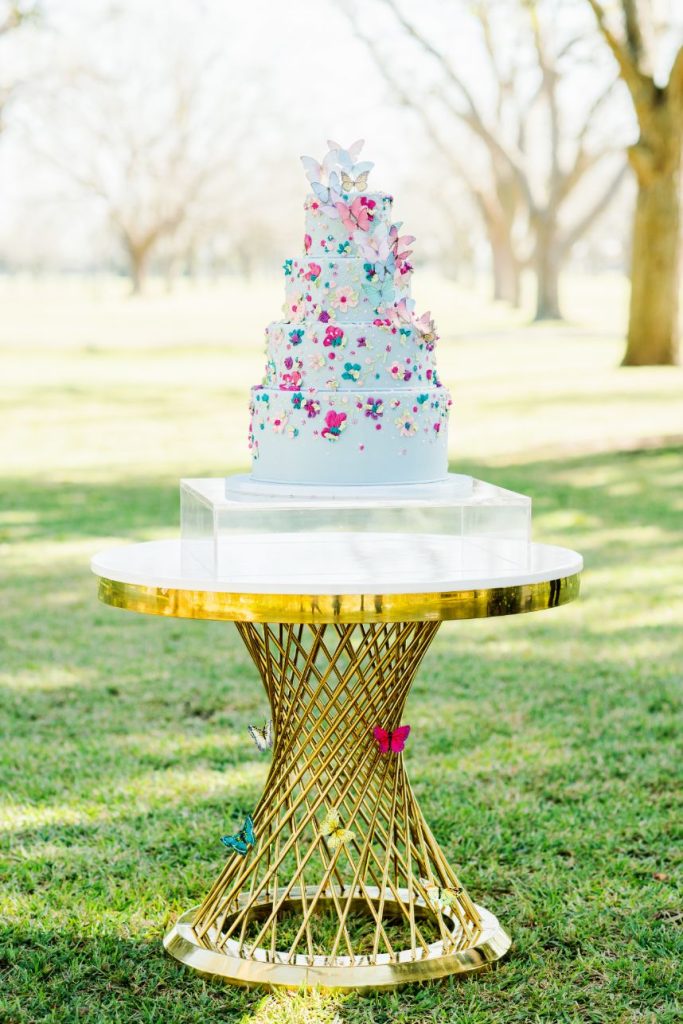 Plan the airy, outdoor affair of your dreams with the help of this dreamy butterfly garden wedding inspiration held at The Orchard at Caney Creek! Embellished with everything that makes a garden wedding great – think fun, fresh color palettes, floral patterns and textures, plus butterflies (oh my!) – we hardly know where to begin. A teal tablescape serves as the perfect backdrop for elegant gilded details as well as wild, springy floral installations by Jackie Trejo Floral Design in fun, fresh multi-colored arrangements. Ranunculus, lisianthus, hybrid delphinium and Queen Anne’s lace stand out in a crowd of unique and vibrant flowers, and we love the way they inspire the buttercream hand-piped floral design on the blue fondant base of this gorgeous creation from Cakes by Gina. This bride models stunning hair, warm bridal makeup and a bold berry lip by Adorne Artistry that all pairs perfectly with her simplistic chic gown and romantic floral-trimmed veil from Belle Âme Bridal. Talent is so obvious in Kati Hewitt Photography‘s gallery that captures the true romance of the day as well as darling details like place settings and linens among other décor from Avalon Event Rentals that set the stage for the perfect garden wedding. Read on for notes from the florist, cake baker and the hair and makeup artists about the vision behind this butterfly garden wedding inspiration and how they created the look. Cheers!