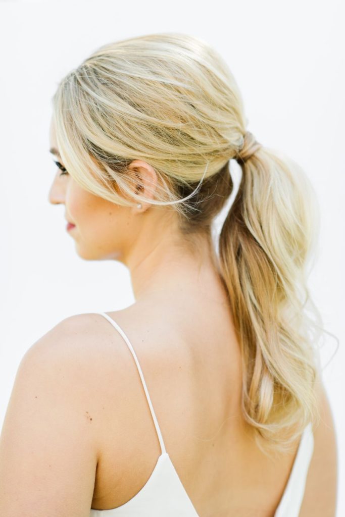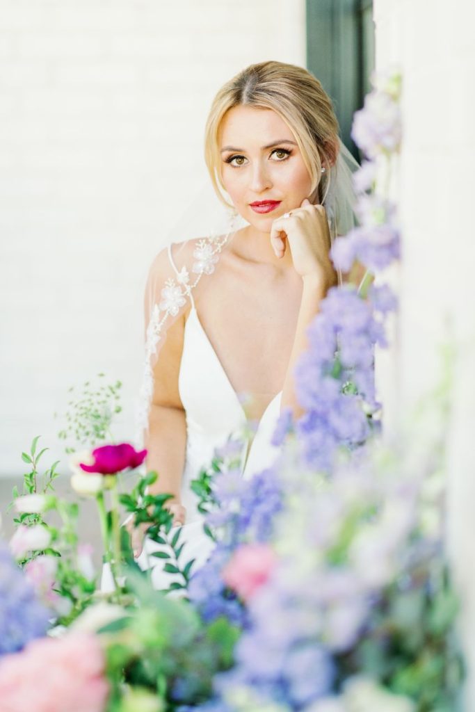 From hair and makeup artists Kristi and Jessica of Adorne Artistry: “Our model Ruby has the perfect hair for a soft and elegant low pony, and we added romantic face-framing pieces to keep the look more whimsical. We created a warm neutral color palette for her eyes with the perfect amount of lashes to make her eyes pop. We added a dewy glow to her skin and a pop of color on her lips – she’s picture-perfect for spring!”