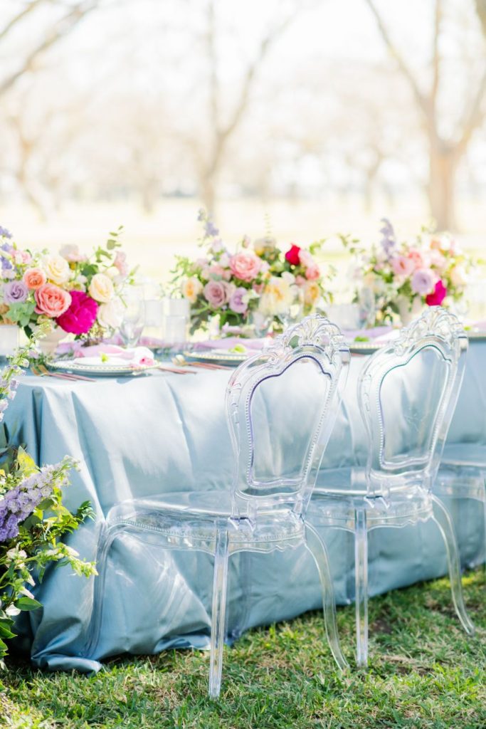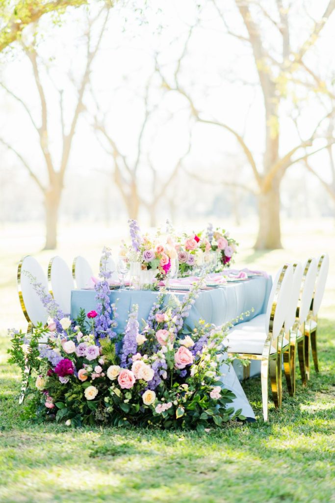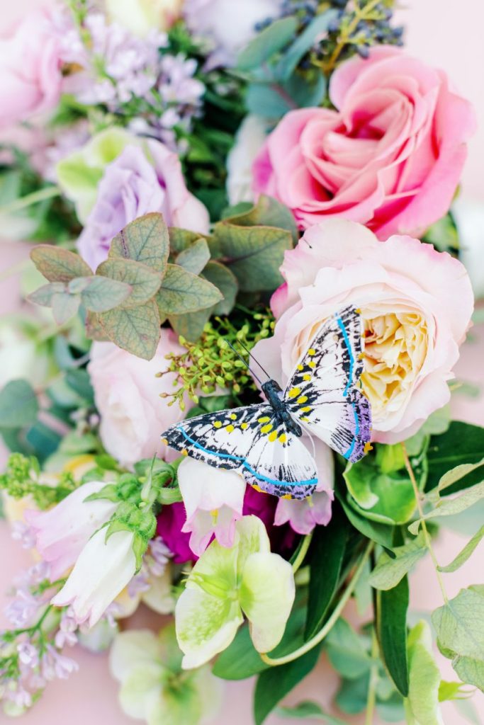 From the florist, Jackie Trejo Floral Design: “The tablescape was my absolute favorite element. It was inspired by the butterfly vine that I unexpectedly took notice of in my mother’s garden the weekend before the shoot. Now I see it all over my neighborhood and it literally makes me feel butterflies in my stomach – the perfect inspiration for this butterfly garden editorial! I used a vast variety of florals for this shoot: assorted roses, peonies, Ranunculus, lisianthus, hybrid delphinium, hellebores, Queen Anne’s lace, stuartiana, campanula and so much more!”