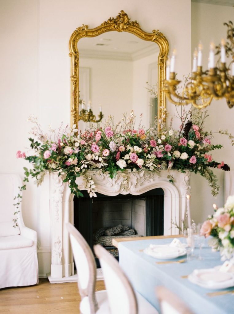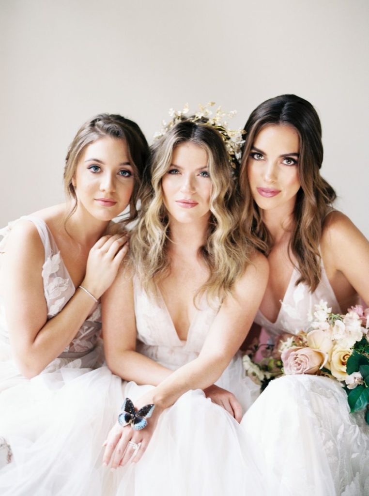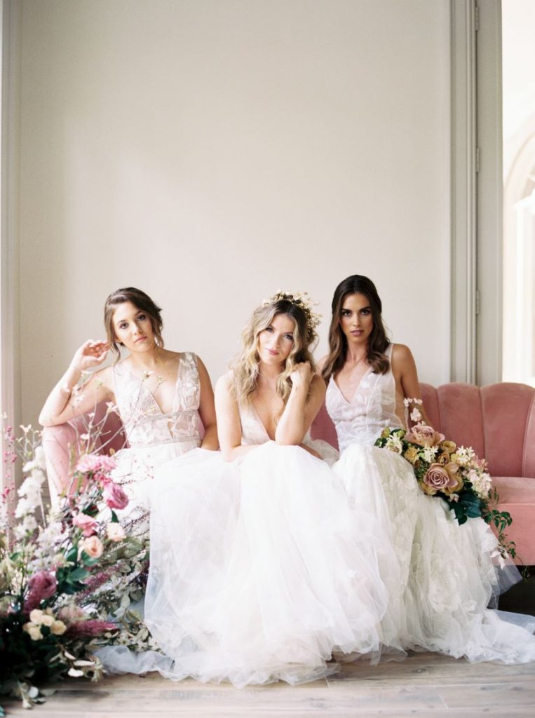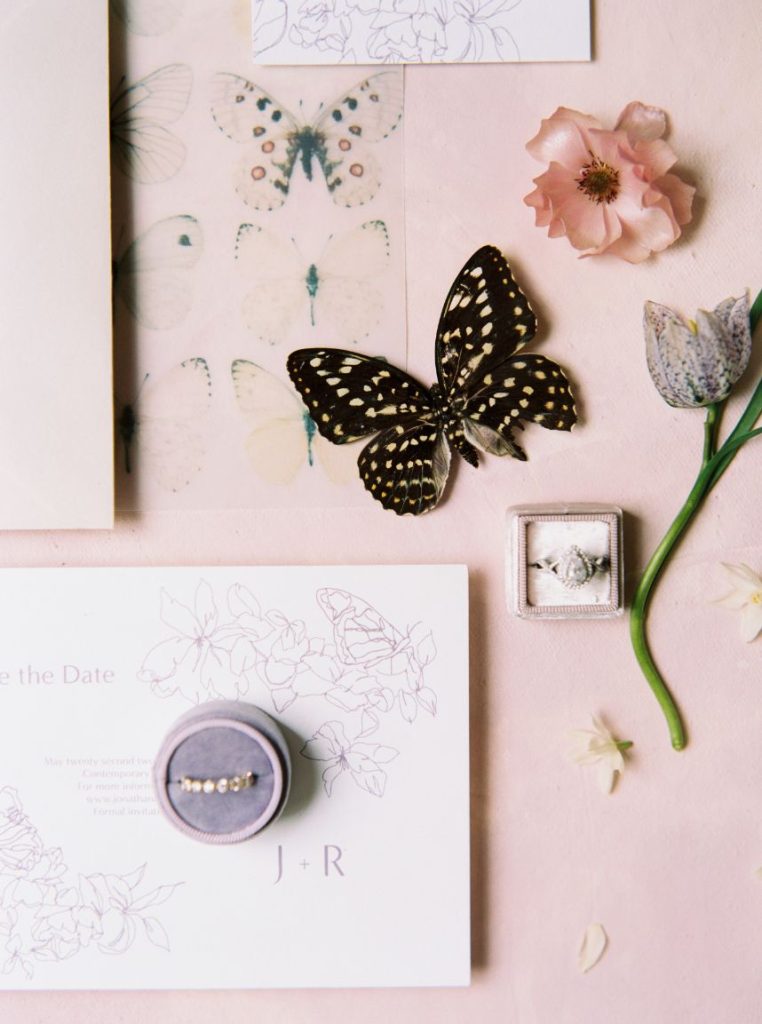 We have the BIGGEST heart eyes for this ultra-trendy transitional spring-to-summer wedding inspo! Held at the crisp white mansion wedding venue, The Creative Chateau, this wedding inspiration shoot includes all the best elements of spring and summer – think pastels and butterflies meet punchy hues with gold accents. Beautiful blooms and stunning floral centerpieces designed by Sojourn Weddings add life to the room, taking shape in a grand, playful pink installation over the fireplace hearth and dotting the the beautifully laid tablescape in a pastel palette. The textured table was topped with soft blue linens, fine white die-cut dinnerware and chic gold cutlery. Each of the lovely floral-embellished wedding dresses showcased in this gallery – all from Unbridaled – perfectly fit the romantic and whimsical vibe of this setting. Fresh and feminine bridal makeup by Etoilly Artistry, as well as the incorporation of some gorgeous and eclectic hair accessories, had the model brides ready to walk down the runway… ahem aisle. We love all of the trendy and elegant elements that make this transitional spring-to-summer butterfly wedding inspo hard to beat! Cheers!