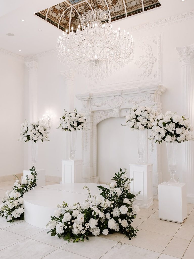 ⁠A timeless white-on-white celebration at Chateau Nouvelle with crystal chandeliers, lush blooms, and a gallery-style seating chart that turned vintage art into a moment of its own!⁠
