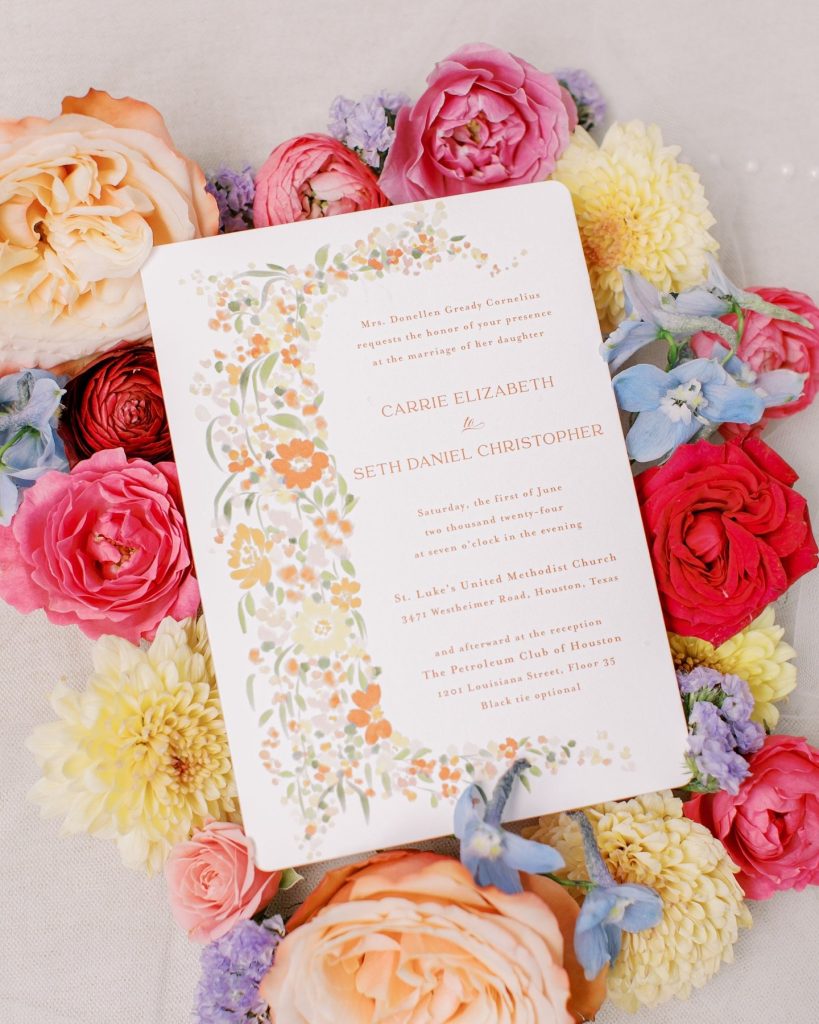 From the entire vision to the smallest detail, Moonstruck Events crafted a truly magical day with pops of color for Carrie and Seth’s June wedding! The ceremony was filled with such palpable joy, from their heartfelt vows to the beaming smiles exchanged. Later, the reception buzzed with energy as loved ones celebrated the happy couple, sharing laughter and creating new memories. The day’s precious moments were also captured beautifully on film by Atilano Wedding Productions, creating a lasting visual story of their love and commitment. It’s wonderful how both the vibrant atmosphere and the artistry of the videography will allow Carrie and Seth to relive their special celebration for years to come. Toasting to a beautiful beginning, Carrie and Seth’s vibrant June wedding will forever be etched in our hearts.