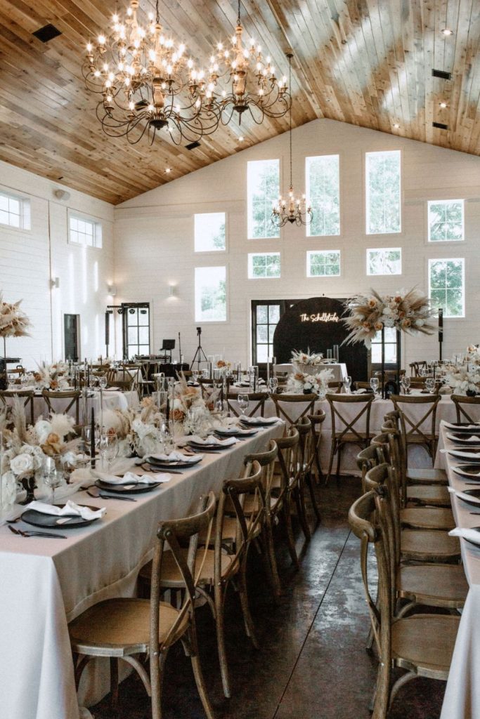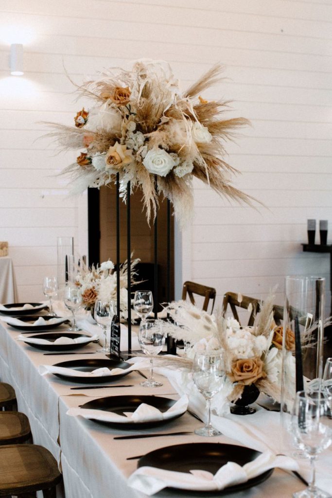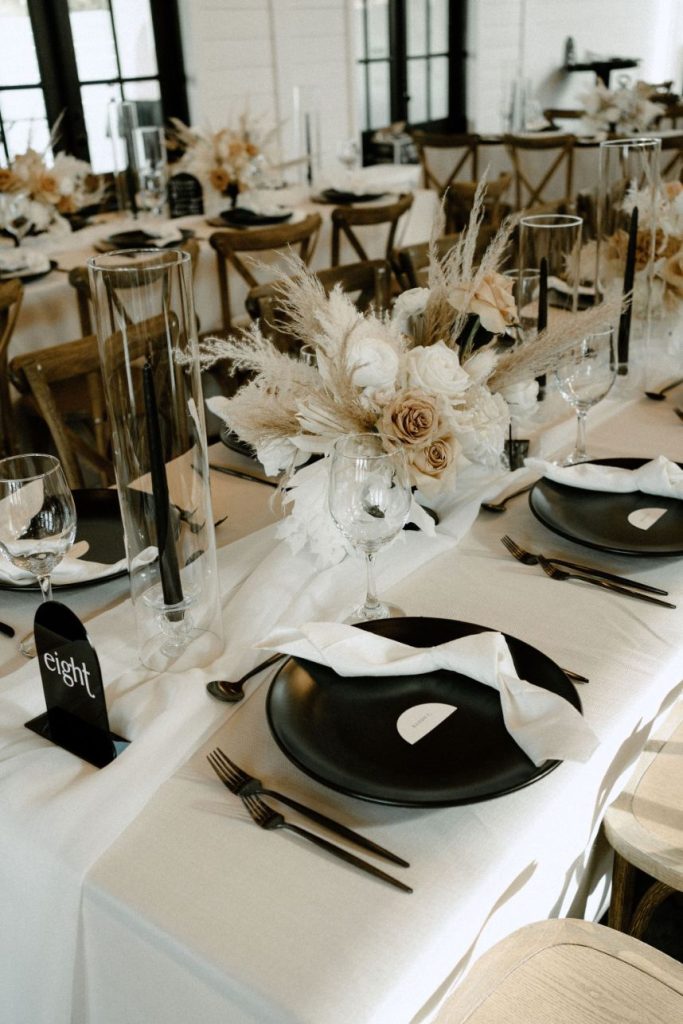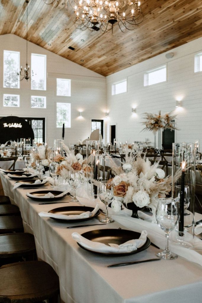 Catherine and Sven’s modern boho wedding is everything the couple dreamed of and more! Catherine, who looked beautiful with a hair and makeup look from Bespoken Beauty, felt all the love as she walked down the aisle to her man. As Catherine walked down the aisle, she carried a photograph of her late father, who had passed away two short years before the wedding. Catherine said, ‘When I saw Sven, I knew that I made the best decision of my life and that my dad would be so proud of who I’ve become and who I chose as my life partner.” We know for sure that our bride Catherine paid close attention to detail while planning her big day. Long tables draped in white table cloths by Hopeful Events + Design, adorned with the finest cutlery from Decor by Dulce. and pampas grass arrangements from Cali and Bloom create a modernized boho look. In addition, custom signage in black with white text gave the entire reception space that modern edge. The couple enjoyed their special day with friends and family while taking photos in Liny’s Booth. We are so excited to share all the modern boho details in Catherine and Sven’s big day. Keep scrolling to see more!