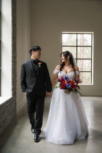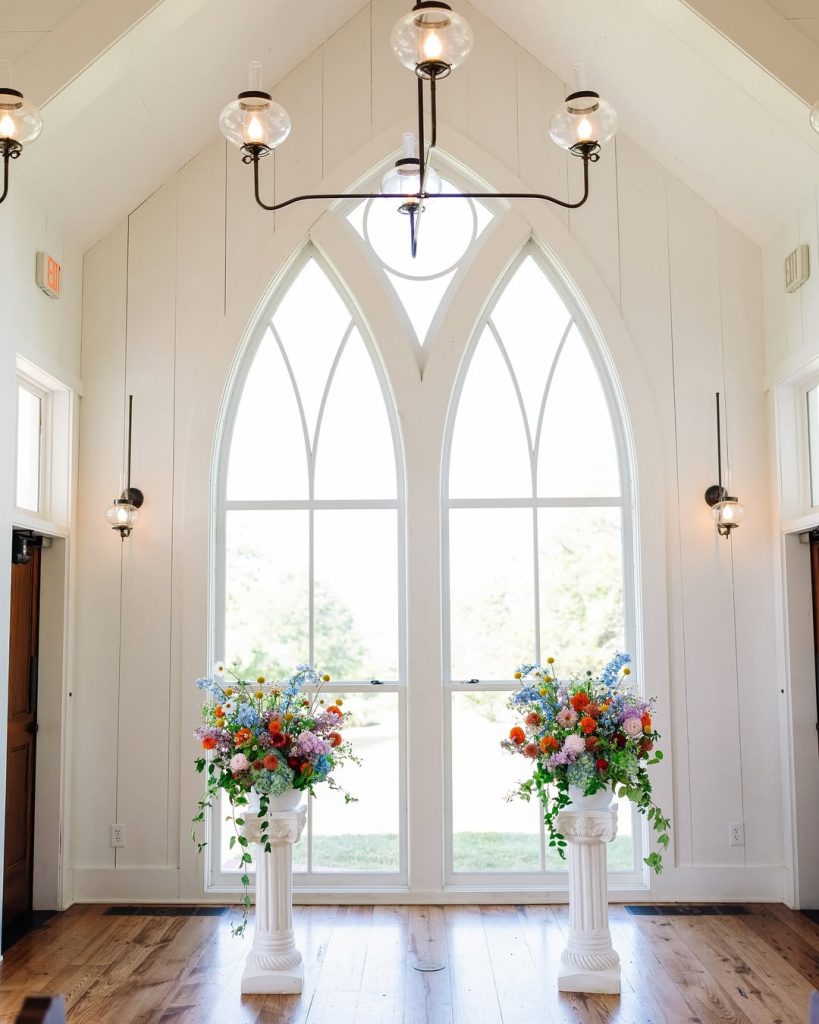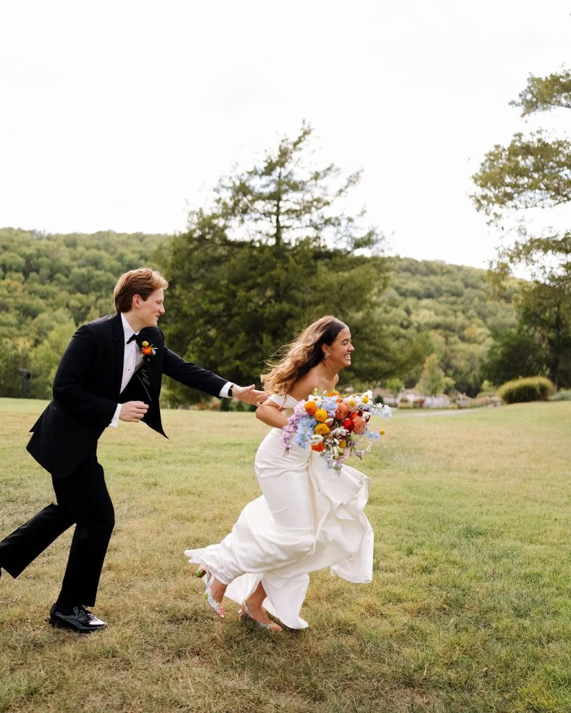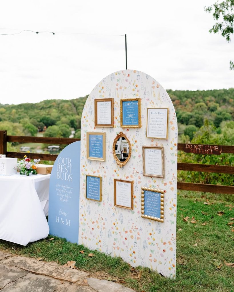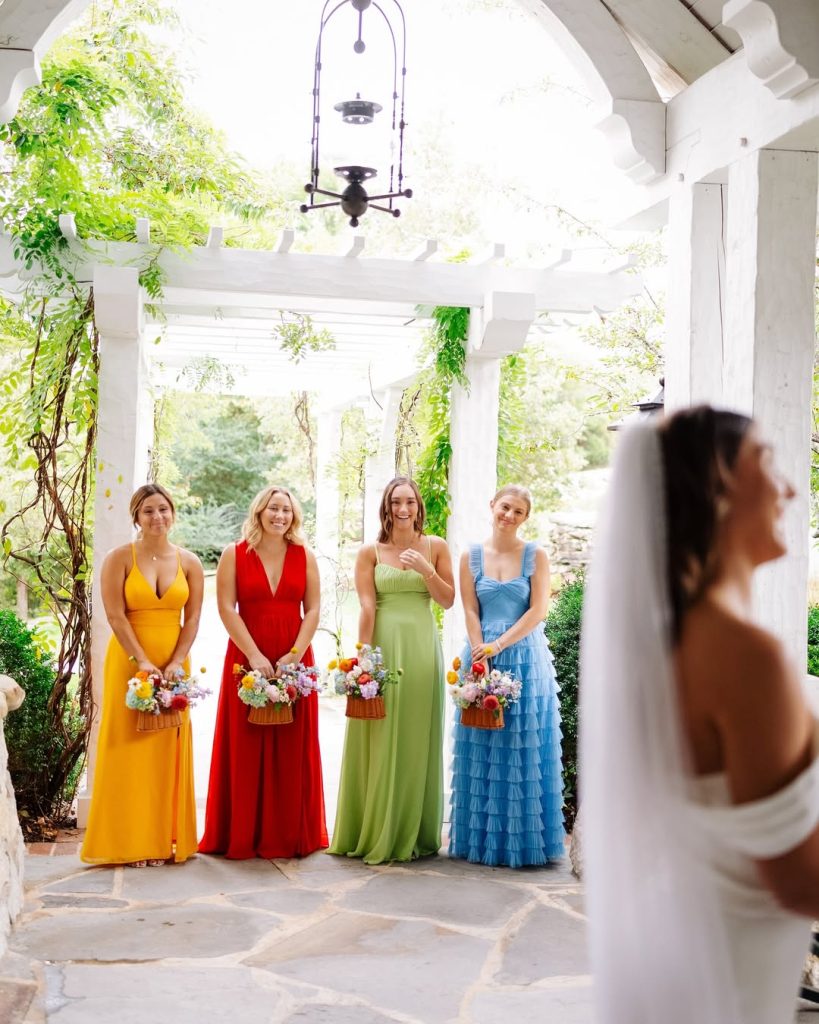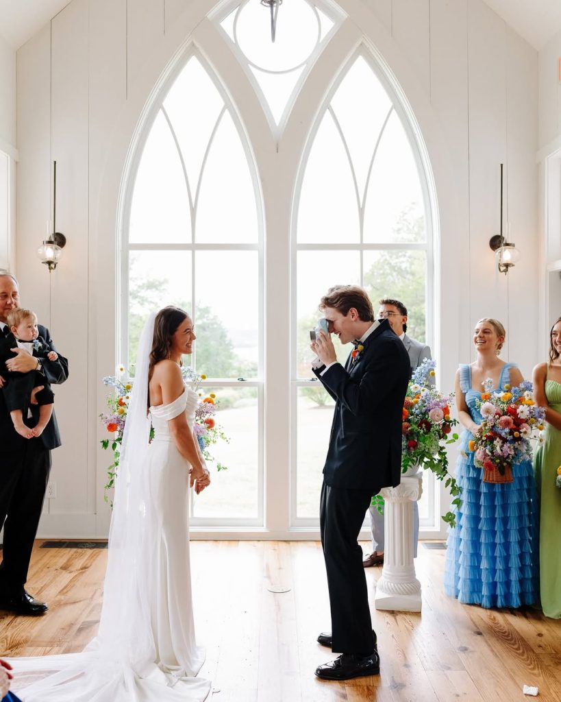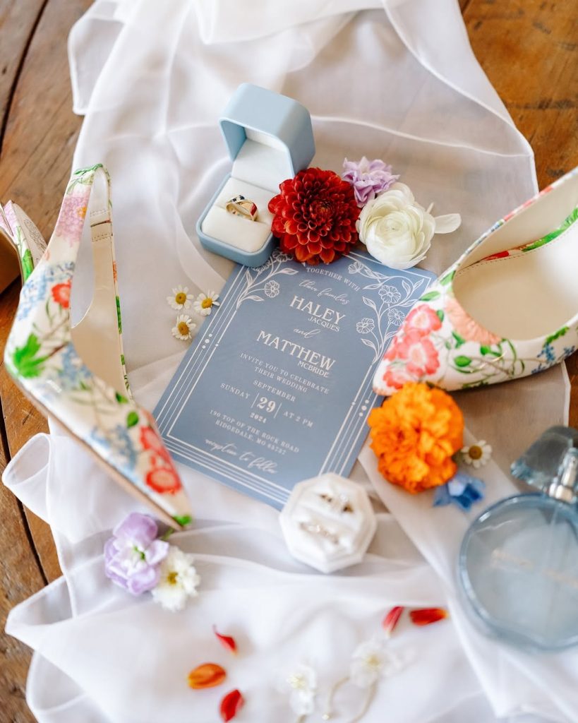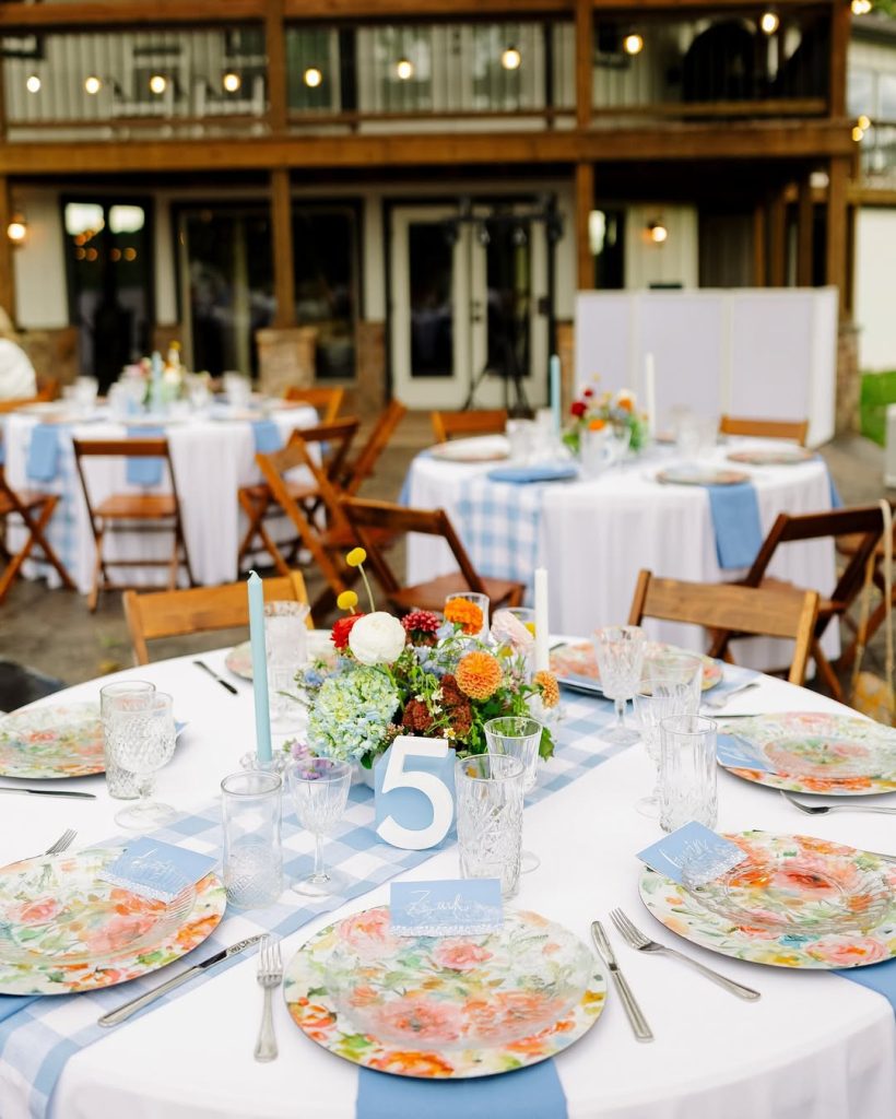 Haley and Matt said “I Do” at the picturesque Big Cedar Lodge Garden Chapel, where the crisp white backdrop beautifully highlighted their vibrant bridesmaid dresses and bold, colorful florals. The celebration continued with an outdoor reception featuring blue gingham table runners, floral plates, and glowing tapered candles—all set beneath twinkling string lights for the dreamiest night under the stars. Cheers to forever!