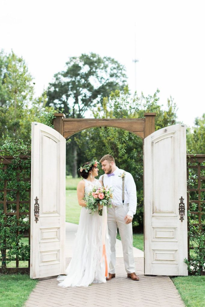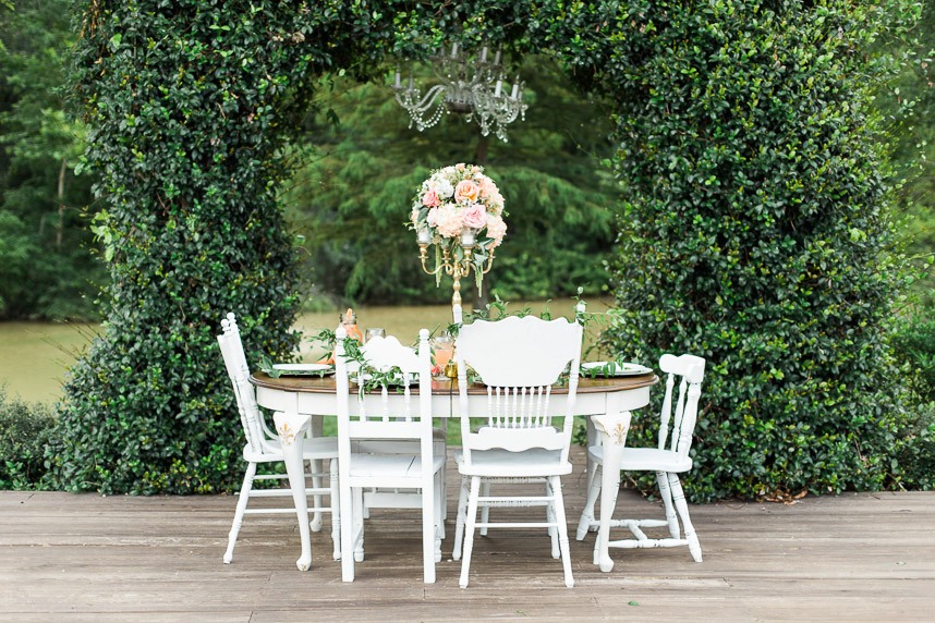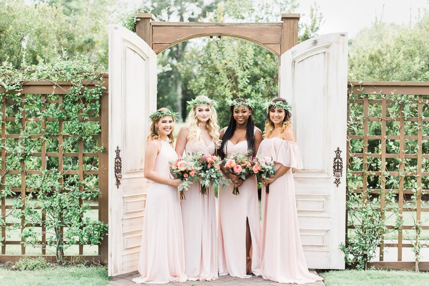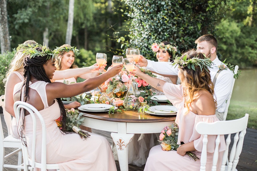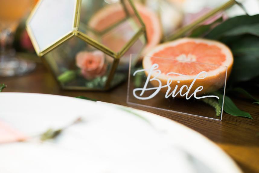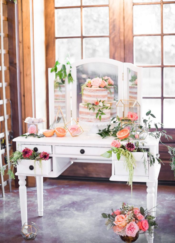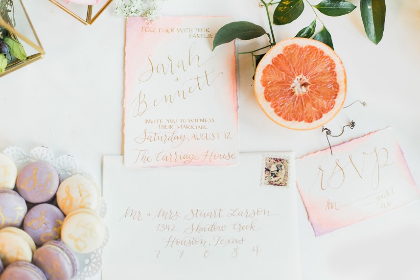 This charming citrus-inspired styled shoot is everything a lighthearted springtime celebration should be: totally fresh and fun! Planned by Feather Forest Weddings and captured by Kailyn Daneé Photography at Conroe’s Carriage House, the talented team of vendors used grapefruits as the decor and inspiration around which they built the entire styled shoot! Bright and cheerful hues of peach and coral popped against blush-toned neutrals and touches of gold, while vibrant florals with fruity blooms adorned everything from the head table to the vintage vanity holding the cake, and even worked as flower crowns for the bride and her maids! Hand-painted macarons, metallic stationery and place settings calligraphed on clear backdrops added modern whimsy to the farmhouse-style table, with mismatched white-washed chairs giving the scene a quaint feel. Makeup by Addie gave the ladies bold lashes and smoky eyes for a little drama to offset the light and airy aesthetic. We’re loving everything about this charming shoot. Cheers to spring!