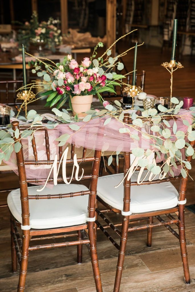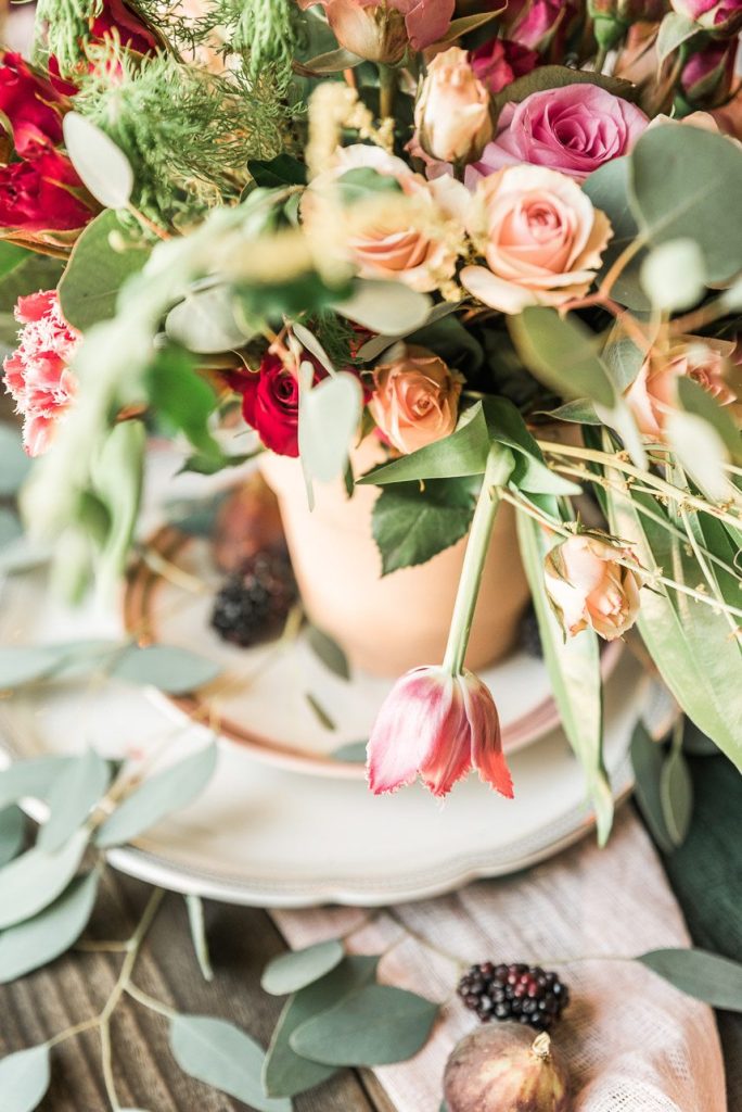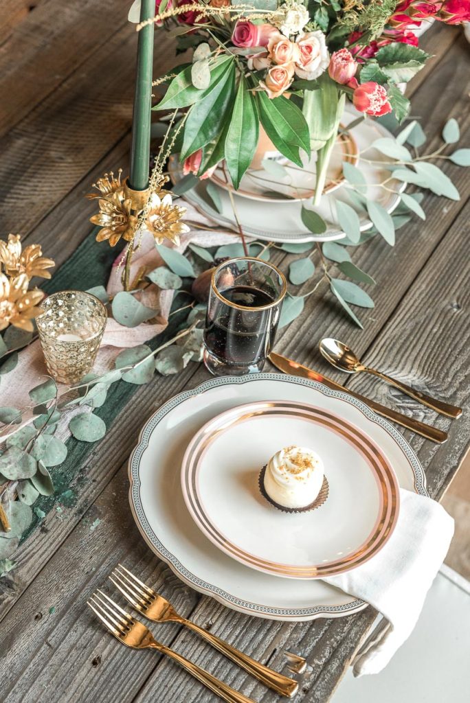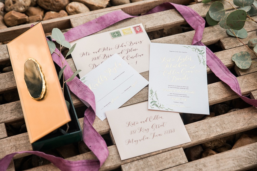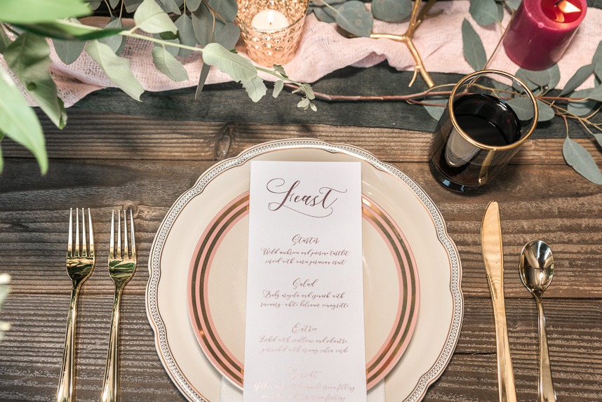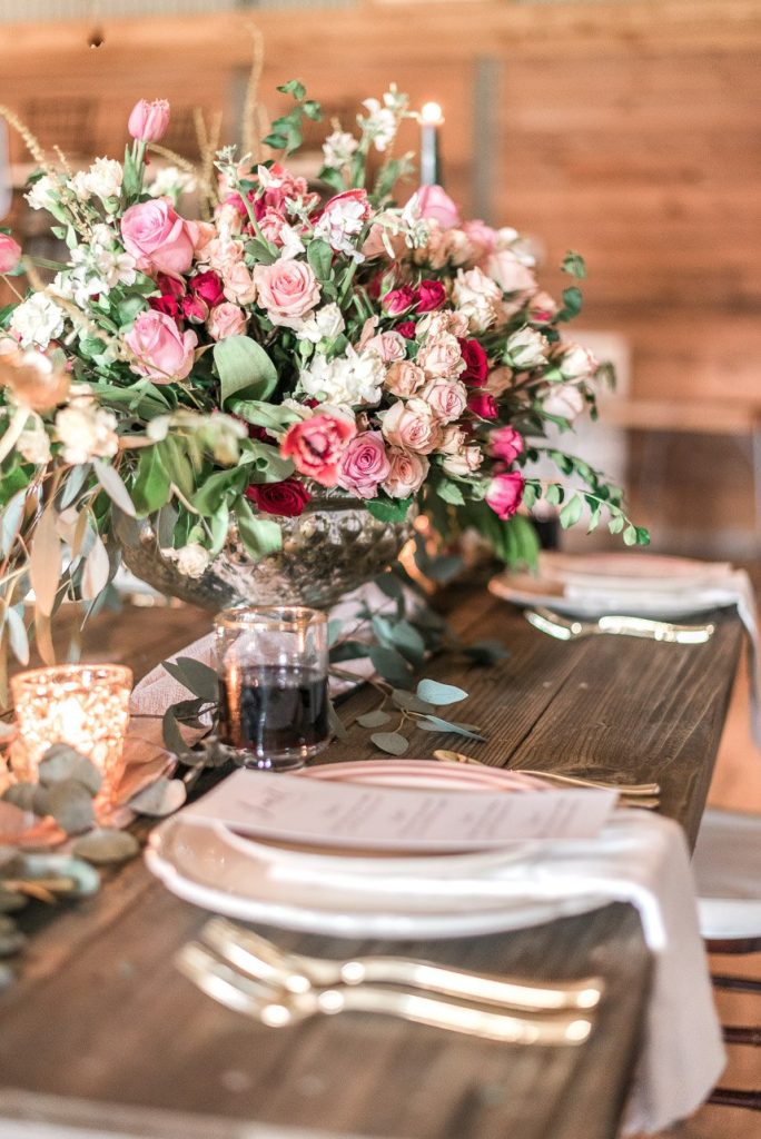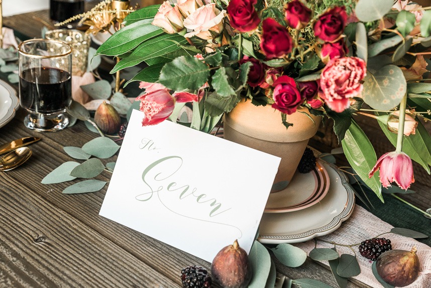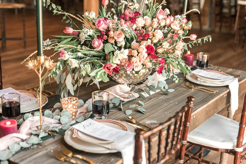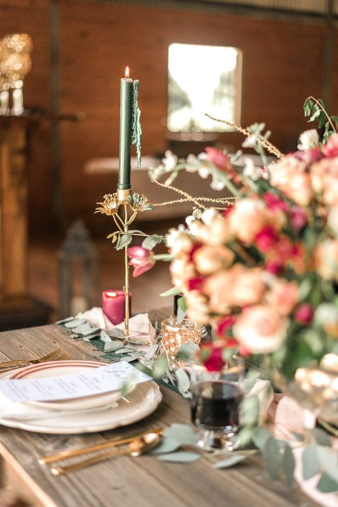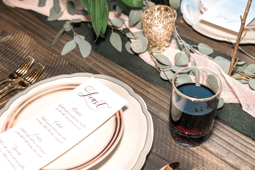 With deep romantic colors and metallic details, Paper Tie Affair added the perfect touch to this charming rustic styled shoot at Moffitt Oaks, a barn venue just north of Houston. Mixing neutrals to set the tone, Kenzie from Paper Tie Affair combined shades of white and cream with deep mauve calligraphy and gold foil accents on the invitation suite. The same hues were carried over to the rustic tablescape, where cream, white and gold-rimmed plates awaited the feast outlined in Paper Tie Affair‘s calligraphed menu cards. The table boasts an oh-so-impressive centerpiece overflowing with greenery and a freeform bouquet of romantic red and pink roses, a dramatic but charming offset to the venue and table’s masculine rustic feel. Antique glass, metallic gold vases and gold utensils bring a sense of refinement to the table, while loose berries and table cards against terracotta pottery add an organic, laid-back touch that all works in tandem to create a table that’s inviting, yet elegant! Everything about this bold, pretty tablescape caught our eye and we just had to share! Cheers!