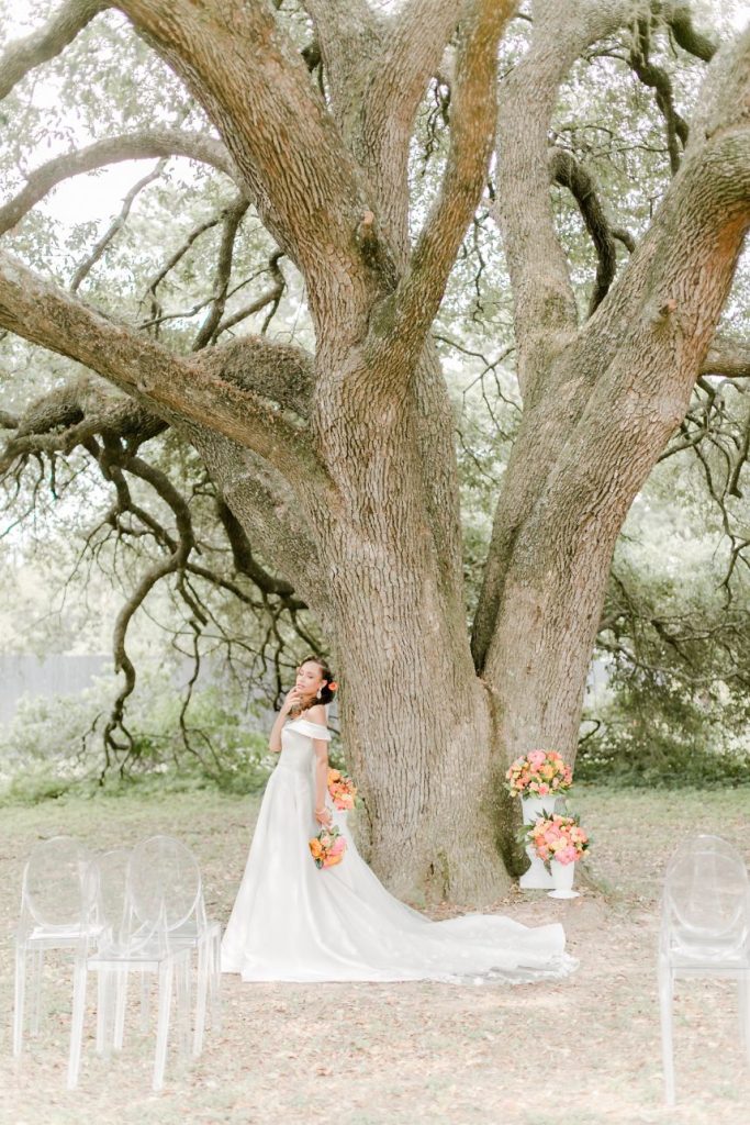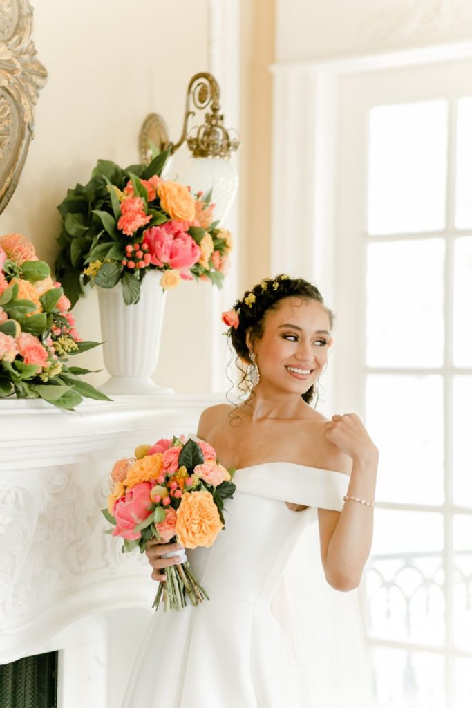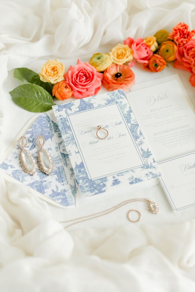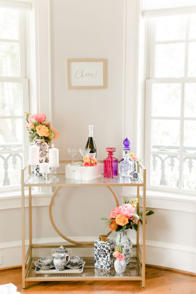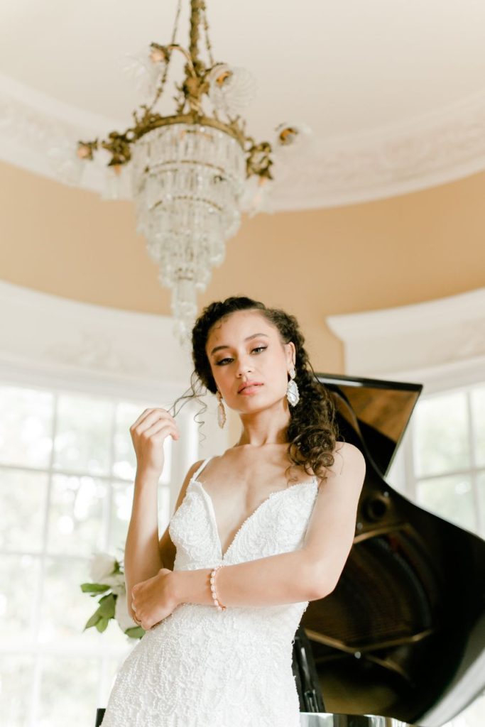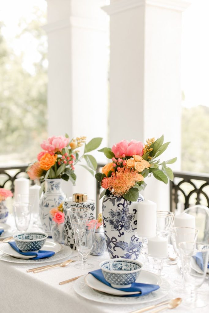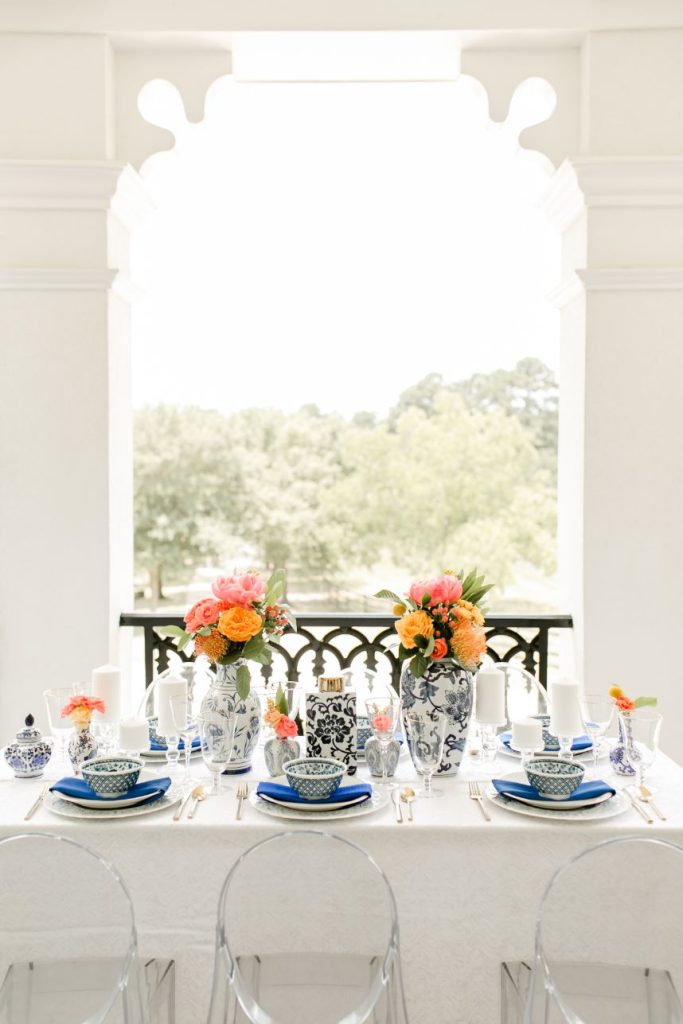 Moody and timeless art deco style wedding elements come together with bright and cheery Chinoiserie decor in stunning scenes styled by Whimsical Events! Clean lines, bold contrasts and geometric shapes characterize true roaring, art deco style, and we love how this first coordinating gown from Brickhouse Bridal with all its romantic charm and intricate beading looks alongside the piano and styled retro bar cart. Punchy and bright floral design by Whimsical Events as well makes everything come to life and feel so fresh and playful. Acrylic ghost chairs from LBL Event Rentals add the perfect modern touch to this outdoor patio scene and make this classic and sophisticated blue and white tableware feel more chic than stuffy! This model pulls off both looks so well, but we’re partial to her simple and chic second gown from Brickhouse Bridal featuring an off-the-shoulder neckline and the sweetest coral blooms pinned throughout her hair. Though the two styles are different in many ways, we think these cheery Chinoiserie-inspired and moody art deco style wedding scenes look stunningly stylish when side-by-side! Keep scrolling to see for yourself. Cheers!