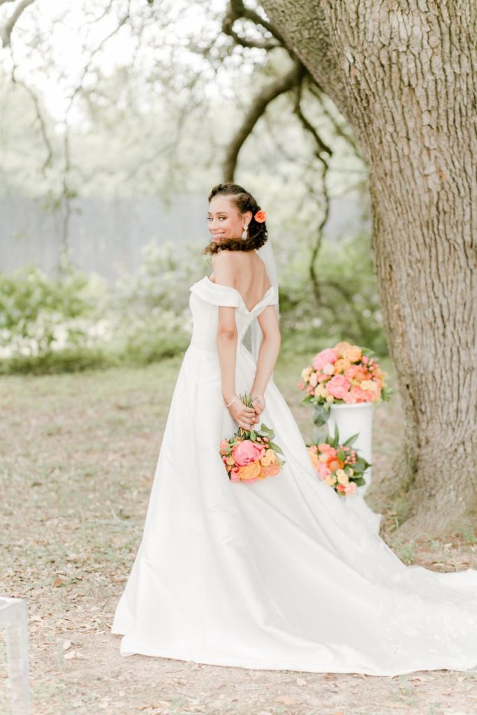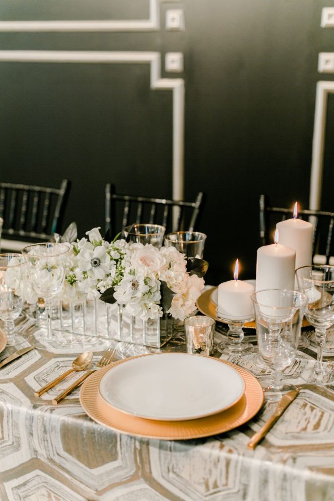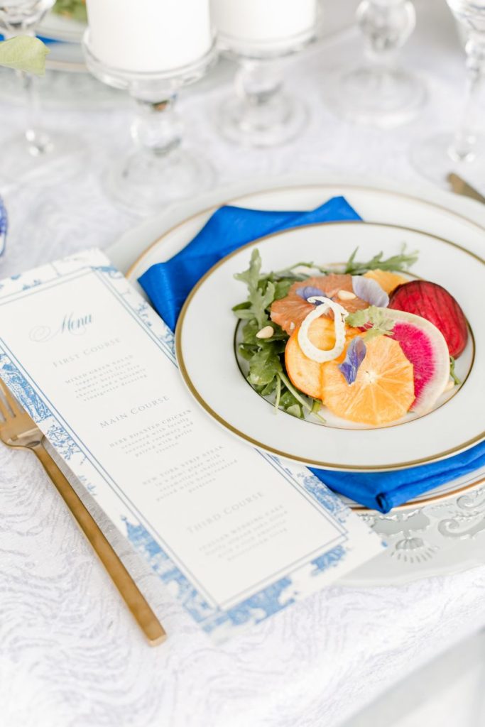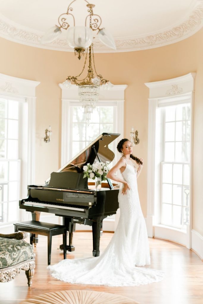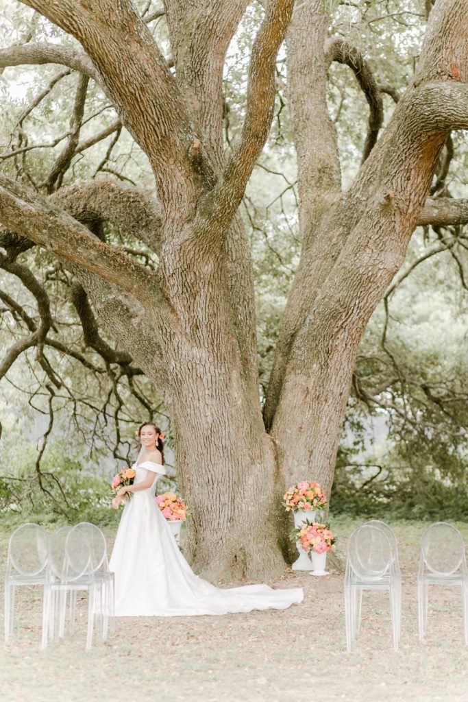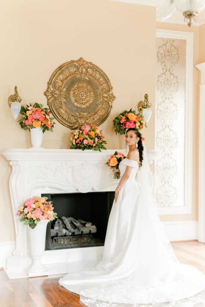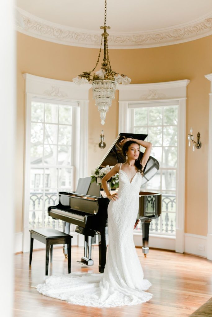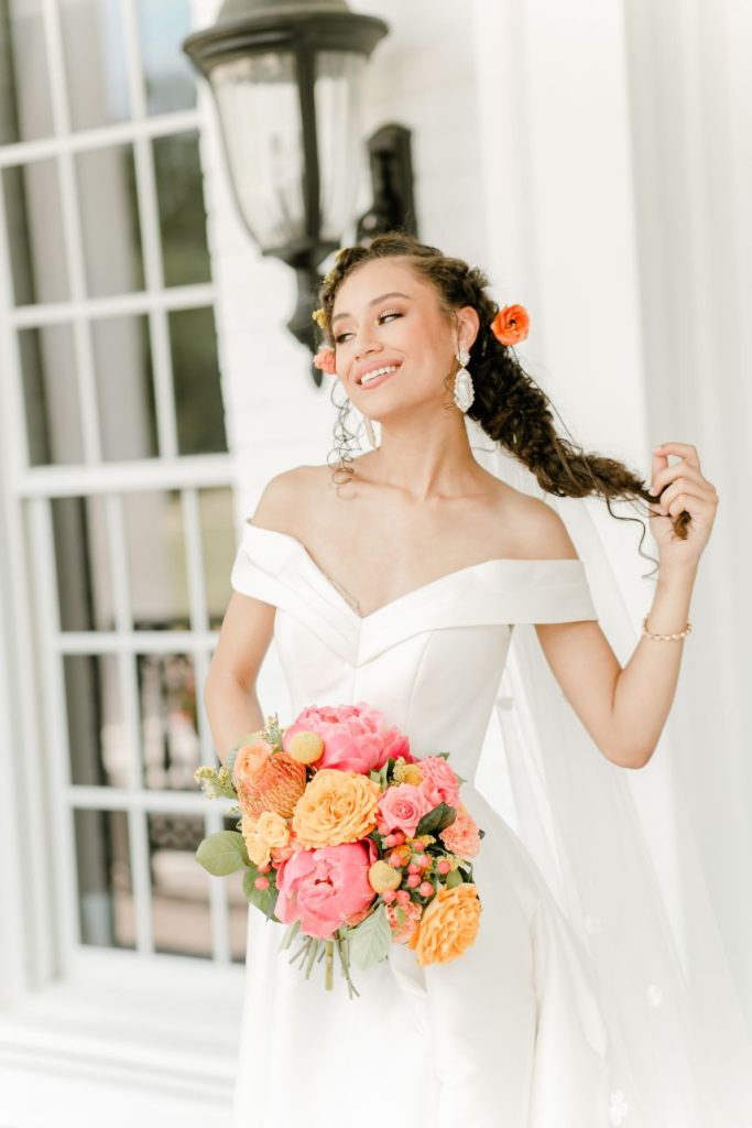 Moody and timeless art deco style wedding elements come together with bright and cheery Chinoiserie decor in stunning scenes styled by Whimsical Events! Clean lines, bold contrasts and geometric shapes characterize true roaring, art deco style, and we love how this first coordinating gown from Brickhouse Bridal with all its romantic charm and intricate beading looks alongside the piano and styled retro bar cart. Punchy and bright floral design by Whimsical Events as well makes everything come to life and feel so fresh and playful. Acrylic ghost chairs from LBL Event Rentals add the perfect modern touch to this outdoor patio scene and make this classic and sophisticated blue and white tableware feel more chic than stuffy! This model pulls off both looks so well, but we’re partial to her simple and chic second gown from Brickhouse Bridal featuring an off-the-shoulder neckline and the sweetest coral blooms pinned throughout her hair. Though the two styles are different in many ways, we think these cheery Chinoiserie-inspired and moody art deco style wedding scenes look stunningly stylish when side-by-side! Keep scrolling to see for yourself. Cheers!