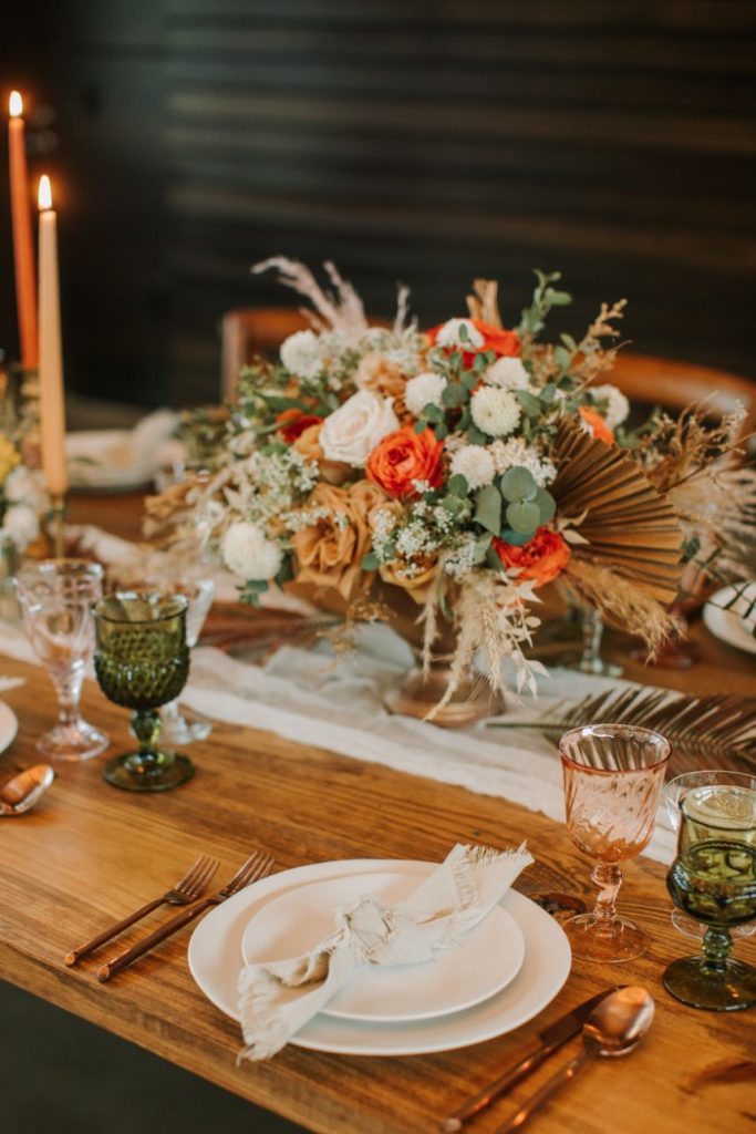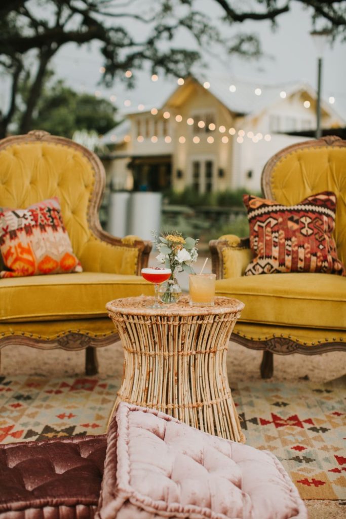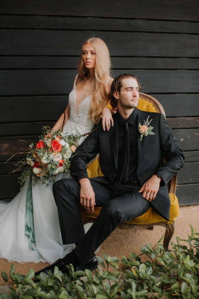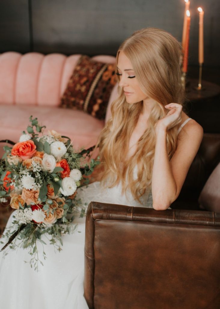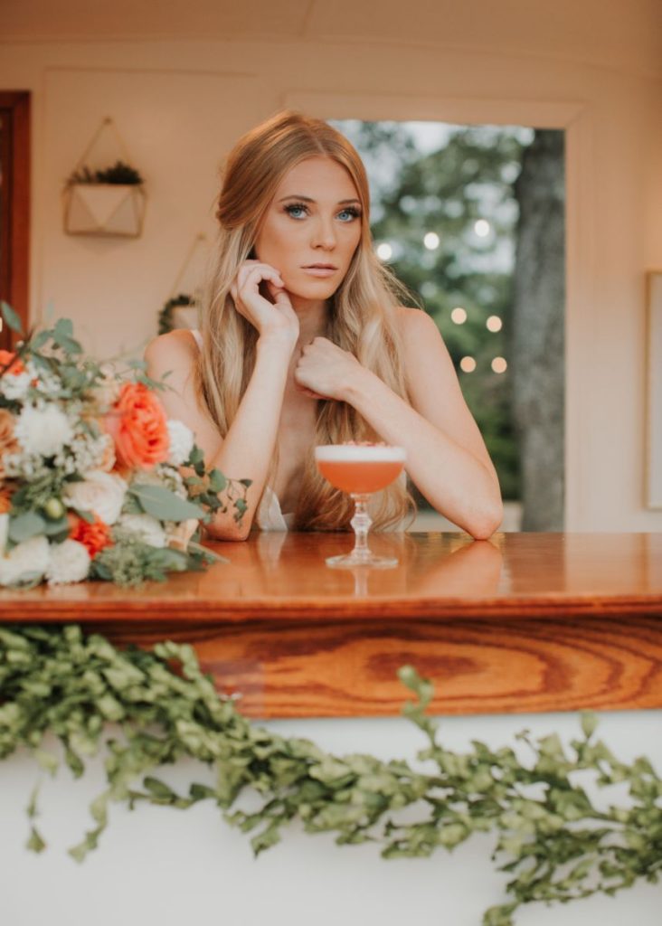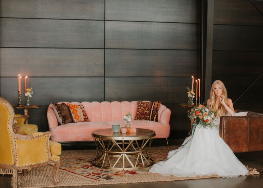 We are positive this citrus style wedding inspo will brighten your day! Planned by Chancey Charm Weddings, this styled shoot brings an eclectic, urban space to life with a collection of plants, vibrant colors and fun patterns for a playful, yet laid back environment. Bold and bright invitations carefully handcrafted by Paper Tie Affair have us obsessed, and cocktails and furniture in warm, citrus shades make this scene even more welcoming. This model bride looks absolutely stunning with loose waves and a natural makeup look by Hey Lovely. Her gown from Brickhouse Bridal, with its deep V-neck and flowing A-line skirt, is absolutely fitting for this modern setting. Every peachy detail was expertly captured by Tiny Mum Photography – take a peek below! This citrusy sweet wedding inspiration is one of our favorites, and we are sure it will make your list too. Cheers!