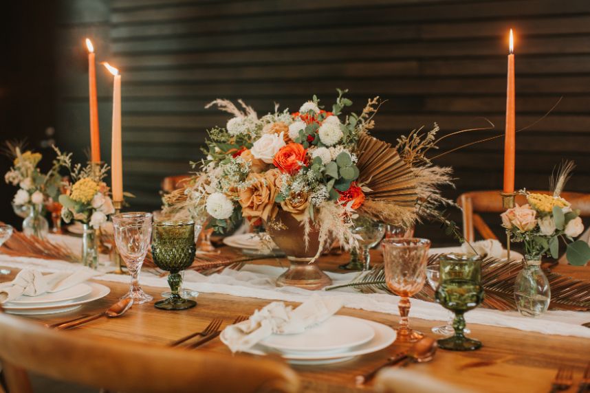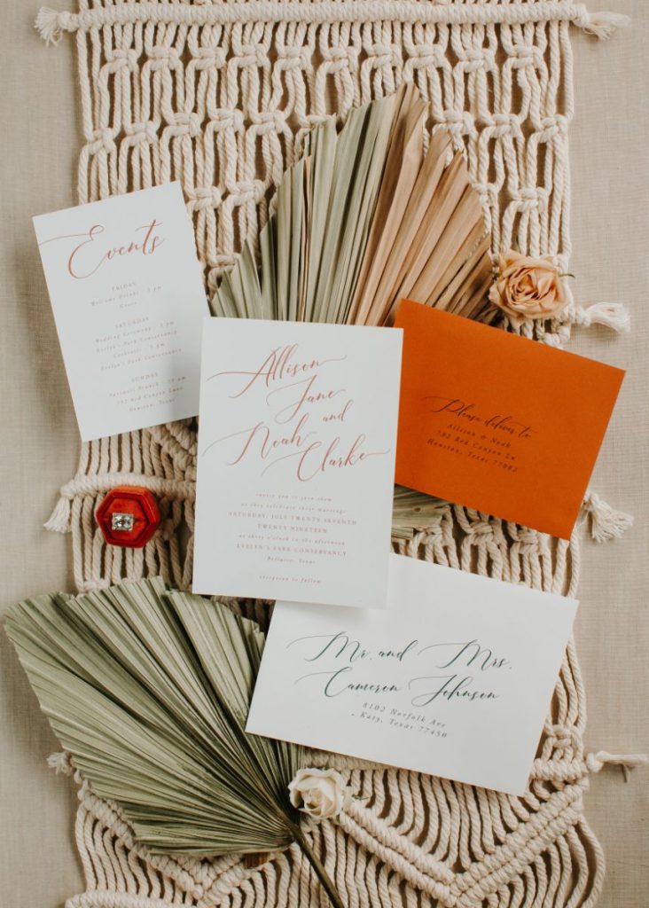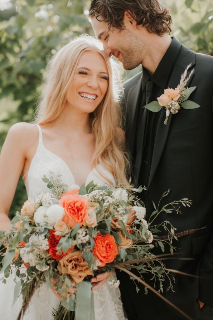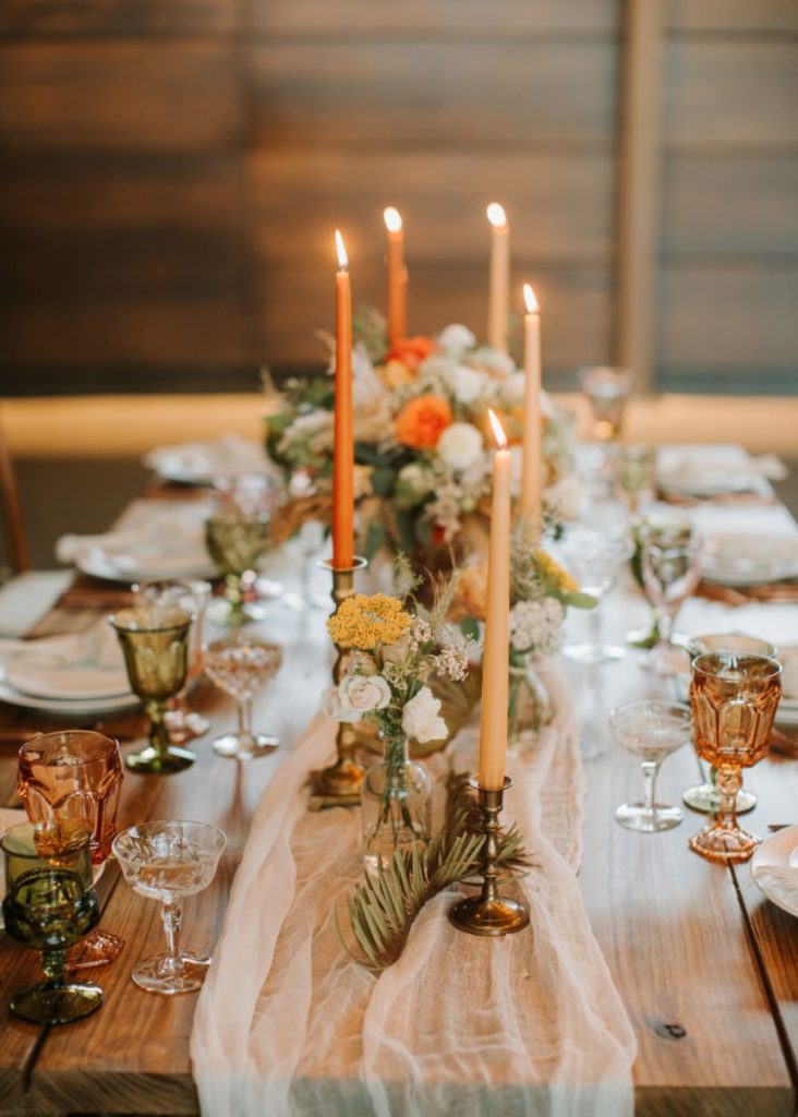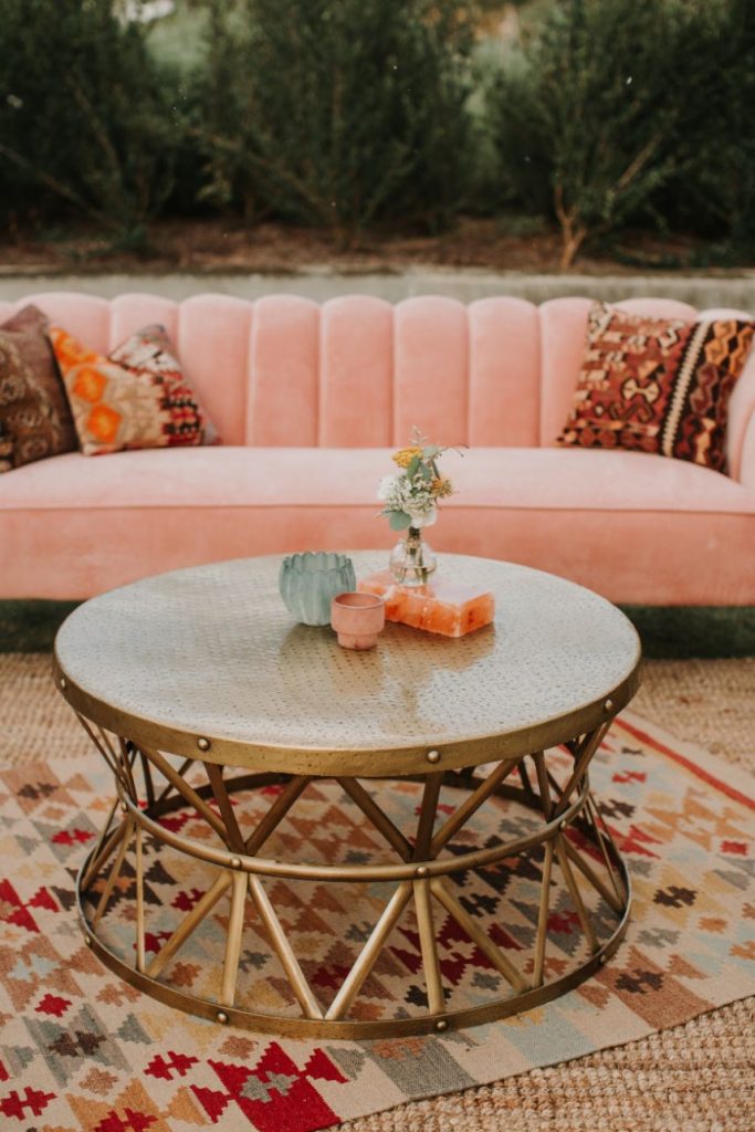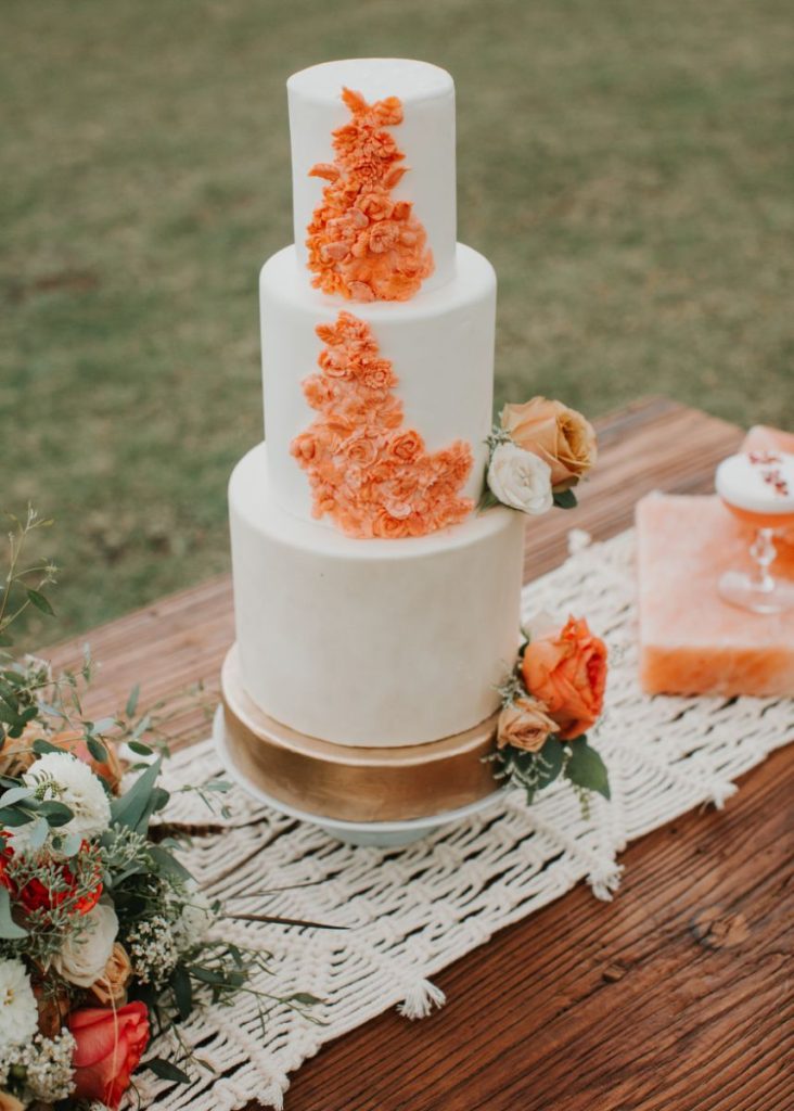 We are positive this citrus style wedding inspo will brighten your day! Planned by Chancey Charm Weddings, this styled shoot brings an eclectic, urban space to life with a collection of plants, vibrant colors and fun patterns for a playful, yet laid back environment. Bold and bright invitations carefully handcrafted by Paper Tie Affair have us obsessed, and cocktails and furniture in warm, citrus shades make this scene even more welcoming. This model bride looks absolutely stunning with loose waves and a natural makeup look by Hey Lovely. Her gown from Brickhouse Bridal, with its deep V-neck and flowing A-line skirt, is absolutely fitting for this modern setting. Every peachy detail was expertly captured by Tiny Mum Photography – take a peek below! This citrusy sweet wedding inspiration is one of our favorites, and we are sure it will make your list too. Cheers!