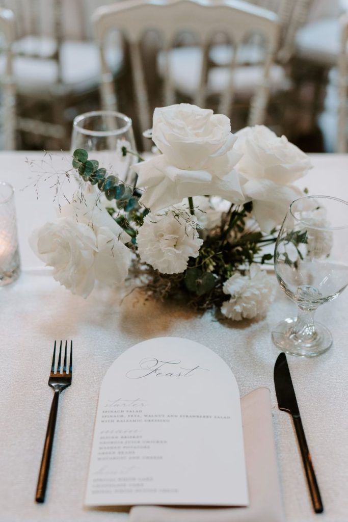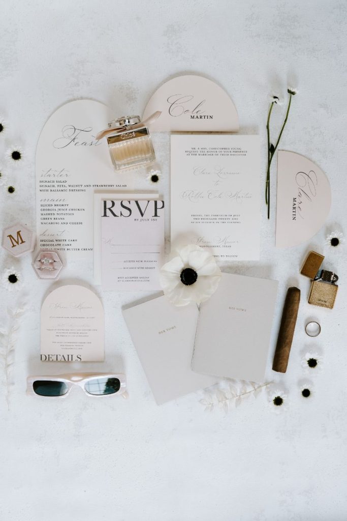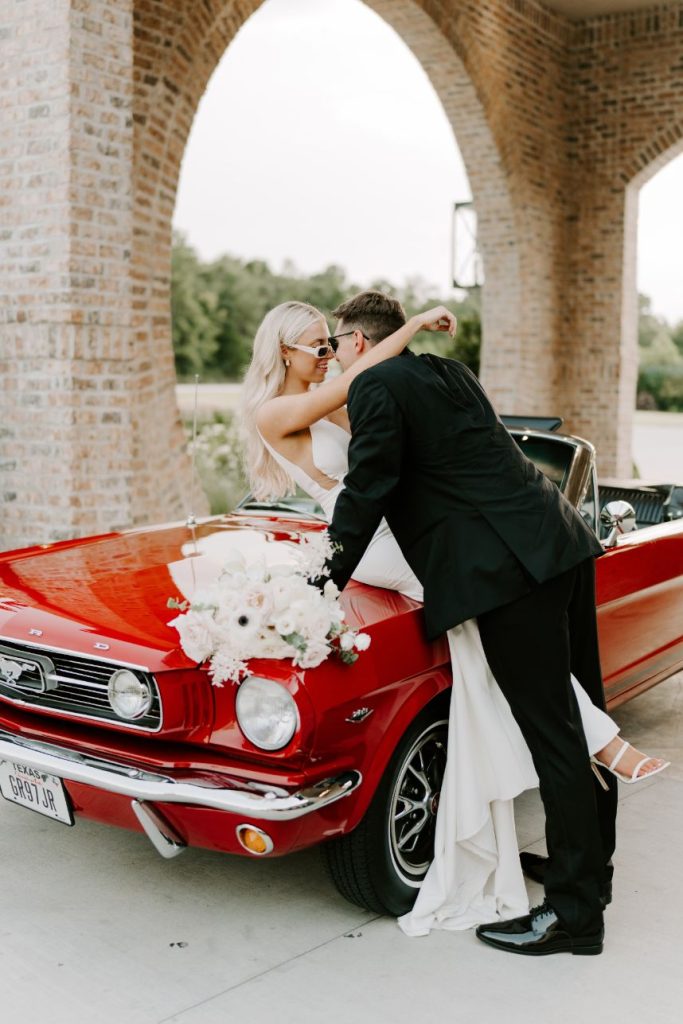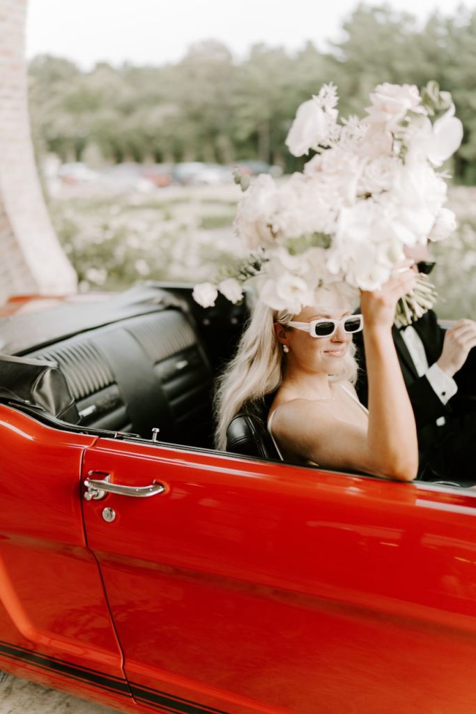 Clare and Cole kept their wedding modern and chic with a black and white color palette. Their big day entailed great food, beautiful decor, friends, family, and love for the adorable couple. Clare described their ceremony as “truly magical.” Clare went on to say, “Cole and I both felt a strong sense of peace as we stood together surrounded by the people who love us the most.” We can understand why Clare and Cole’s ceremony felt like pure magic, surrounded by cathedral-like windows letting an abundance of natural light into the space and a beautiful white bloom floral display. After the ceremony, Emily Figurelli Photography captured wedding portraits of the adorable couple. Clare, who took our breath away with a beautiful look from Etoilly Artistry, and her beau showed us how much of a power couple they are in each shot. Including climbing inside their bright red getaway convertible with sunglasses and a cigar for some iconic photos. Clare and Cole danced the night away with guests. The couple said, “I don’t think we stopped smiling! We had the absolute best time celebrating with our favorite people!” Congrats to the new Mr. and Mrs. Martin!