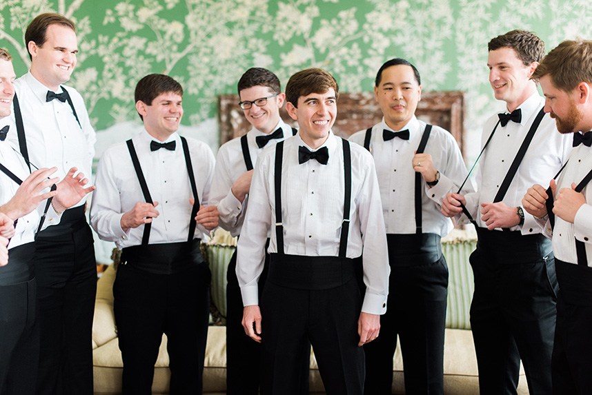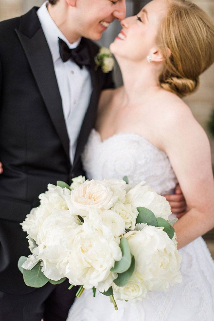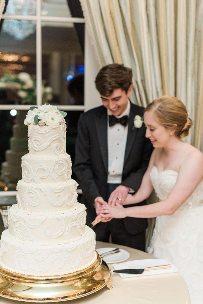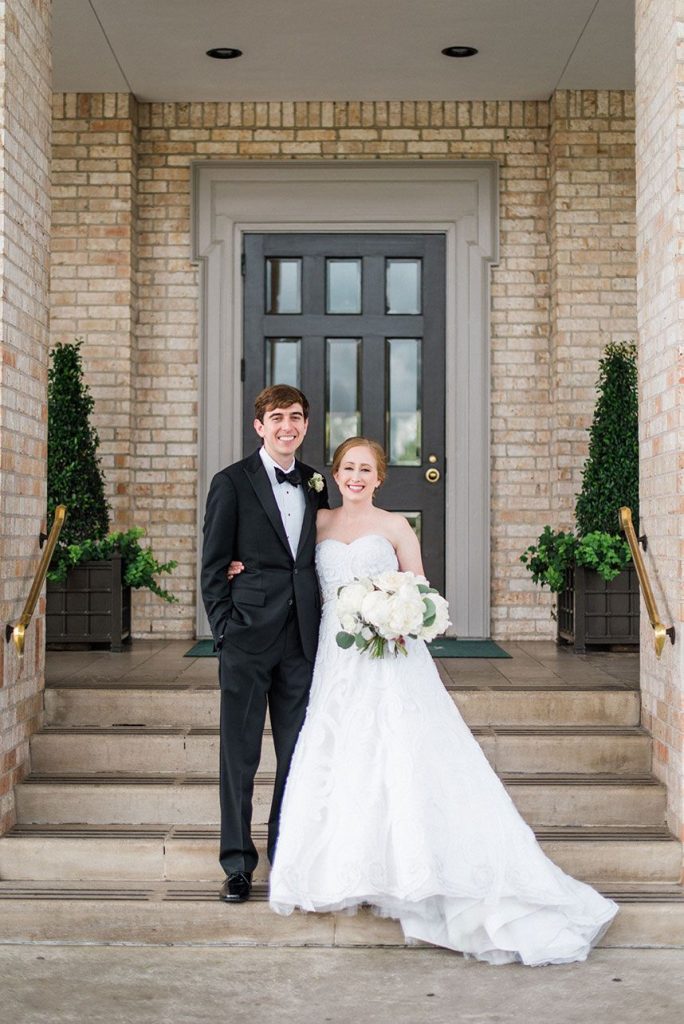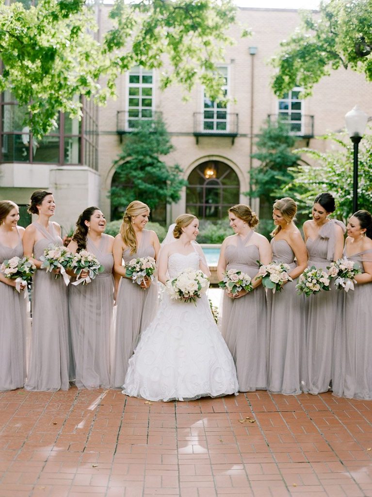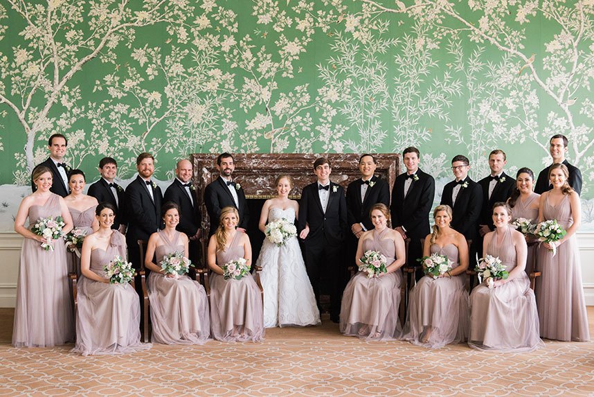 Selecting a clean, neutral color palette and the sprawling River Oaks Country Club as their backdrop, Katie and John’s elegant country club wedding felt nothing short of a classically regal fête. Josh & Dana Fernandez Photography captured all of the evening’s happy moments both indoors and out, taking advantage of the country club’s European architecture and the ballroom’s natural light. Florals from Maxit Flower Design kept with a feminine yet minimal color scheme in bouquets and arrangements of ivory, white and blush hued roses, peonies and hydrangeas. True to the overall aesthetic, Hey Lovely Makeup made the bride look stunning as she walked down the aisle in a gorgeous lace overlay strapless Oscar de la Renta dress from Joan Pillow Bridal, while her maids looked prim and pretty in taupe colored gowns in varying necklines.