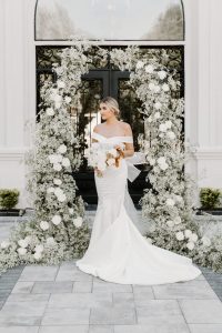 From Lillie Jane Designs: “The overall goal was to bring the garden inside, tying the outdoor garden ceremony into the indoor reception. I developed Courtney and Richard’s design using the venue’s lush green hedges as our base. We wanted to make the floral look as if it would naturally bloom out of this already stunning backdrop. For the ceremony, we made the focus a soft gold modern rectangular arch covered in mixed mauve roses and pops of greenery across the top. We paired the arch with two oversized urn arrangements of the same blend of floral to add a touch of charm that you might find in the garden or yard of a glamorous mansion or castle. Lastly, we lined the aisle with lots of ivory petals that looked as if they could’ve blown there on their own. For cocktail hour, we had to transform the naked trellis patio of the pavilion into a garden of its own. We lined the ceiling of the trellis with fresh greenery, hid the poles with romantic ivory drapes, hung crystal chandeliers, and added a classy champagne lounge. We also moved the urn arrangements from the ceremony to the champagne lounge. It was the perfect, elegant transition to our indoor garden reception.”