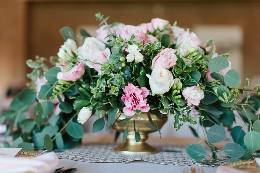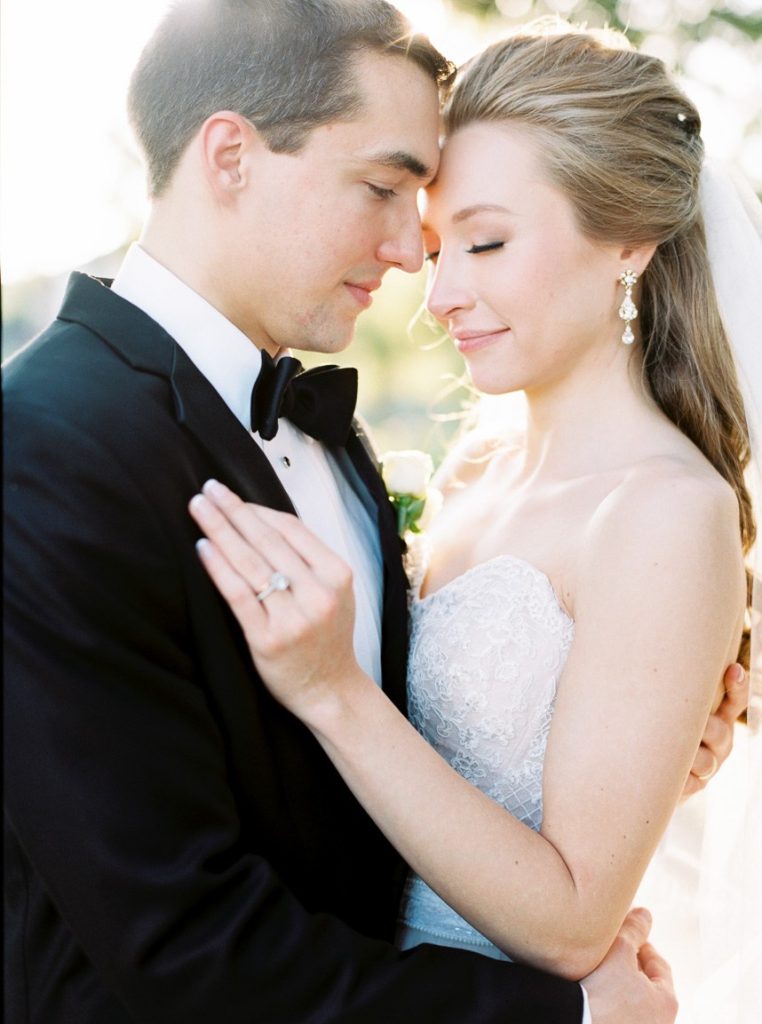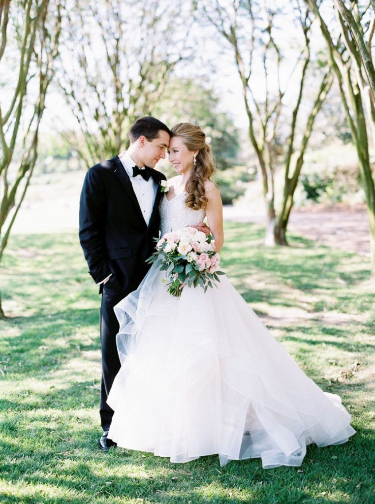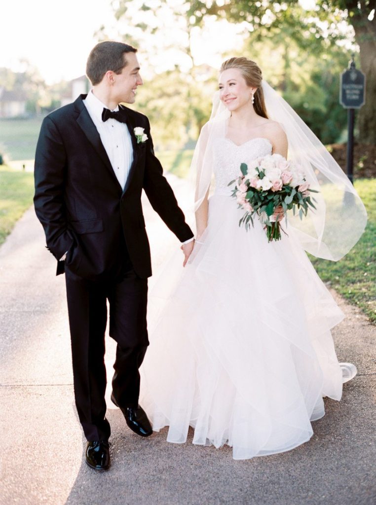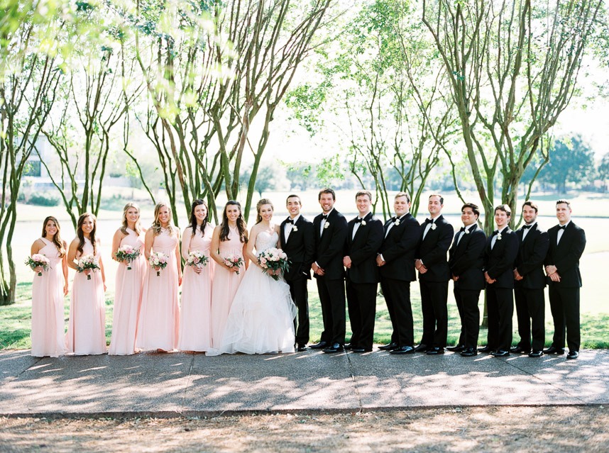 High school sweethearts Alex and William were married in a classic romantic country club wedding seven years after they first began dating. Their beautiful late spring wedding incorporated traditional elements like a minimalist invitation suite with classic typeface, light pink roses and bridesmaids’ gowns to match, with the groomsmen in classic black tuxes. Such a sharp look for a handsome group of guys! As the sun set on Royal Oaks Country Club and flooded the venue with warm natural light, Alex and William’s friends and family looked on as they celebrated the start of their forever together. Billowing floral arrangements pouring out of antique vases accented the tables with greenery and pops of darker pink. Alex looked stunning in her princess-style ball gown with an elegant half-updo and timeless makeup by Adorne Artistry. Roses in white and baby pink sat atop the traditional three-tiered cake from Cakes by Gina – a perfectly sweet way to end the day! Cheers to the Whaleys!