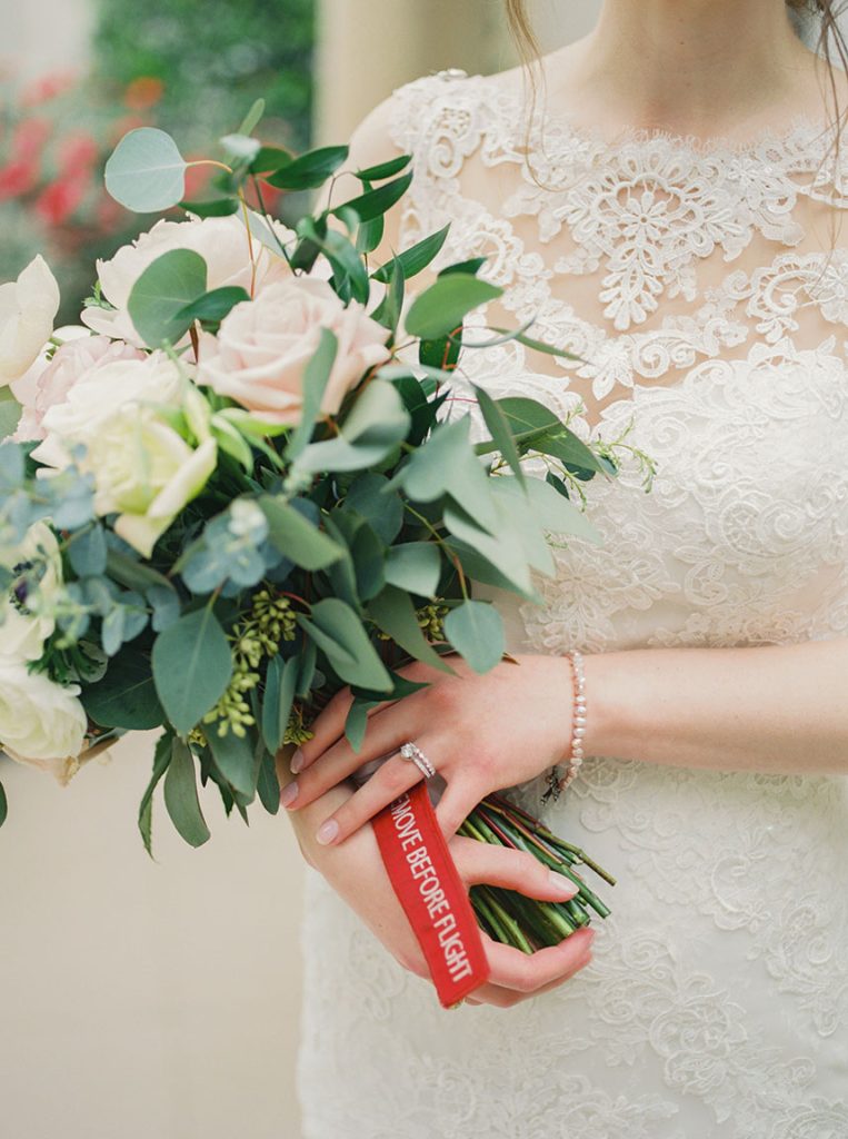 From the bride: “Our favorite detail of the wedding was the red ‘Remove Before Flight’ tags. I put them on both mine and my sister’s bouquets in honor of our dad. To my dad, ‘Remove Before Flight’ was a way of acknowledging when you leave this earth, all you take is your faith. He gave the tags to people when he shared his story, and to my sister and I, it’s a tangible reminder of everything he did for us and taught us.”
